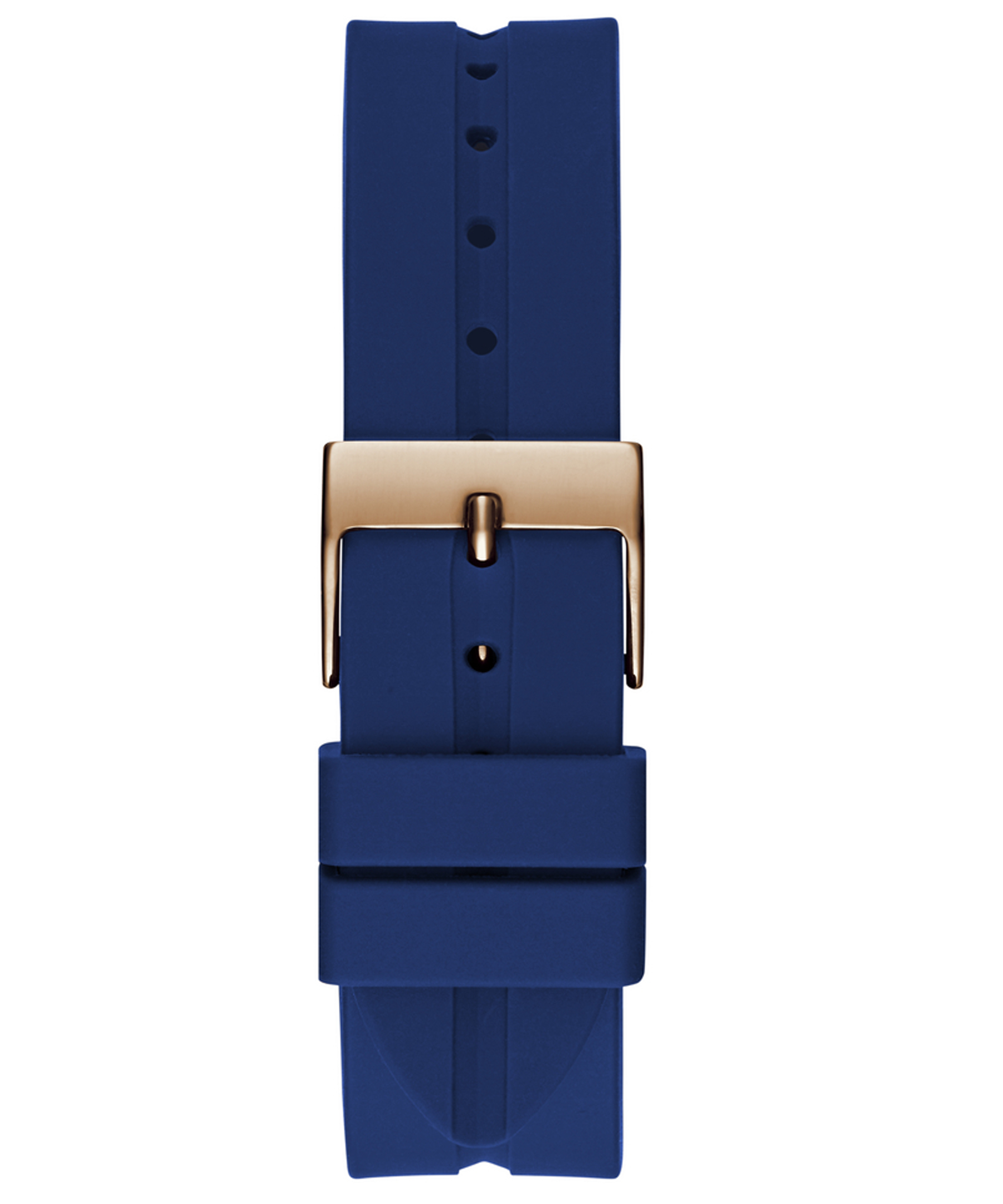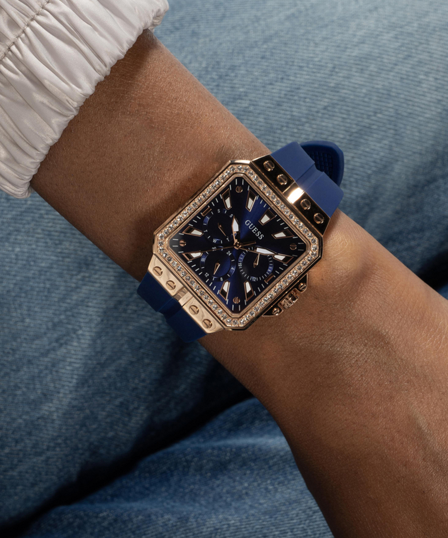 Оригінальний жіночий наручний годинник GW0618L2 легендарного американського бренду Guess. У годиннику встановлено надійний кварцовий механізм Miyota. Сталевий квадратний корпус із покриттям Gold Tone. Розмір корпусу – 34 х 34 мм, товщина – 9,1 мм. Безель декорований кристалами. Синій силіконовий ремінець із класичною застібкою - пряжкою. Ширина кріплення – 22,5 мм. Стрілки та тимчасові мітки з люмінесцентним покриттям. Додатково – відображення дня тижня та дата. Водозахист – 3 АТМ.