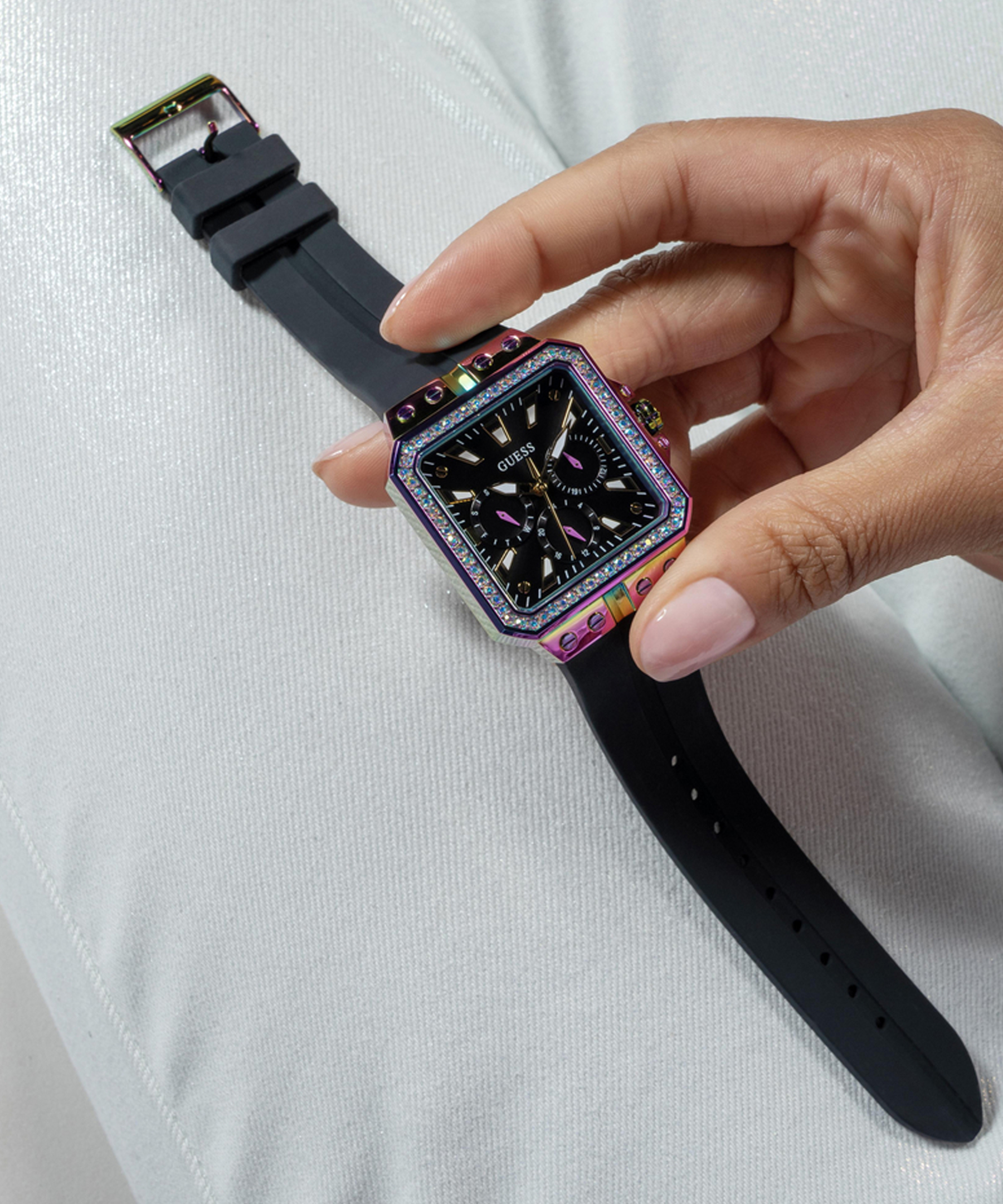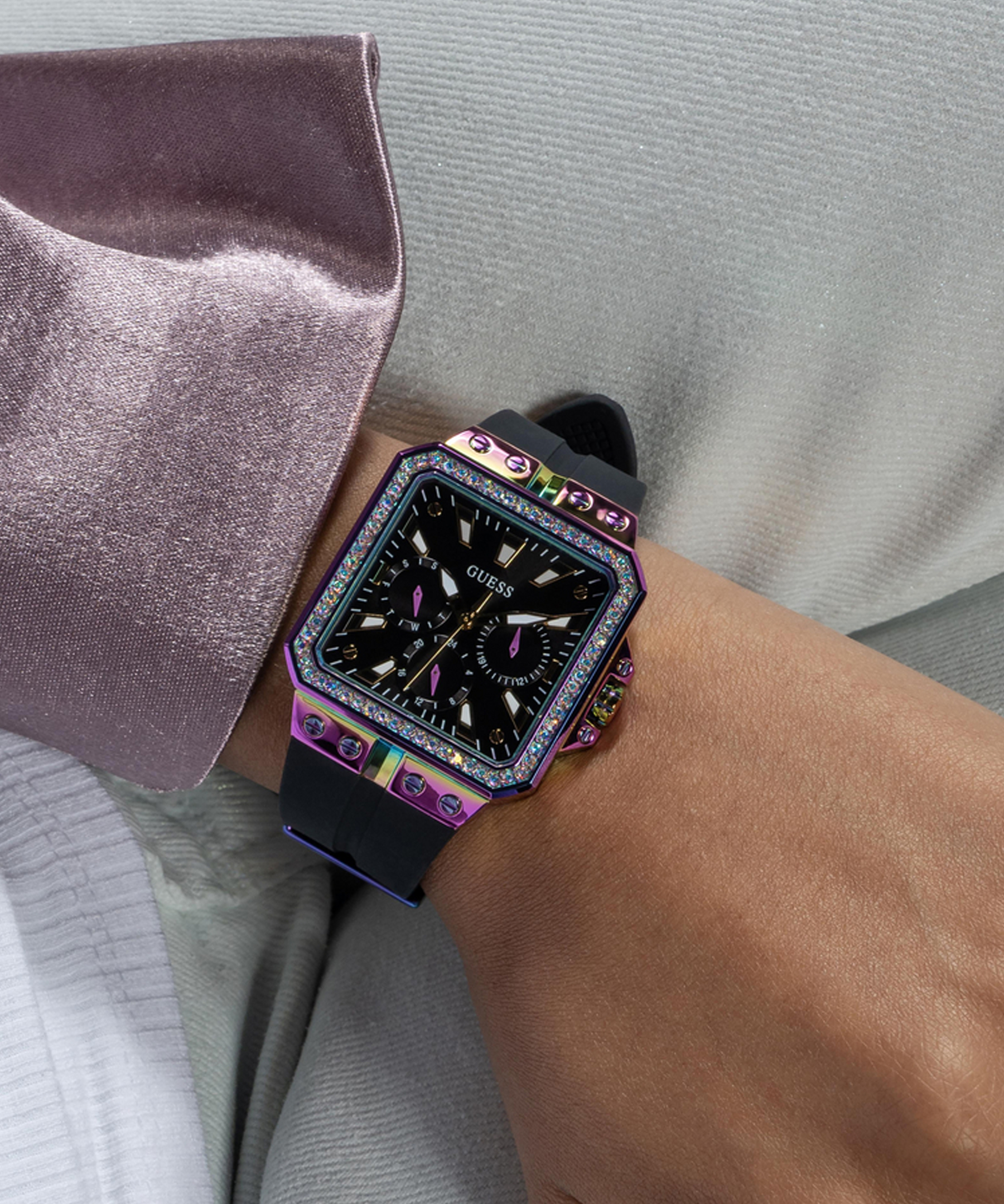 Оригінальний жіночий наручний годинник GW0618L3 легендарного американського бренду Guess. У годиннику встановлено надійний кварцовий механізм Miyota. Сталевий квадратний корпус з покриттям "хамелеон". Розмір корпусу – 34 х 34 мм, товщина – 9,1 мм. Безель декорований кристалами. Чорний силіконовий ремінець із класичною застібкою - пряжкою. Ширина кріплення – 22,5 мм. Стрілки та тимчасові мітки з люмінесцентним покриттям. Додатково – відображення дня тижня та дата. Водозахист – 3 АТМ.