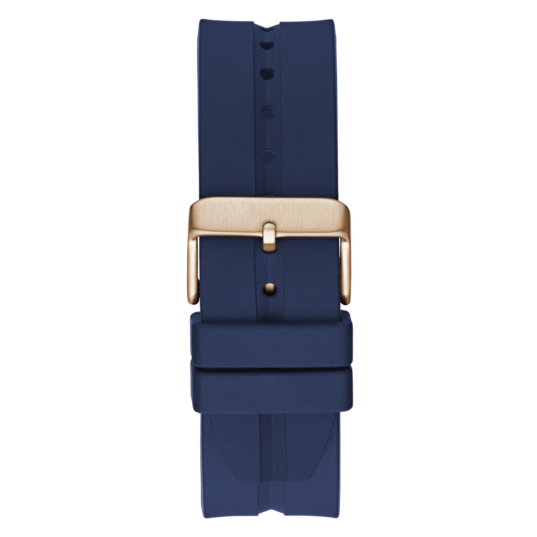 Чоловічий багатофункціональний годинник GUESS GW0637G3 з колекції MENS SPORT. Сталевий з покриттям Rose Gold Tone квадратной форми корпус. Розмір корпуса - 42 х 42 мм, товщина - 10,1 мм. Синій силіконовий ремінець с класичною застібкою пряжкой. Стрілки с люмінесцентним покриттям. Водозахист - 3 АТМ.