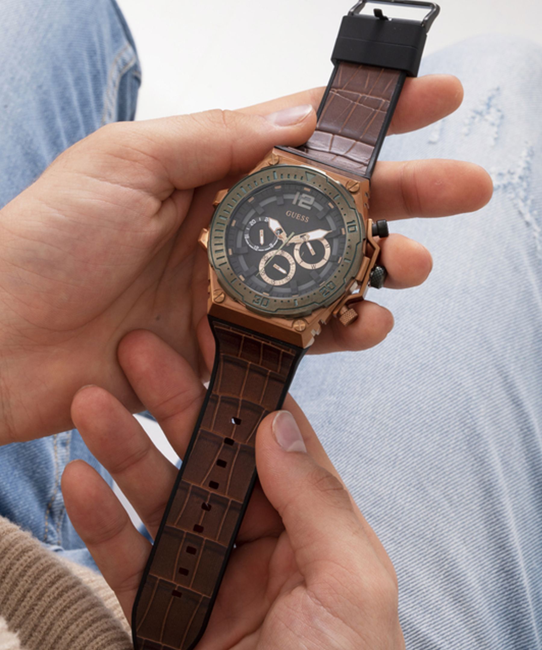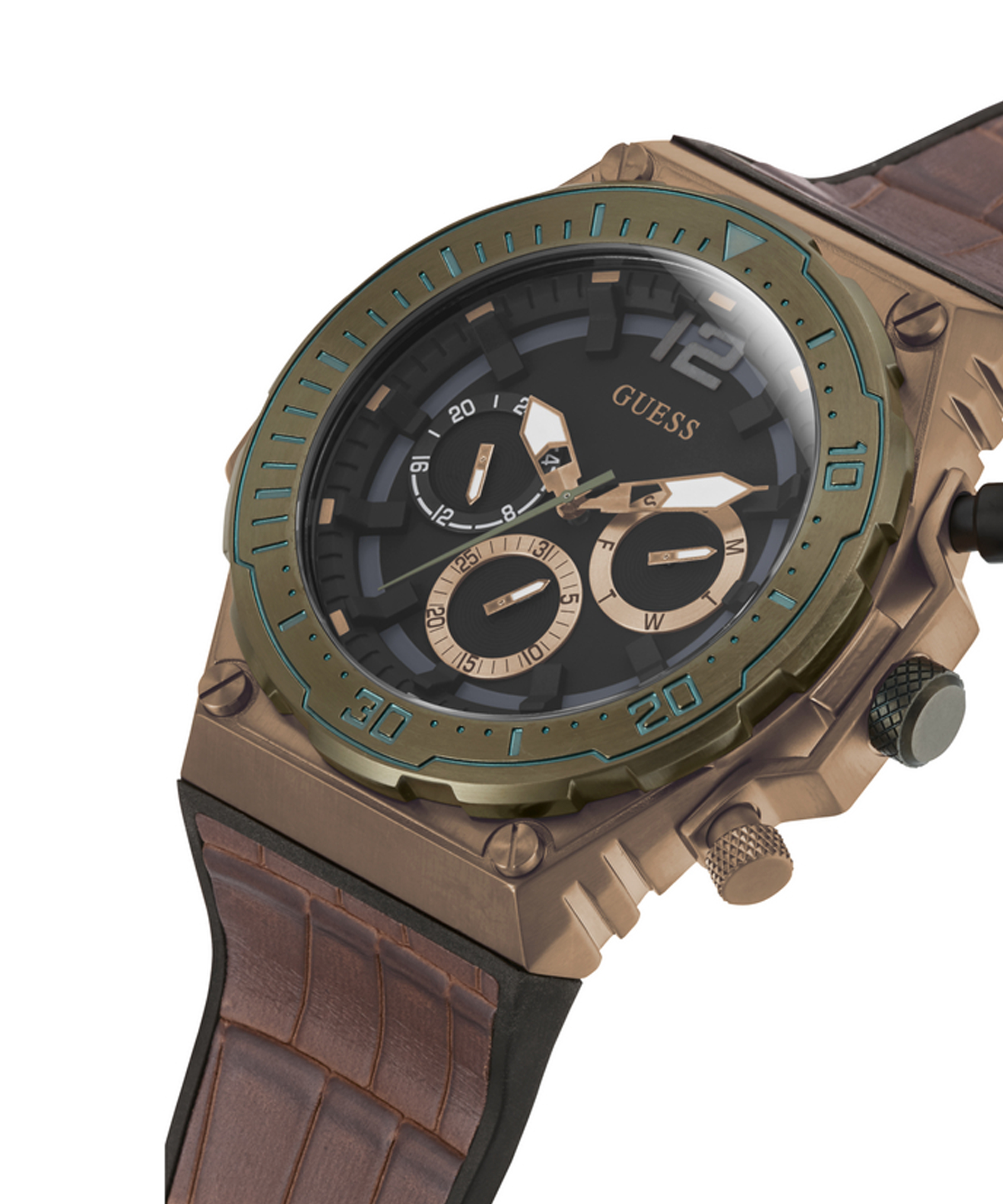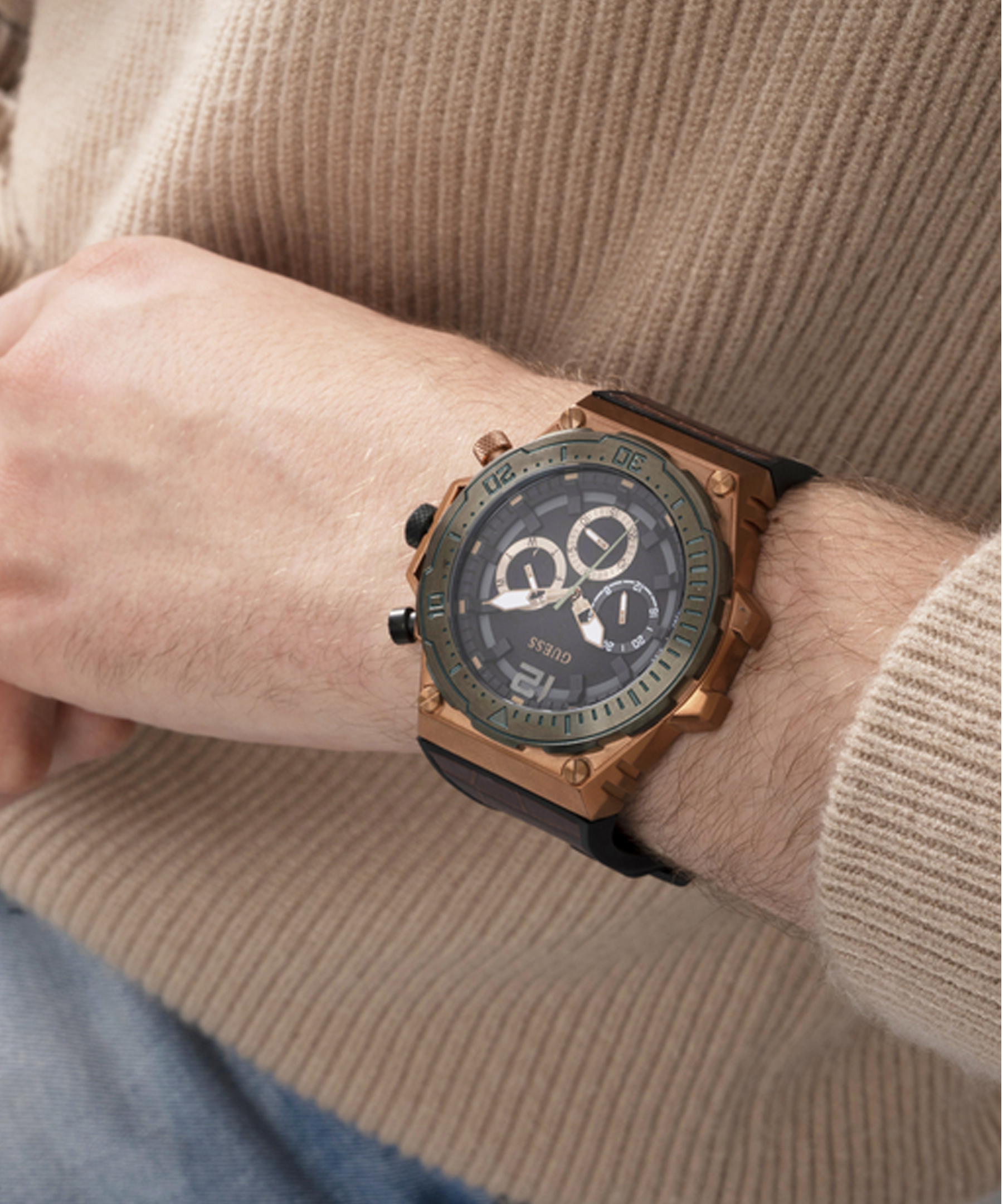 Чоловічий кварцовий годинник GUESS GW0326G2 з колекції MENS SPORT. Сталевий коричневий корпус. Діаметр корпусу – 48 мм, товщина – 12,35 мм. Шкіряний ремінець. Ширина кріплення – 24 мм. Мінеральне скло. Водозахист – 5 АТМ.