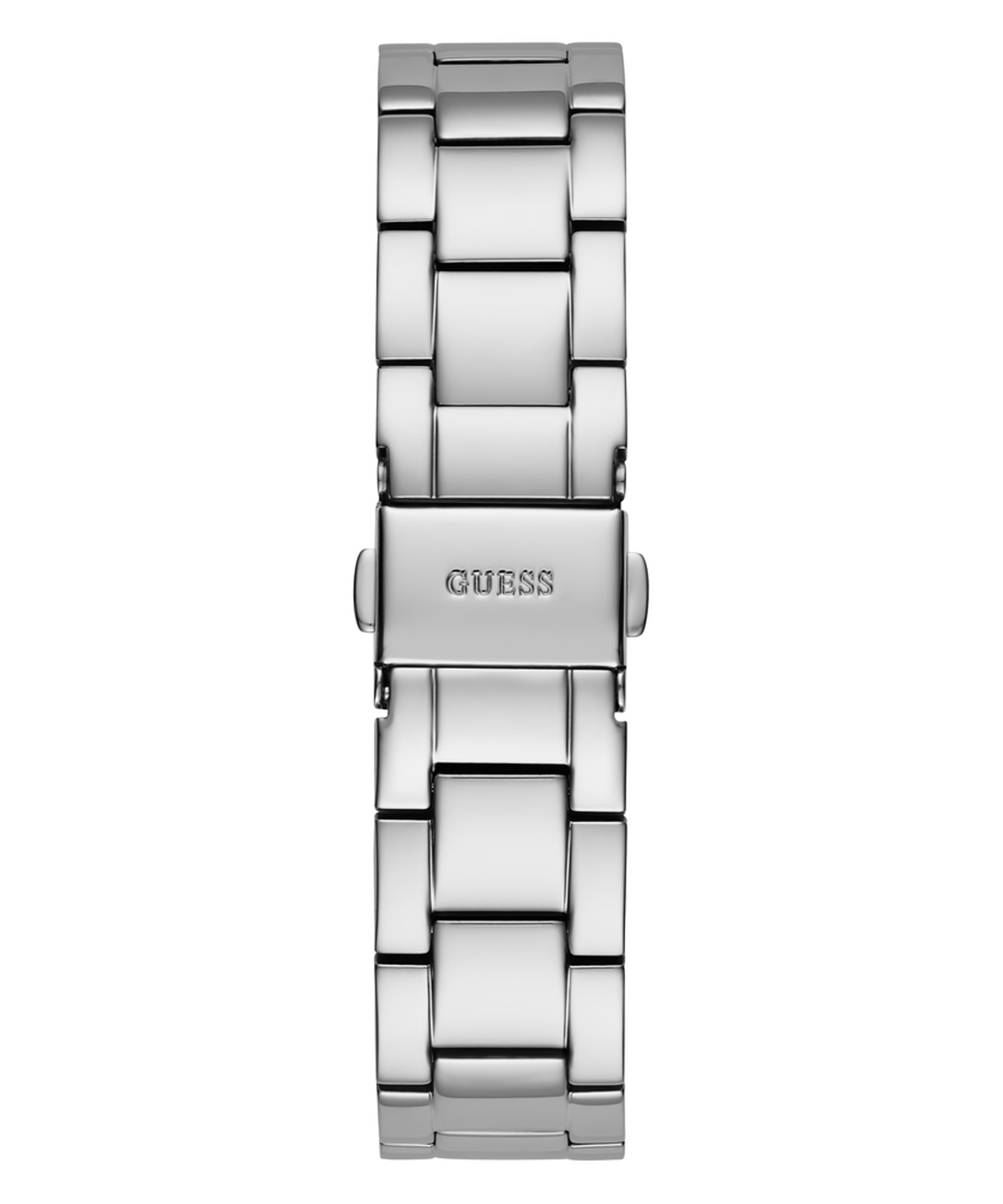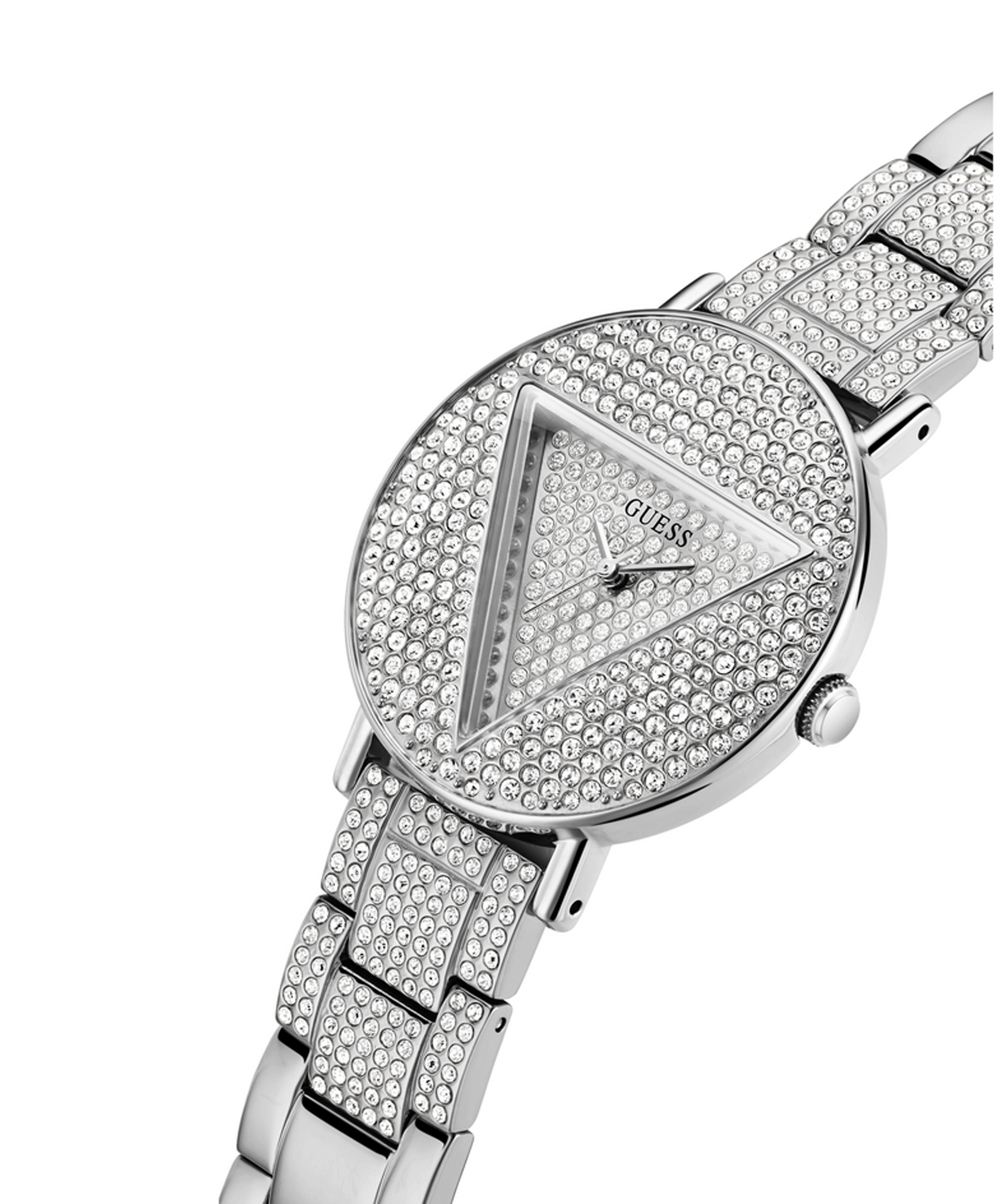 Жіночий наручний годинник американського бренду GUESS GW0512L1. Колекція - Ladies Trend. У годиннику встановлено надійний кварцовий механізм Miyoata. Сталеві корпус та браслет. Діаметр корпусу – 36 мм, товщина – 8,75 мм. Браслет зі складаною кліпсою. Ширина кріплення – 16 мм. Головна особливість аксесуара – кристали, якими прикрашені аналоговий циферблат та частина браслета. Також на циферблаті трикутник – елемент логотипу бренду.