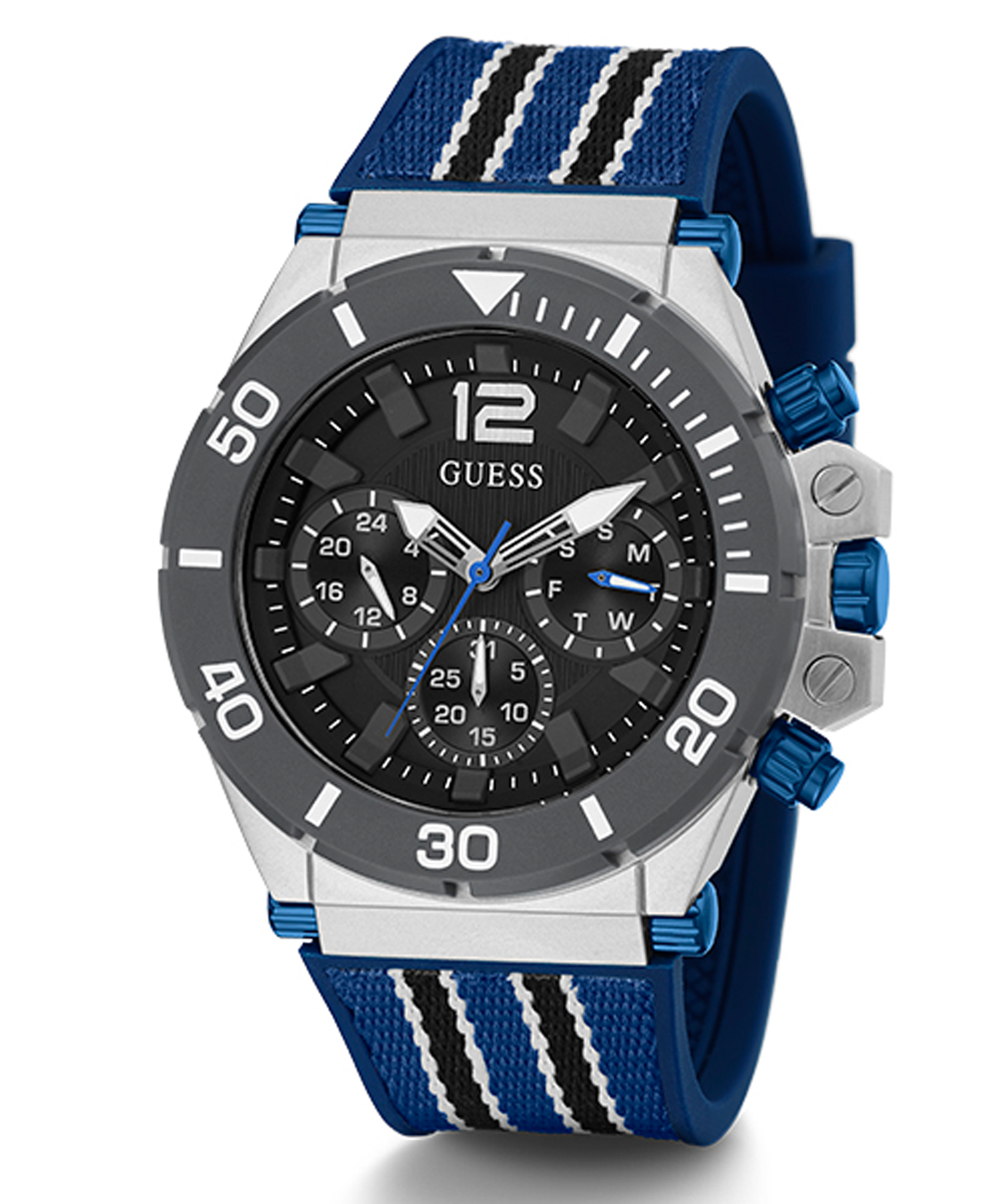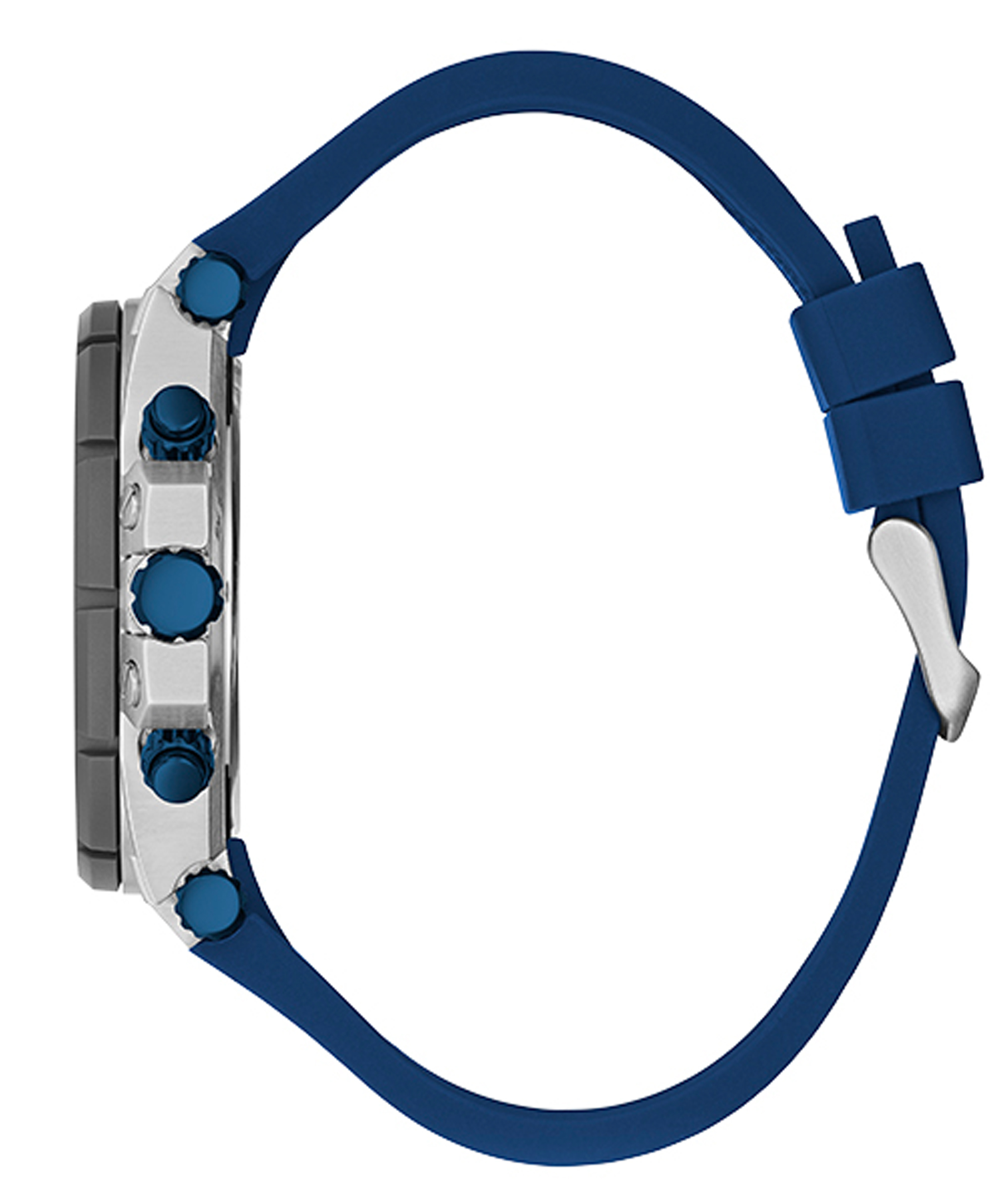 Чоловічий наручний годинник - хронограф американського бренду GUESS. У годиннику встановлено кварцовий механізм Miyota. Стальний корпус із покриттям Silver Tone. Діаметр корпусу – 48 мм, товщина – 12,4 мм. Міцне мінеральне скло. Водозахист 5 АТМ.