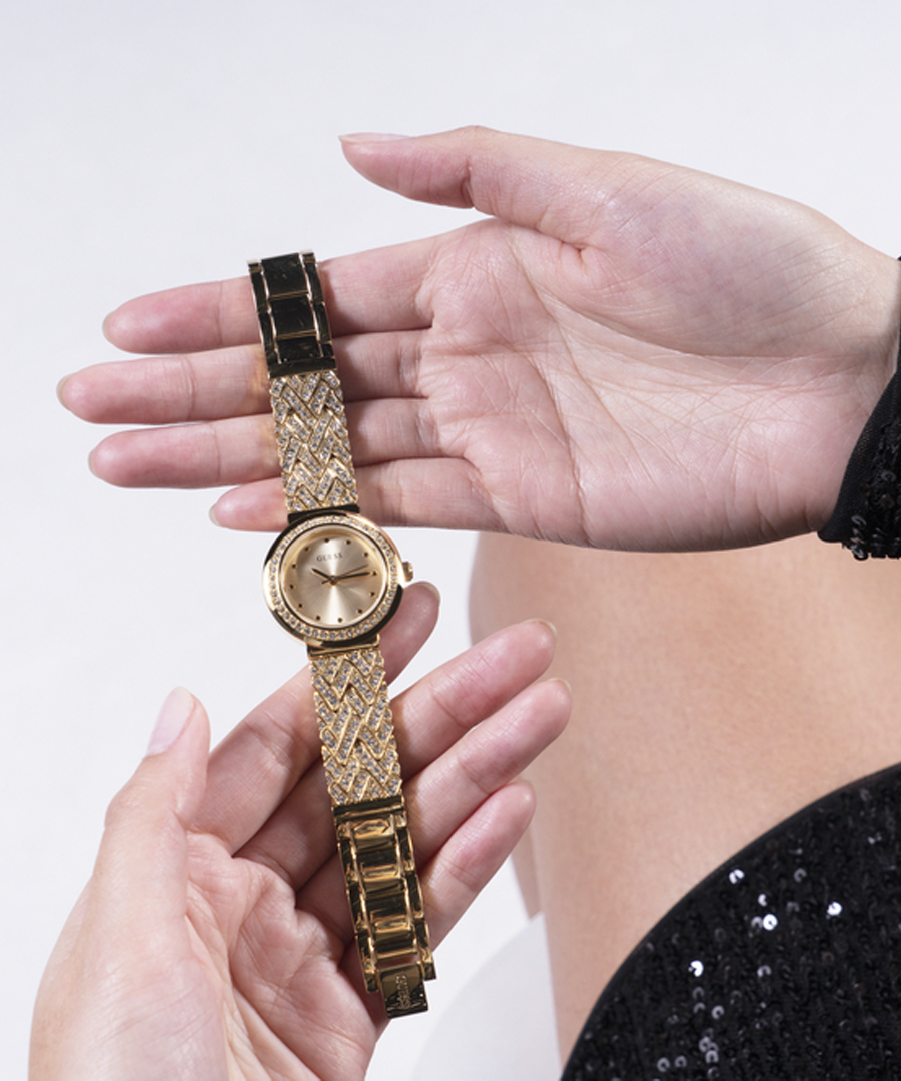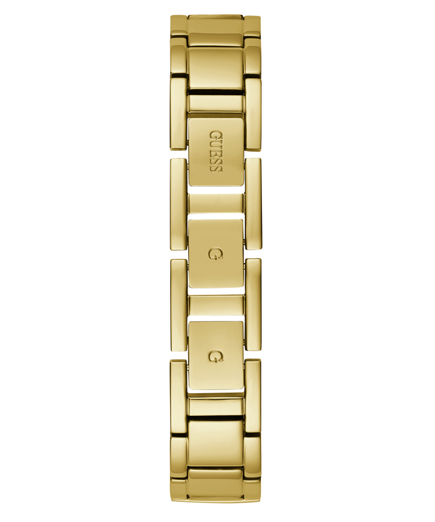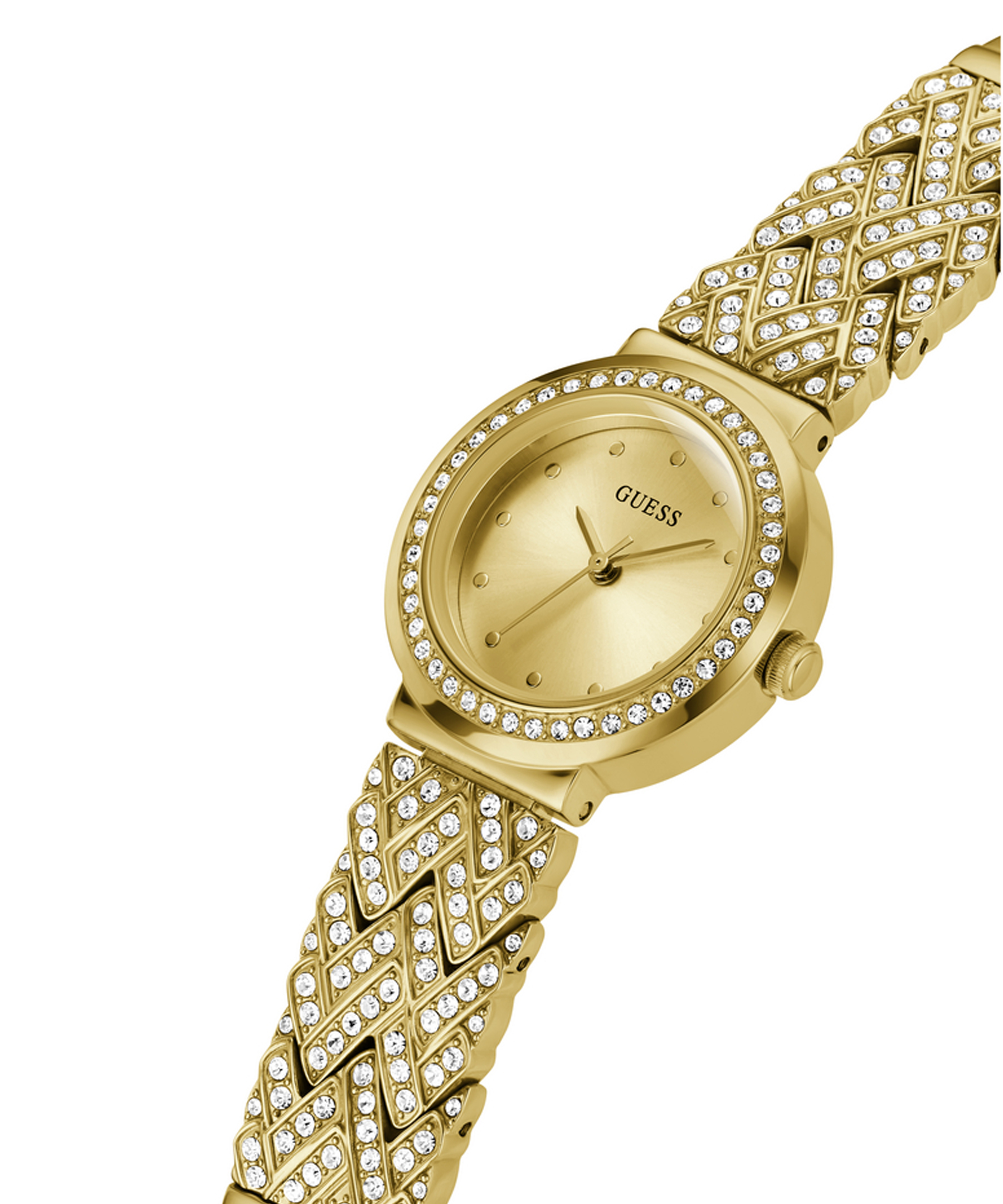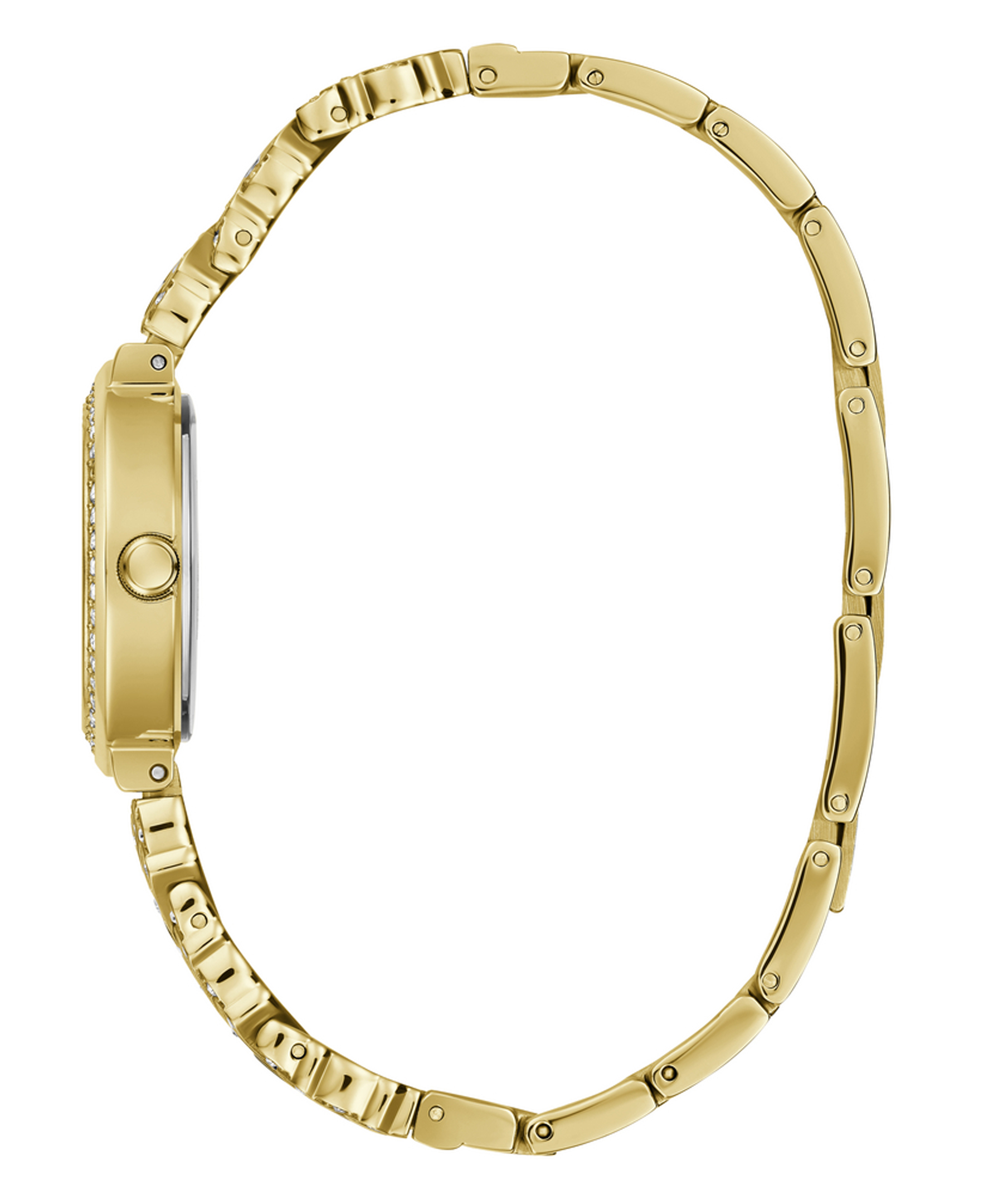 Оригінальний годинник жіночий GUESS GW0476L2 з надійним кварцовим механізмом Miyota. Колекція - LADIES DRESS. Сталеві з покриттям "Gold Tone" корпус та браслет. Діаметр корпусу – 28 мм, товщина – 7,3 мм. Ширина кріплення – 14 мм. Безель та браслет прикрашені кристалами. Золотий циферблат "Sunray". Водозахист – 3 АТМ.