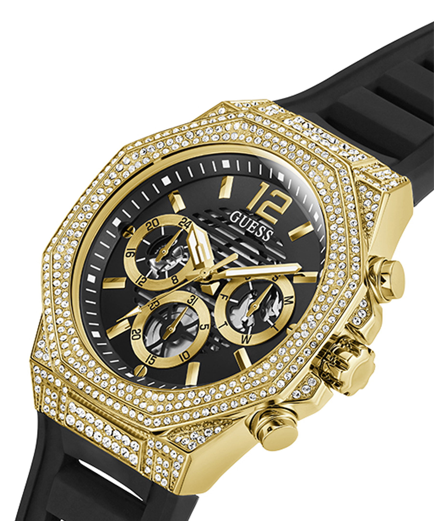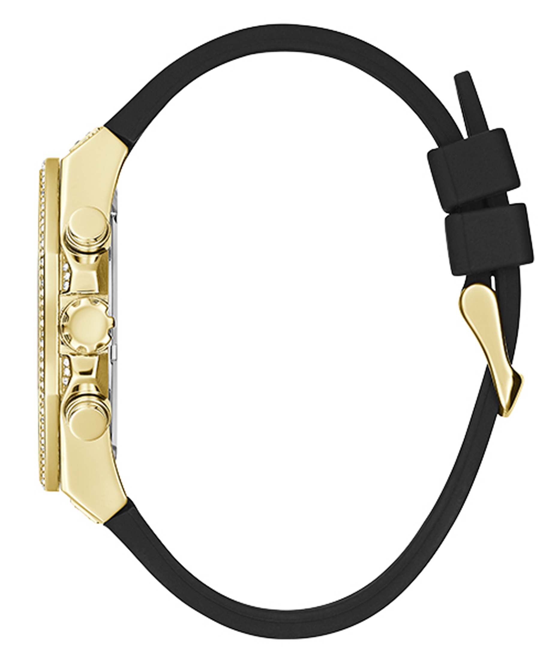 Розкішний чоловічий наручний годинник американського бренду GUESS. У годиннику встановлено надійний кварцовий механізм Miyota. Сталевий із покриттям Gold Tone корпус. Діаметр корпусу – 44 мм, товщина – 10,5 мм. Безель декорований кристалами. Чорний циферблат Sunray гармонійно поєднується із чорним силіконовим текстурним ремінцем. Ремінець, ширина кріплення якого становить 26 мм, оснащений класичною застібкою - пряжкою, що надійно фіксує аксесуар на руці. Додатково – відображення дати, дня тижня та часу у форматі 12/24. Водозахист 5 АТМ.