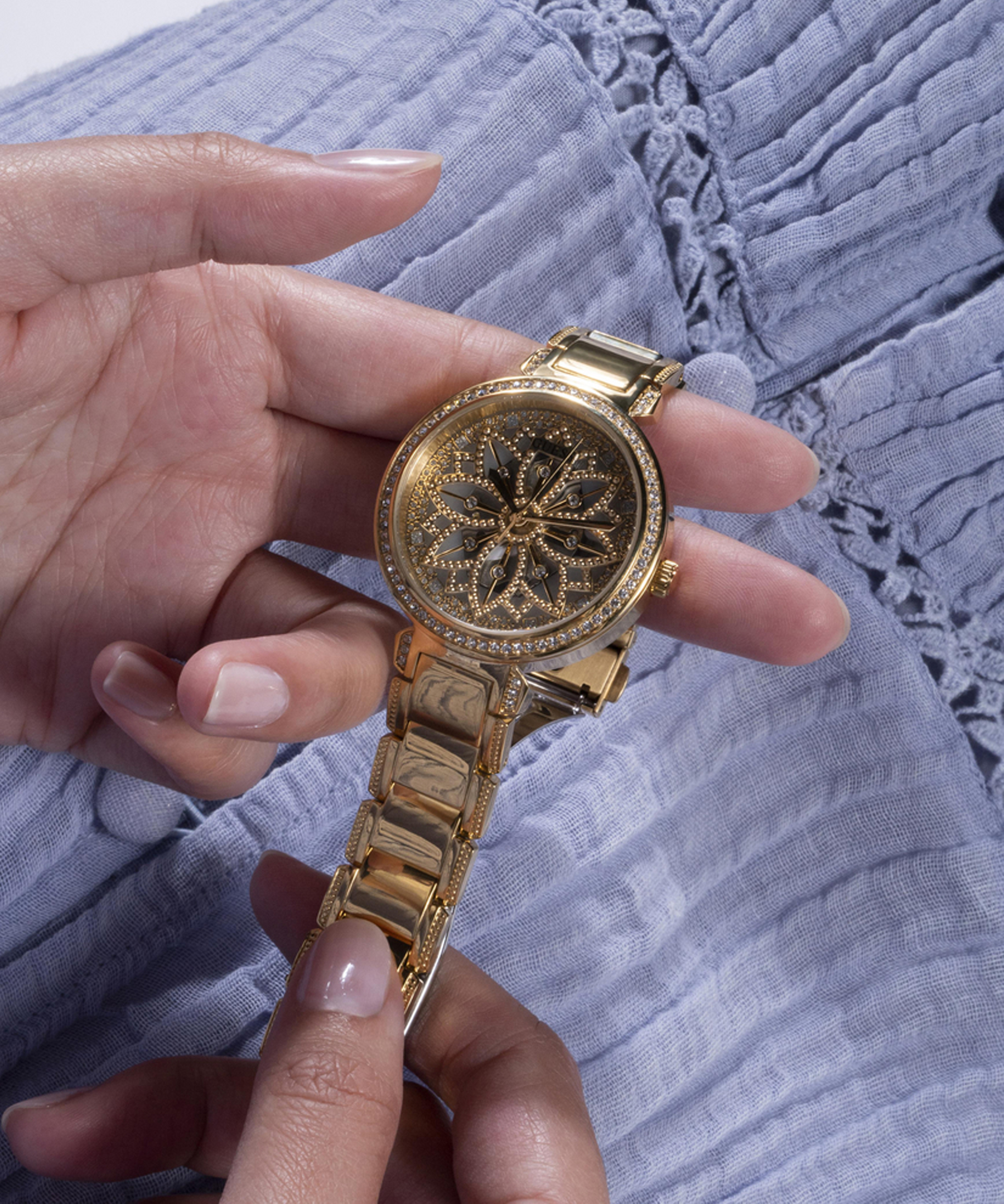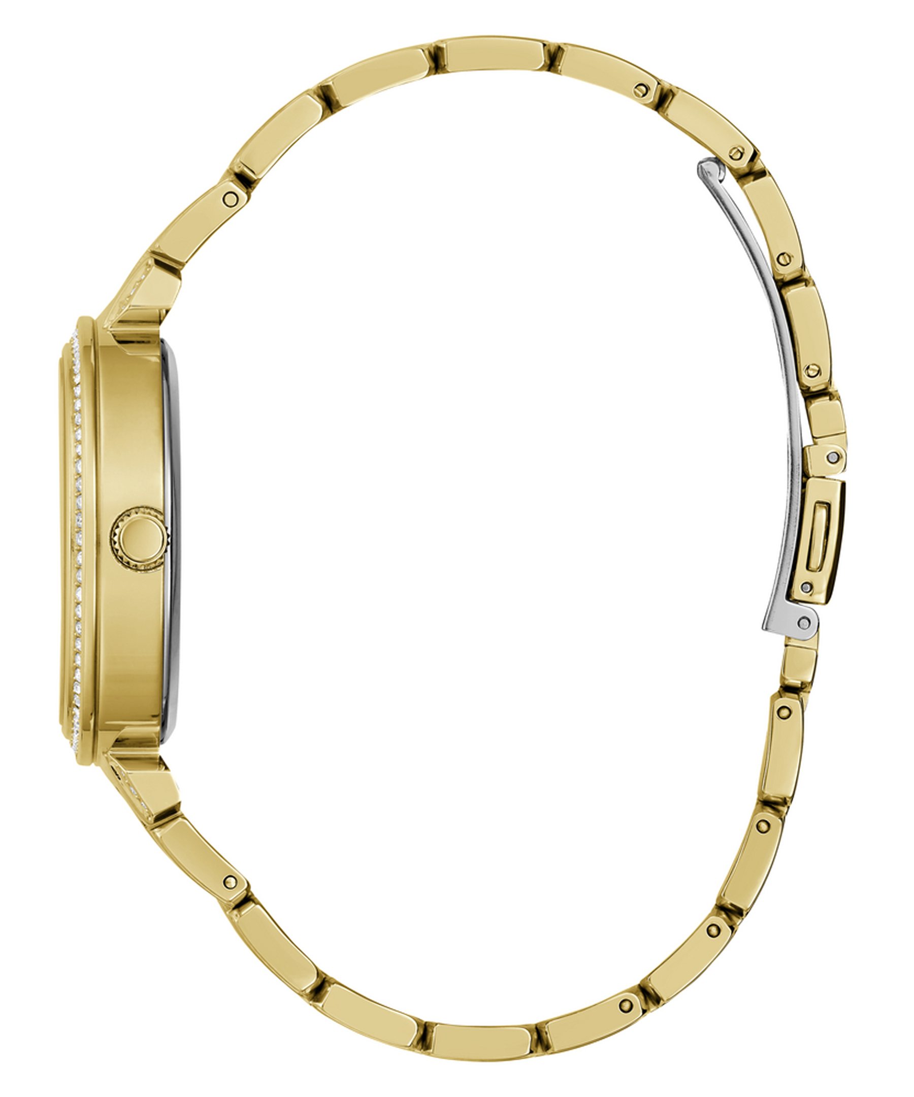 Оригінальний жіночий наручний годинник GW0528L2 відомого легендарного бренду GUESS. У годиннику встановлено надійний кварцовий механізм Miyota. Колекція - LADIES TREND. Сталеві корпус та браслет з покриттям Gold Tone. Діаметр корпусу – 36 мм, товщина – 9,25 мм. Браслет зі складаною кліпсою. Ширина кріплення – 18 мм. Безель прикрашений кристалами. Водозахист – 3 АТМ.