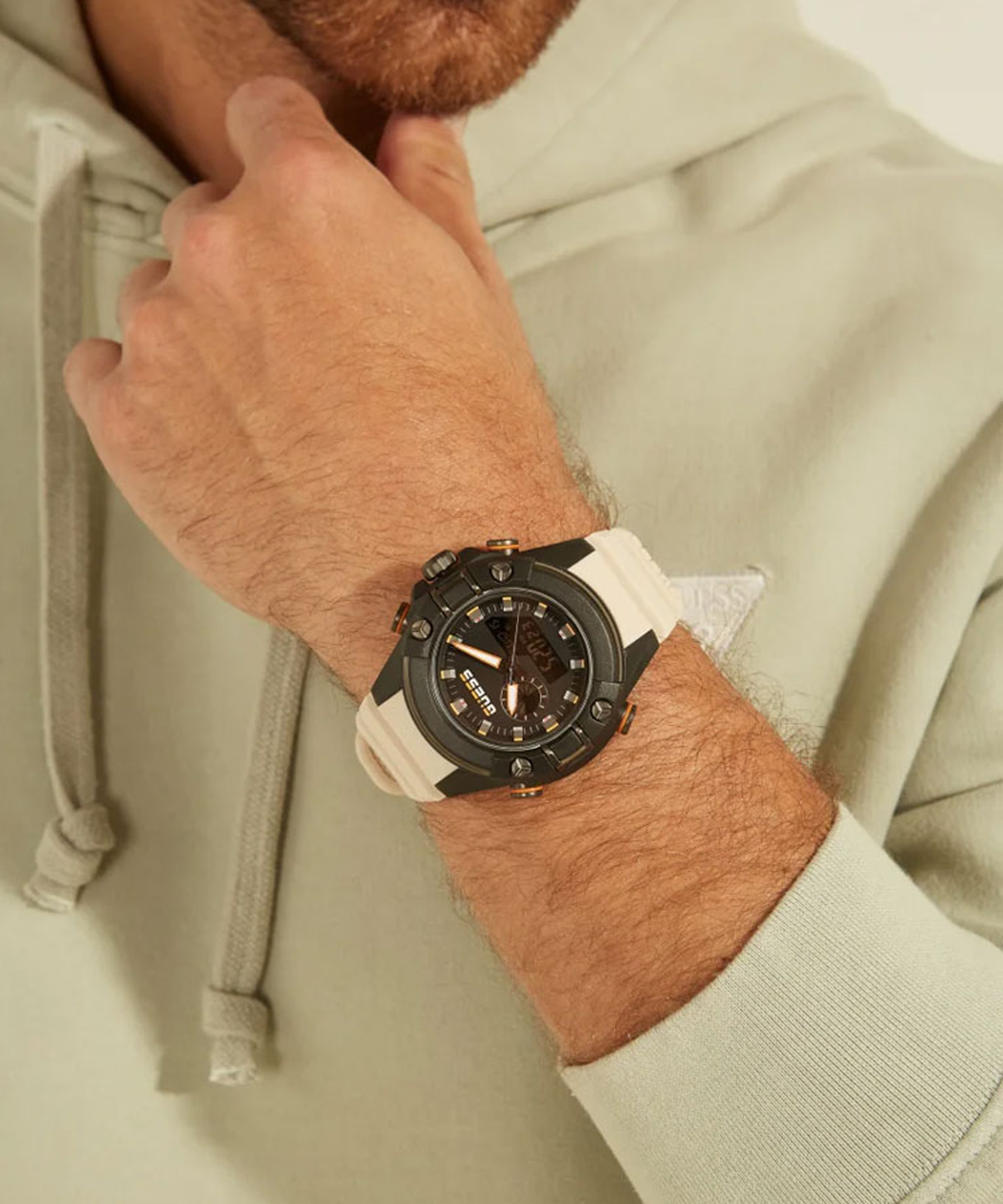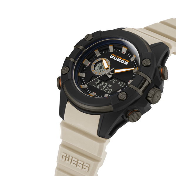 Авангардний чоловічий спортивний годинник відомого американського бренду GUESS з колекції Mens Sport виготовлені з чорного полікарбонату. Серцем годинника служитя японський кварцовий механізм Miyota, який заслужив взнання на світовому ринку. Відмінною особливістю годинника є подвійний тип індикації – аналоговий та цифровий. Особливий дзайн безелю та кнопок керування механізмом нагадує панель автомобіля, де розташовані датчики. Силіконовий ремінець із логотипом бренду контрастно підкреслює оригінальність рішення модельєрів бренду. Міцне мінеральне скло.Водозахист 5 АТМ. Надзвичайний комфорт пропонованої моделі не залишать байдужими поціновувачів статусних аксесуарів.