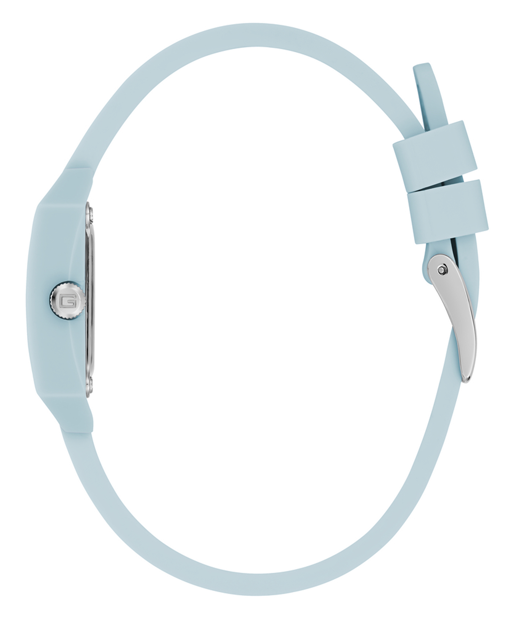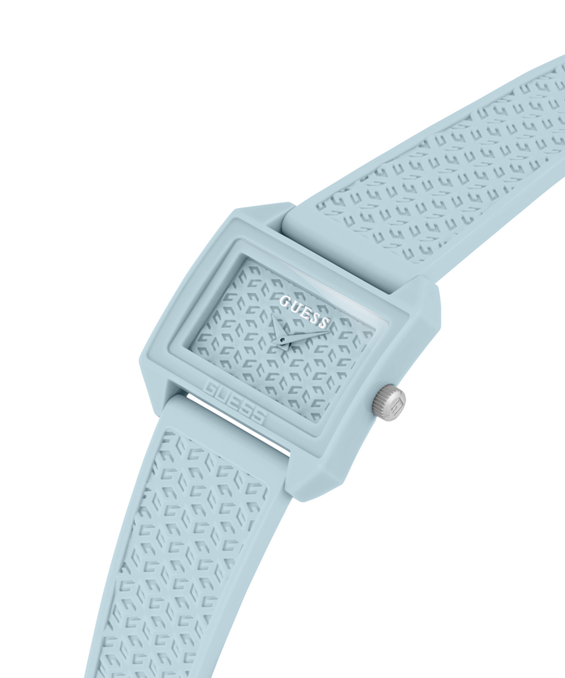 Оригінальний жіночий наручний годинник GW0677L3 американського бренду GUESS. В годиннику встановлений надійний японський механізм Miyota. Годинник виконаний у блакитному кольорі. Прямокутний корпус плавно переходить у силіконовий ремінець, котрий декорований текстурним орнаментом. Мінеральне скло. Водозахист 1 АТМ.