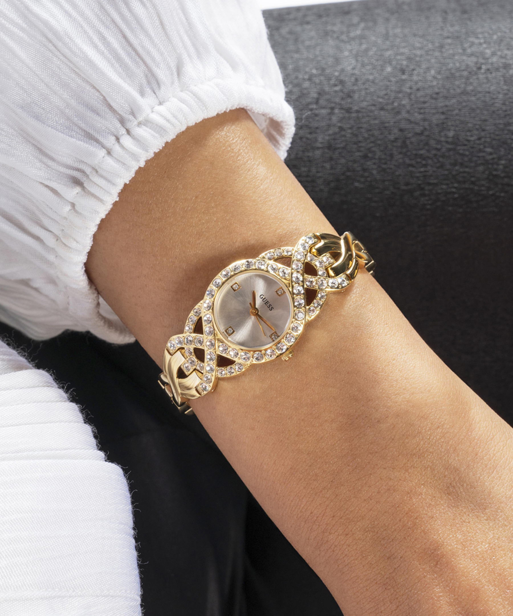 Надзвичайно жіночний дизайн втілений у новій моделі годинника GW0682L2 американського бренду GUESS. В годиннику встановлений надійний японський механізм Miyota. Сталеві з золотистим покриттям корпус та браслет. Нестандартний дизайн, надійність кварцевого механізму Miyota та практичність поєднані у одному аксесуарі, котрий може служити своїй власниці як самостійна ювелірна прикраса. Діаметр корпусу - 23 мм. Сріблястий аналоговий циферблат захищений міцним мінеральним склом. Водозахист 1 АТМ.