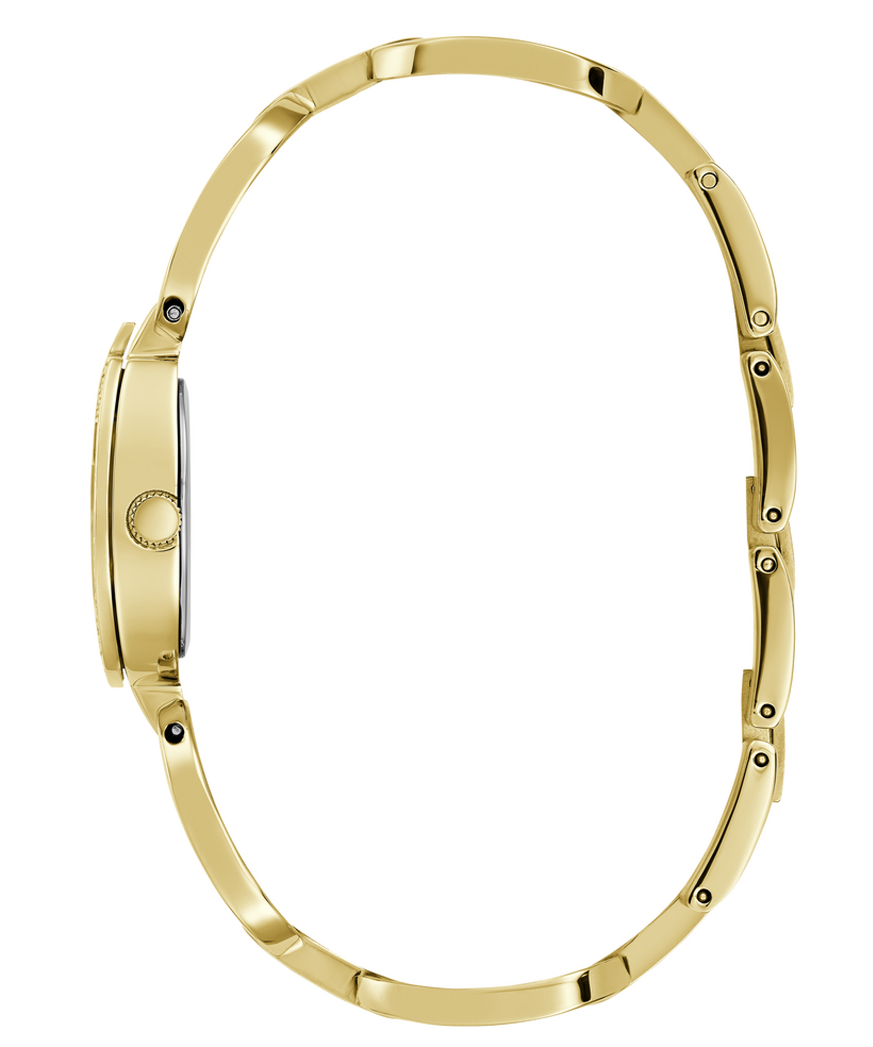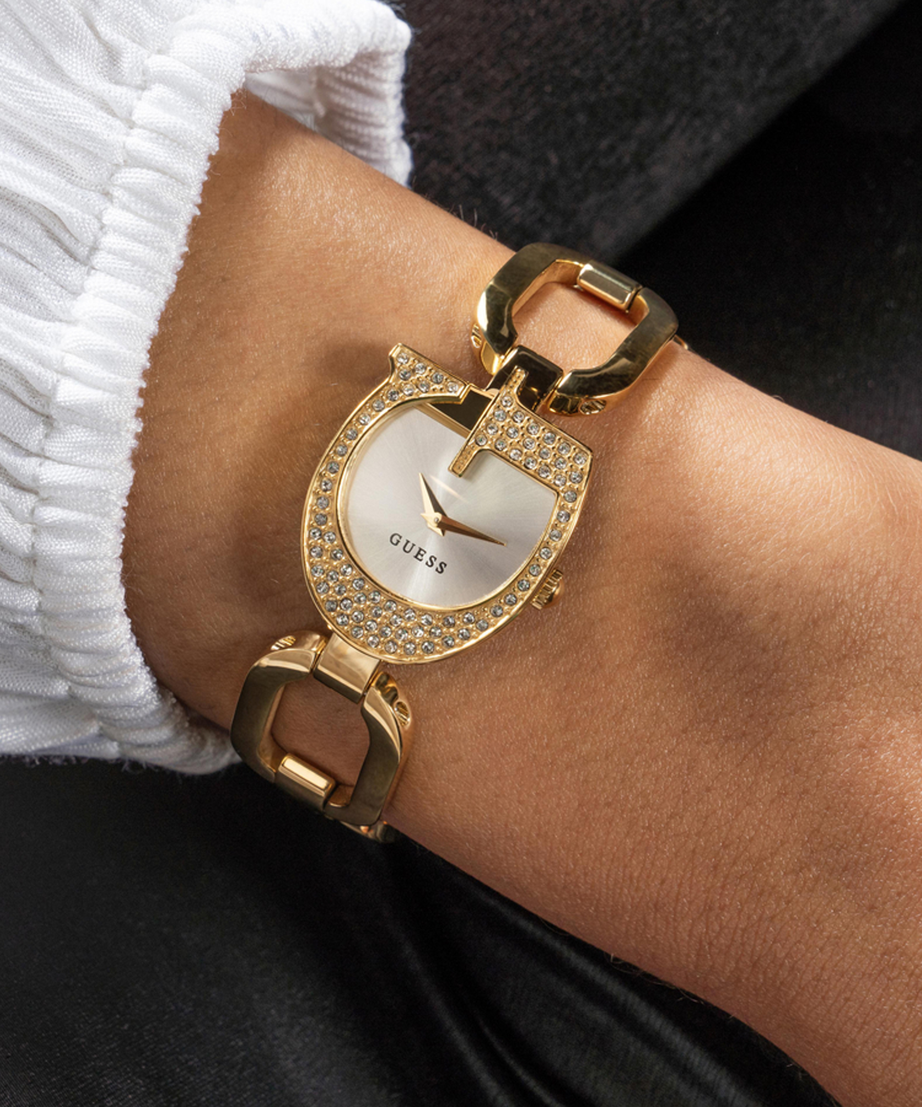 Надзвичайно жіночний дизайн втілений у новій моделі годинника GW0683L2 американського бренду GUESS. В годиннику встановлений надійний японський механізм Miyota. Сталеві з золотистим покриттям корпус та браслет. Нестандартний дизайн, надійність кварцевого механізму Miyota та практичність поєднані у одному аксесуарі, котрий може служити своїй власниці як самостійна ювелірна прикраса. Розмір корпусу - 22 мм. Сріблястий аналоговий циферблат захищений міцним мінеральним склом. Водозахист 3 АТМ.