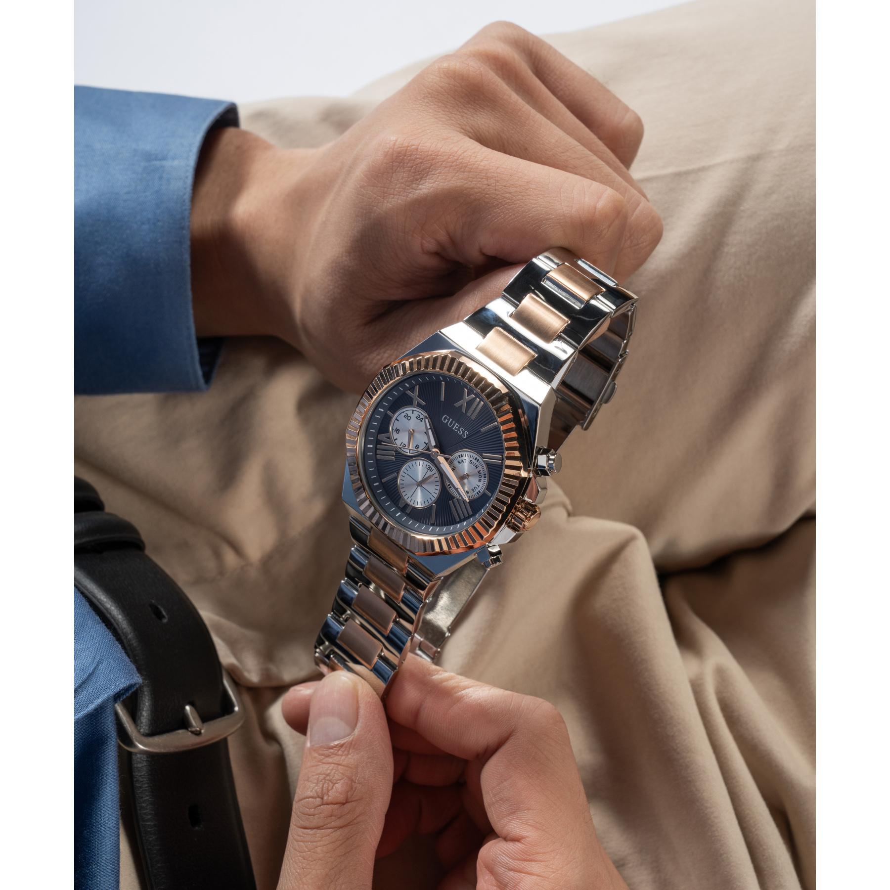 Широкий синій циферблат з витонченим візерунком сонця підкреслює вишуканий характер годинника. Чіткі золотисті індекси та стрілки з люмінесцентним покриттям забезпечують зручне зчитування часу навіть у темряві. Додаткові індикатори відображають дату, день тижня та 24-годинний формат часу, роблячи модель не лише елегантною, а й функціональною.
