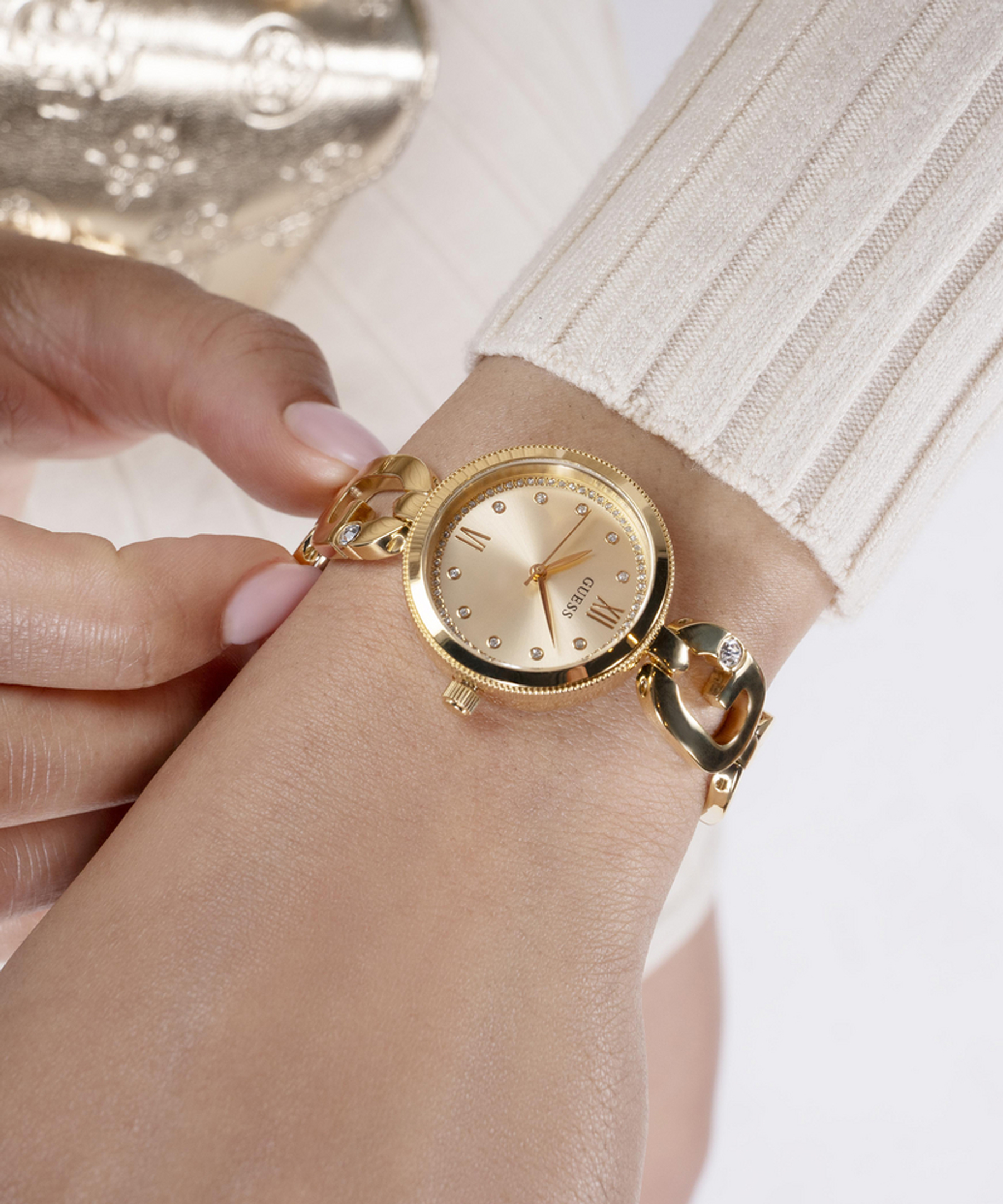 Надзвичайно жіночний дизайн втілений у новій моделі годинника американського бренду GUESS. В годиннику встановлений надійний японський механізм Miyota. Сталеві корпус та браслет із PVD покриттям GOLD TONE. Вишуканий дизайн, надійність кварцевого механізму Miyota та практичність поєднані у одному аксесуарі, котрий може служити своїй власниці як самостійна ювелірна прикраса. Діаметр корпусу: 30мм. Аналоговий циферблат надійно захищений міцним мінеральним склом. Водозахист 3 АТМ.