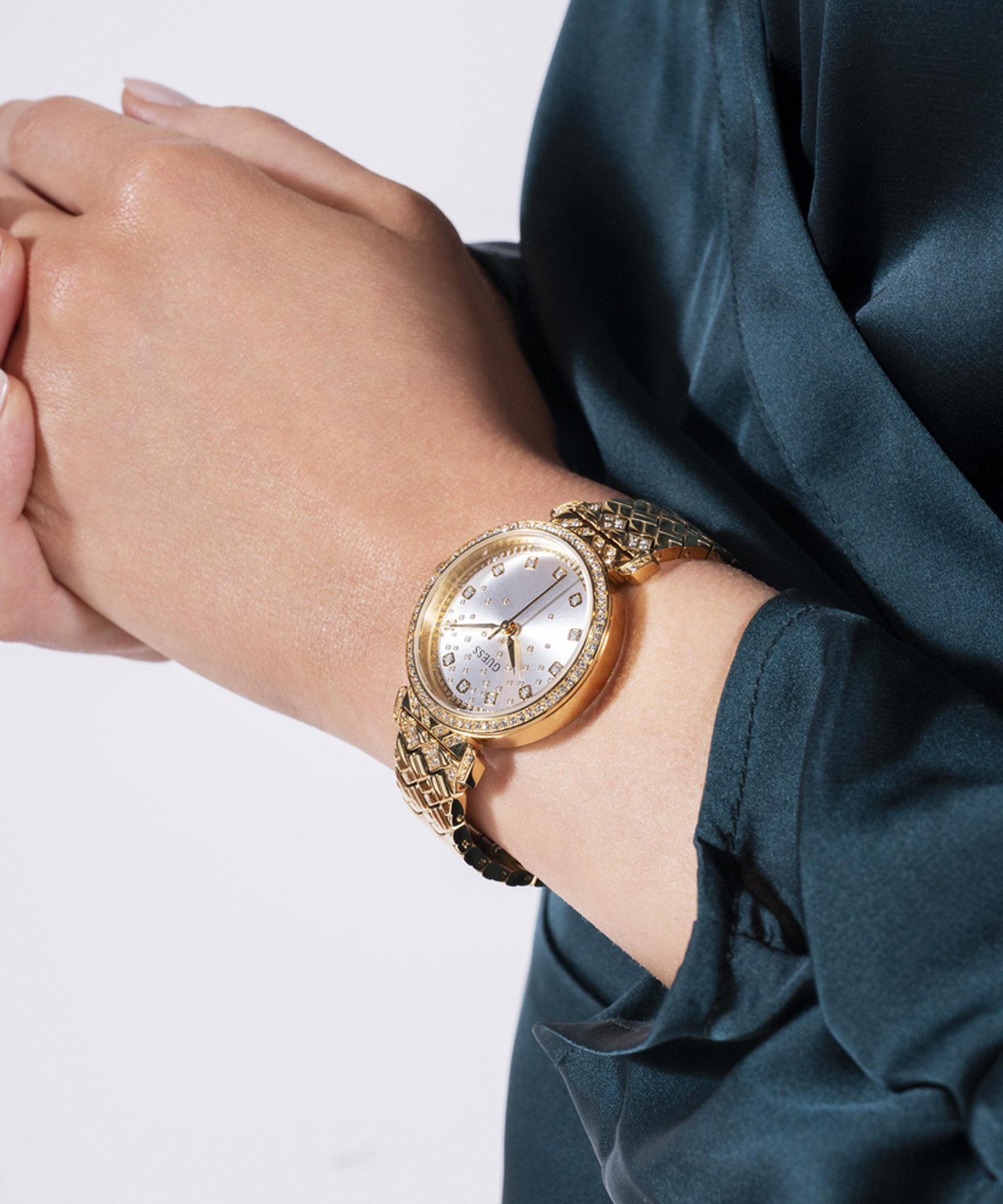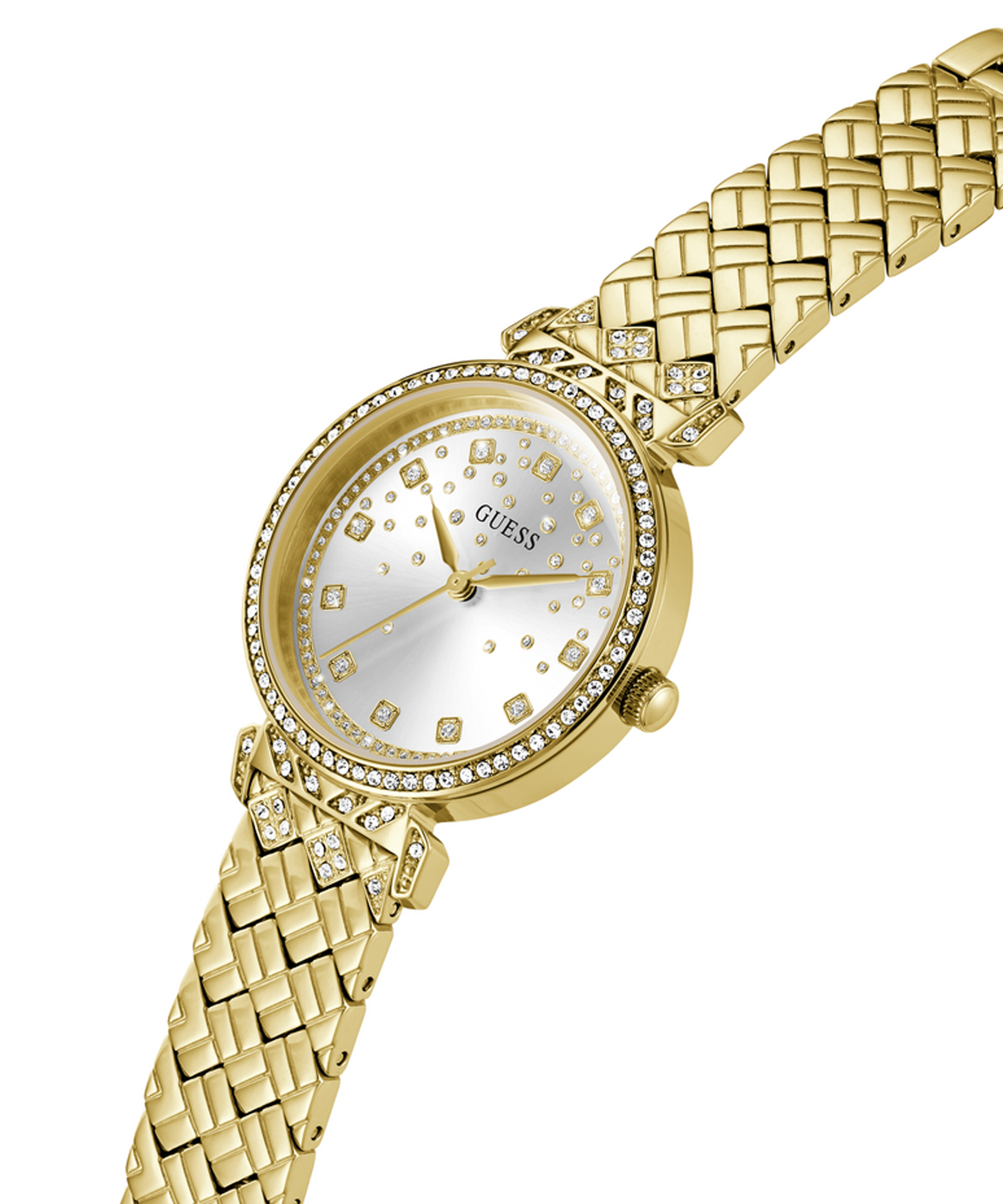 Надзвичайно жіночний дизайн втілений у новій моделі годинника американського бренду GUESS. В годиннику встановлений надійний японський механізм Miyota. Сталеві корпус та браслет. Вишуканий дизайн, надійність кварцевого механізму Miyota та практичність поєднані у одному аксесуарі, котрий може служити своїй власниці як самостійна ювелірна прикраса. Діаметр корпусу - 32 мм. Сріблястий аналоговий циферблат захищений міцним мінеральним склом. Водозахис: 3 АТМ.