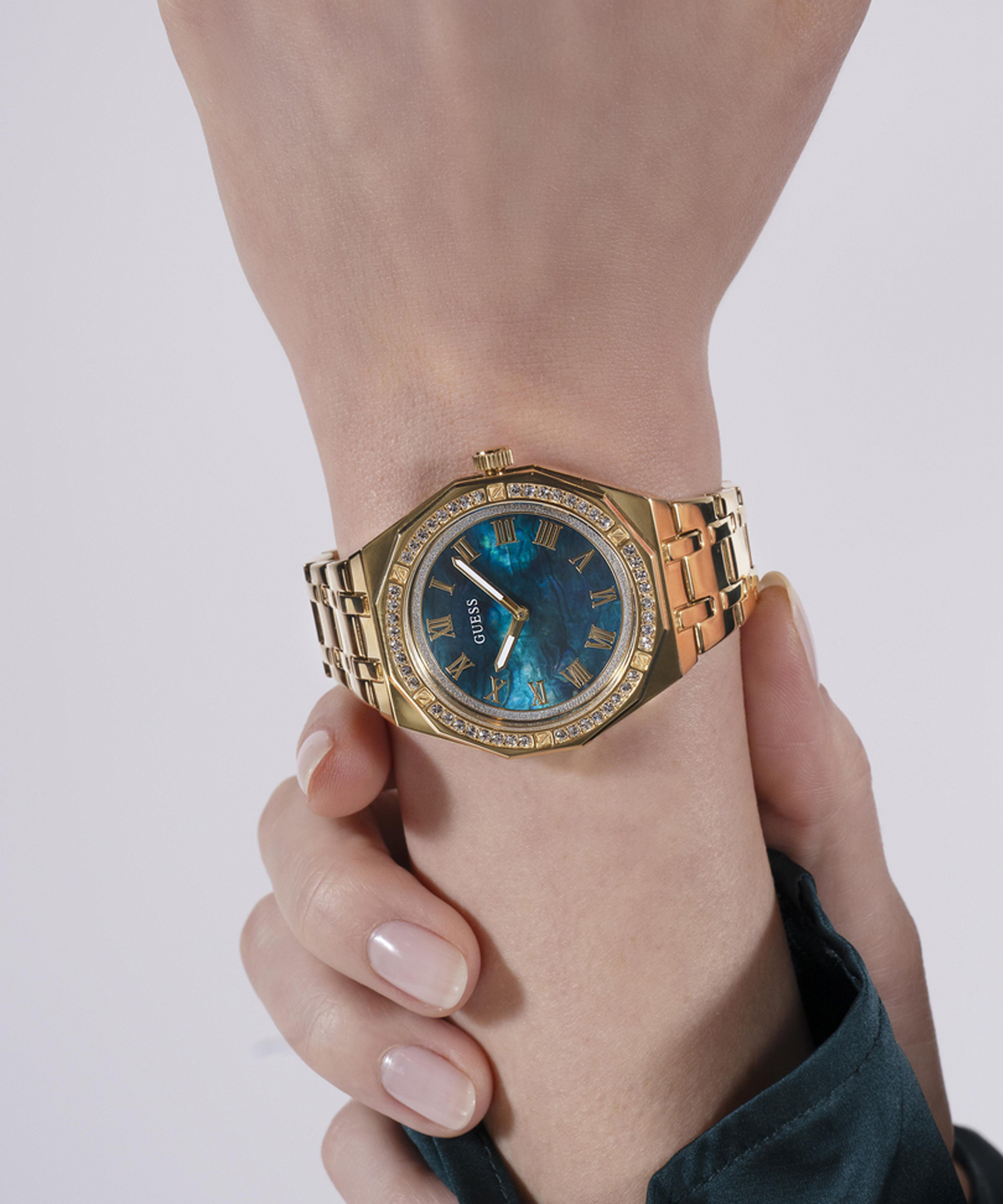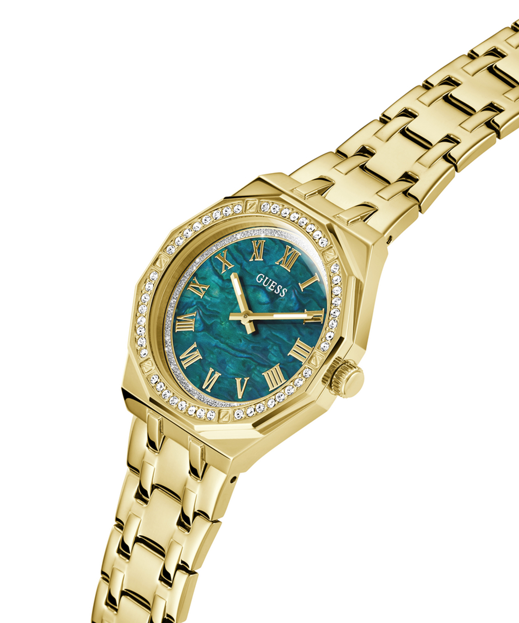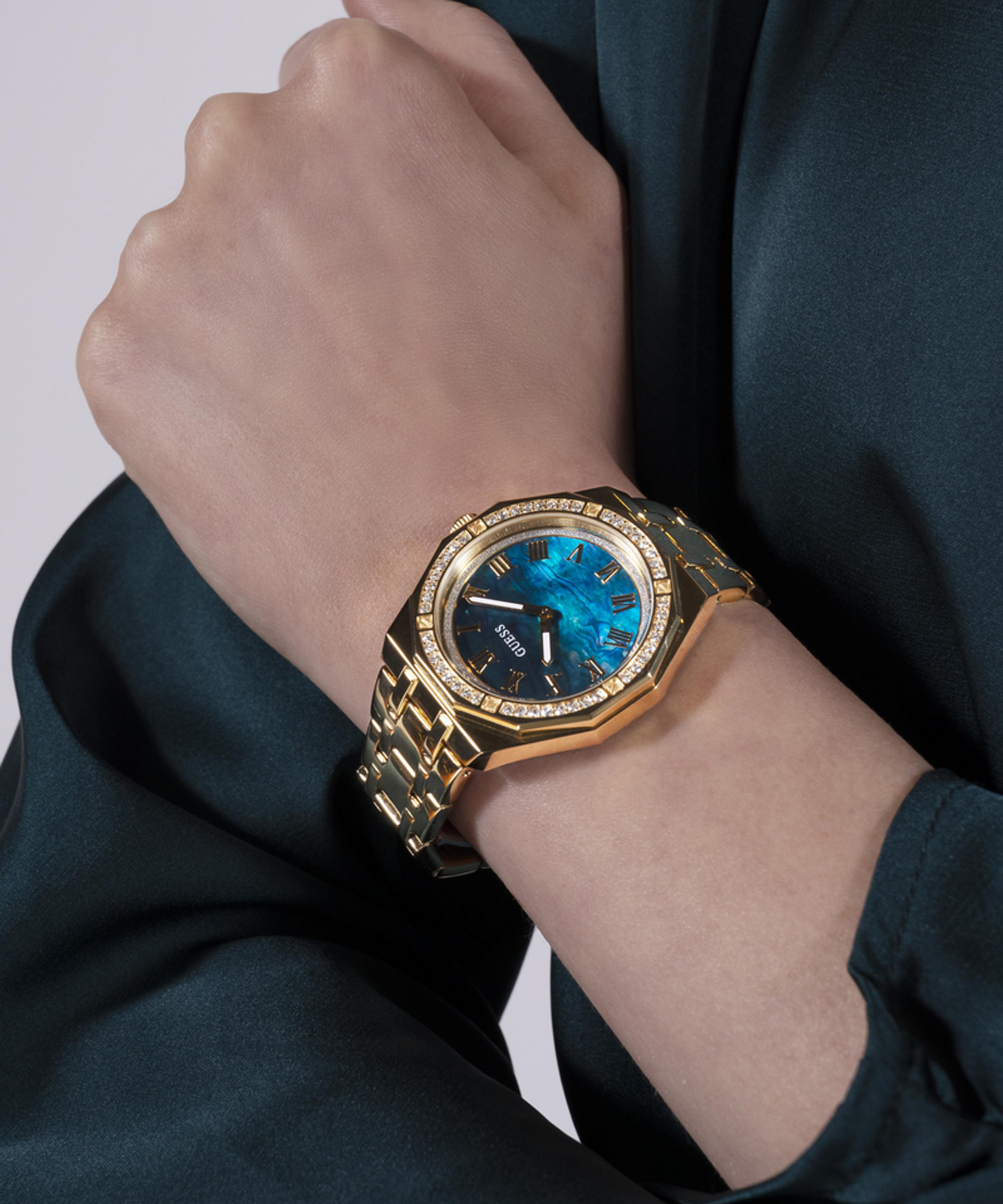 Перламутрово-зелений циферблат гармонійно поєднується з золотистим корпусом, створюючи витончений образ. Часові мітки виконані у вигляді римських цифр, а тонкі стрілки забезпечують зручне зчитування часу. Безель дванадцятикутної форми, прикрашений кристалами, додає моделі сяючого акценту.