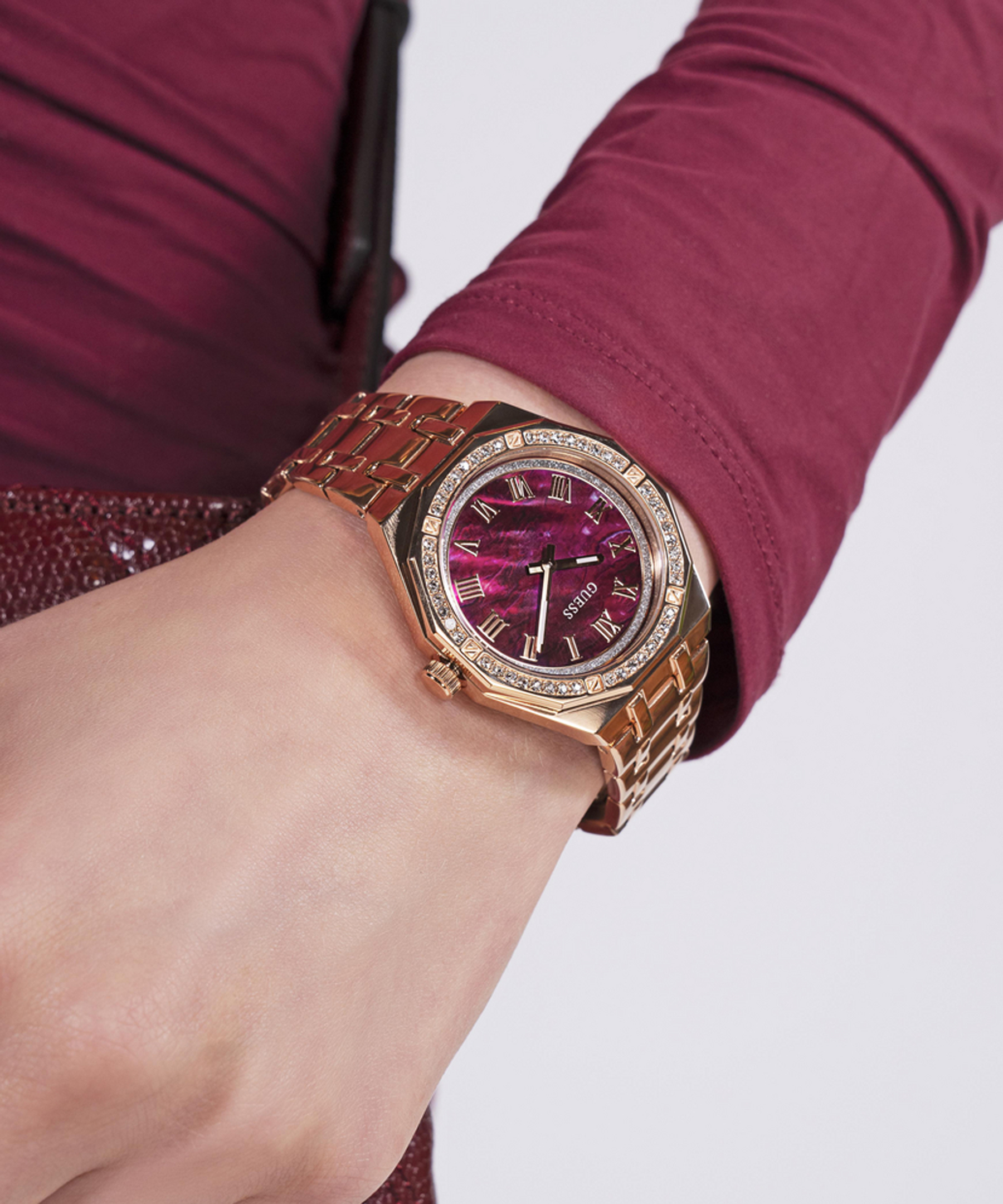 Перламутрово-фіолетовий циферблат красиво переливається на світлі, а витончені римські цифри та стрілки рожево-золотистого відтінку підкреслюють елегантність моделі. Безель дванадцятикутної форми прикрашений кристалами, додаючи вишуканого акценту.