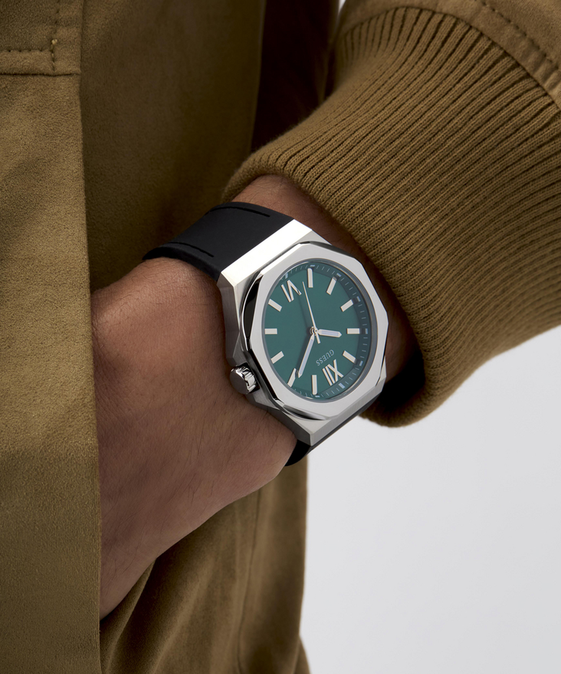 В оснащенні годинника використано надійний японський механізм Miyota. Годинник має сталевий корпус і чорний силіконовий ремінець, що додає йому спортивної елегантності та зручності. Діаметр корпусу 41,5 мм, висота 10 мм робить годинник ідеальним для будь-якої ситуації. Зелений аналоговий циферблат захищений міцним мінеральним склом, яке забезпечує надійний захист від подряпин і механічних пошкоджень. Водозахист 5 АТМ.