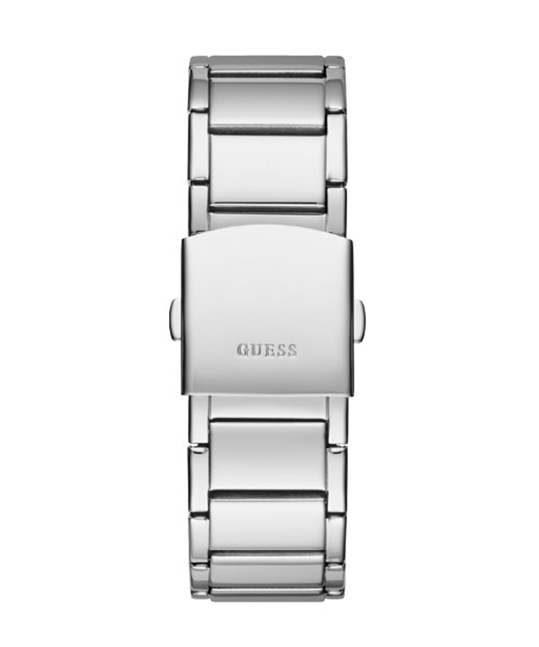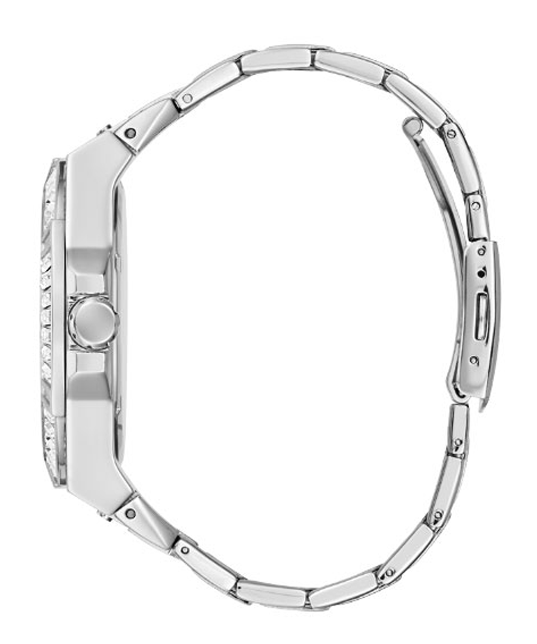 Оригінальний годинник відомого американського бренду GUESS. В годиннику встановлено надійний кварцовий механізм Miyota. Сталеві Silver Tone корпус та браслет. Діаметр корпусу – 47 мм. Застібка – складана кліпса. Безель прикрашений кристалами. Стрілки та індекси часу з люмінесцентним покриттям. Складний циферблат, що показує дату та день тижня, особливо міцне мінеральне скло та водозахист у 5 атм – все це якісні доповнення до дорогого, романтичного образу.