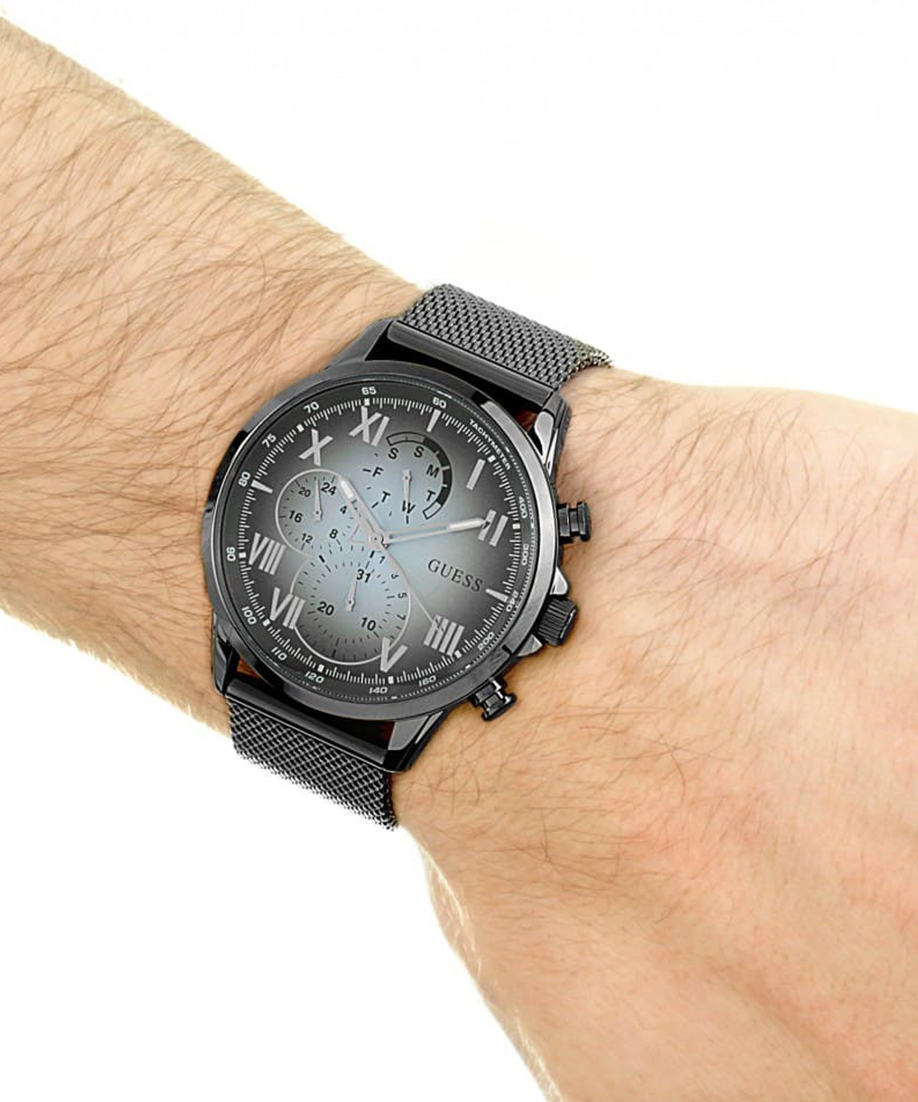 Чоловічий наручний годинник GUESS W1310G1 в класичному стилі з тахіметром. Годинник оснащений мультифункціональним кварцовим механізмом. Корпус годинника виготовлений з високоякісної нержавіючої сталі. Діаметр корпусу 44 мм. Аналоговий циферблат із датою, днем тижня, 12/24 годинним форматом часу. Циферблат захищений мінеральним склом, стійким до виникнення подряпин. Стрілки із люмінесцентним покриттям. Годинник комплектуються браслетом міланського плетіння з застібкою, що розкладається. Ширина ремінця: 22 мм. Водозахист 3АТМ.