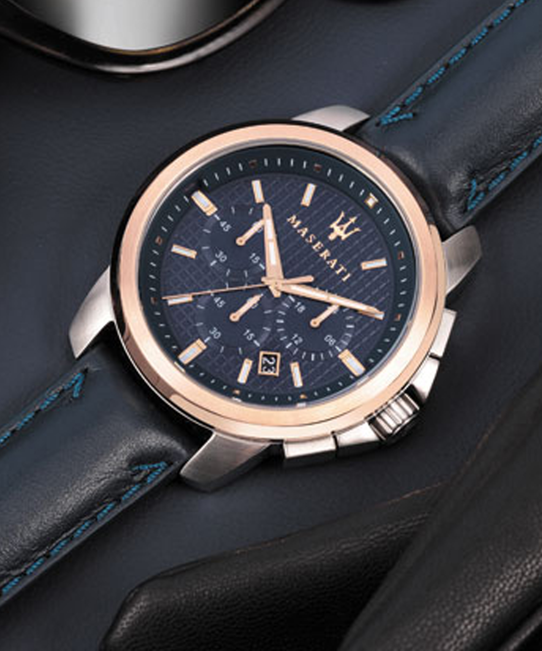 Оригінальний годинник-хронограф з високоточним японським механізмом — вишукана інтерпретація естетики Maserati у формі аксесуару. Корпус моделі виготовлений із нержавіючої сталі у двох благородних відтінках — рожевого золота та срібла, які гармонійно поєднуються з глибоким синім циферблатом.