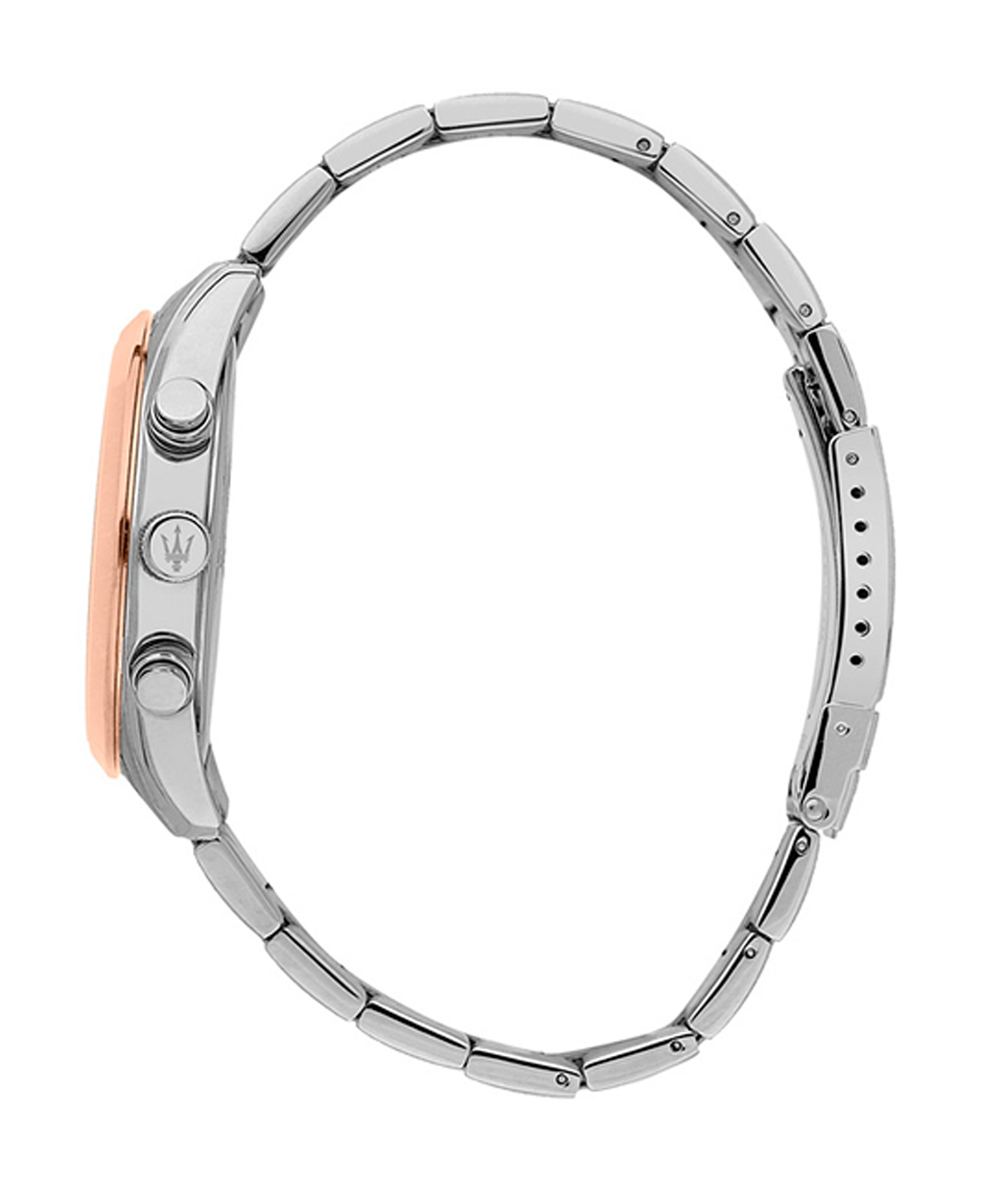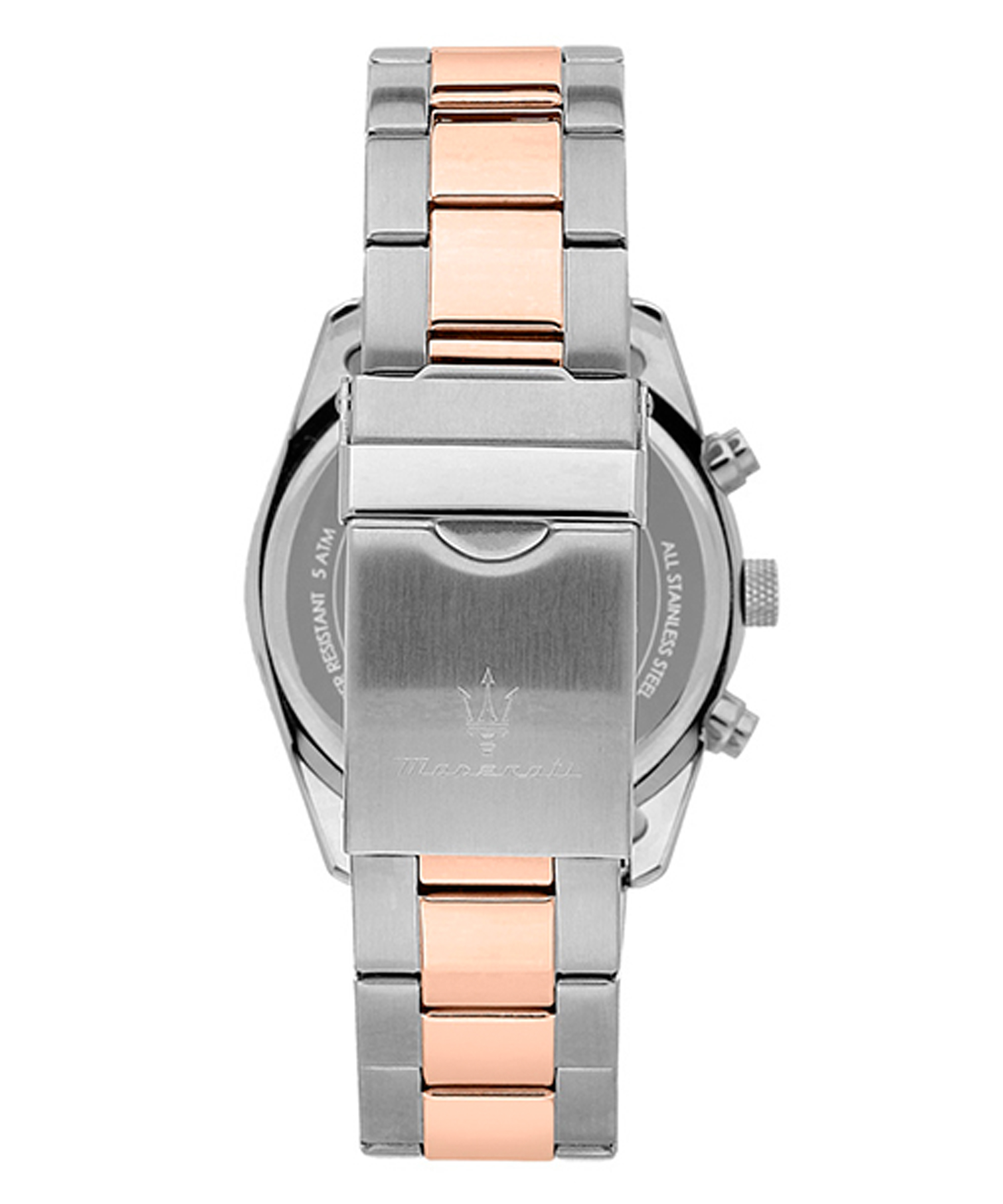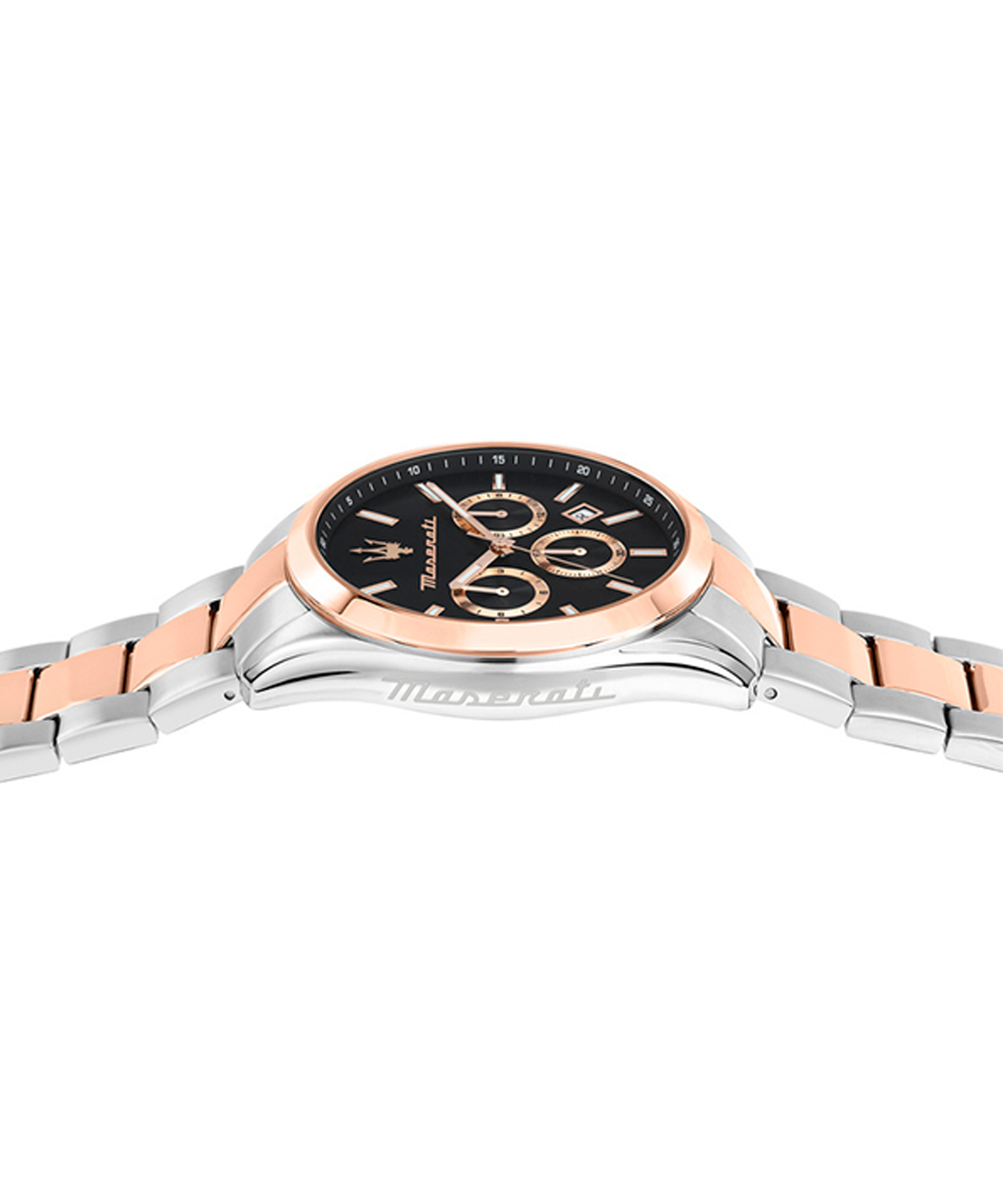 Чоловічий багатофункціоналний годинник MASERATI. Колекція ATTRAZIONE. В годиннику встановлений надійний кварцевий механізм. Сталеві з комбінованим покриттям "ROSE GOLD" та "SILVER" корпус і браслет. Застібка - складна кліпса. Чорний аналоговий циферблат із точними хронографами та витонченими індексами підкреслює італійську майстерність та увагу до деталей. Стрілки з люмінесцентним покриттям. Міцне мінеральне скло надійно захищає циферблат годинника. Водозахист - 5 АТМ.