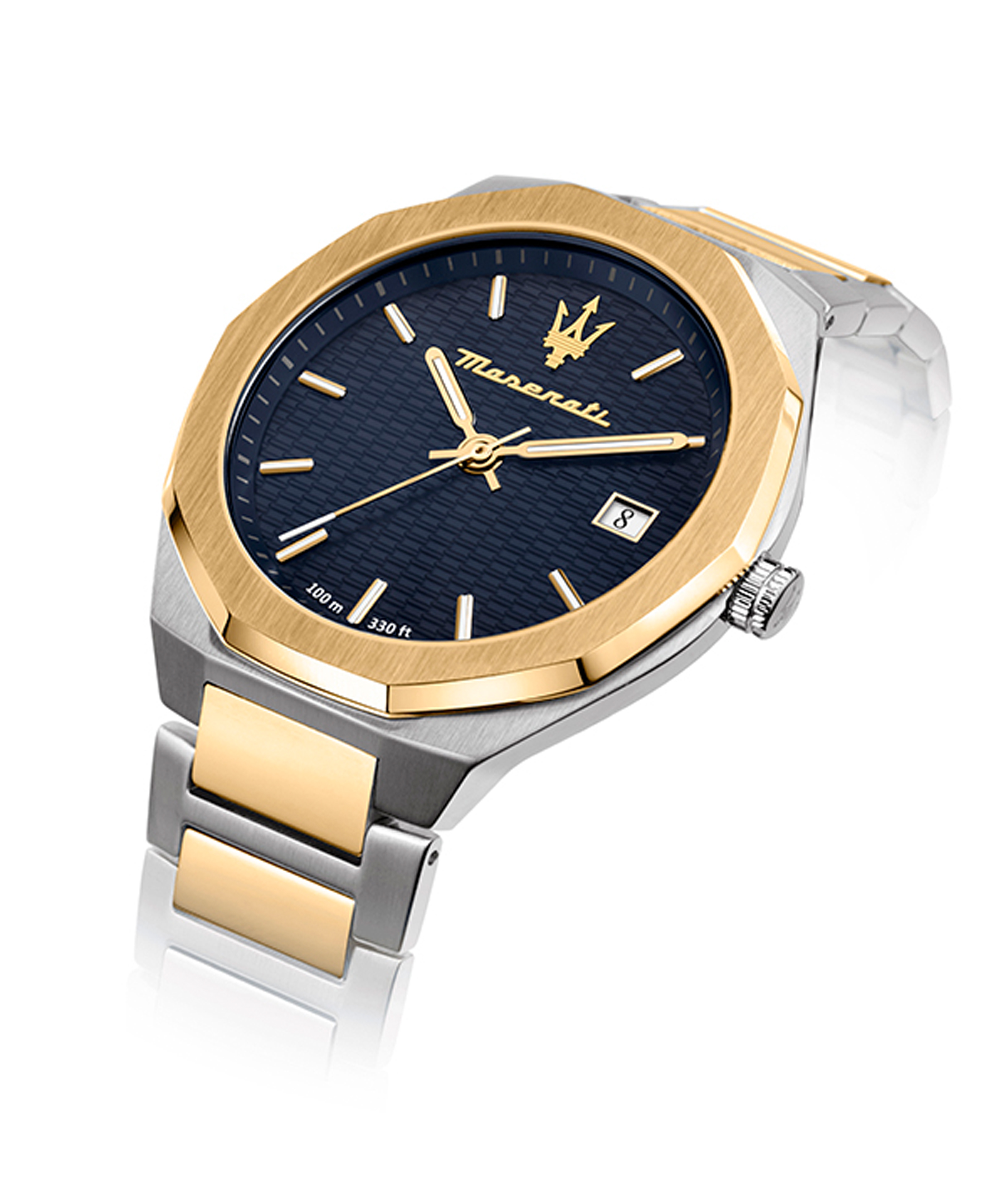 Чоловічий наручний годинник Maserati R8853142007 з встановленим кварцовим механізмом. Стальний корпус діаметром 45 мм. Браслет із комбінованим золотисто-срібним покриттям. Додатково на блакитному циферблаті відображення дати. Водозахист: 10 АТМ. Мінеральне скло.