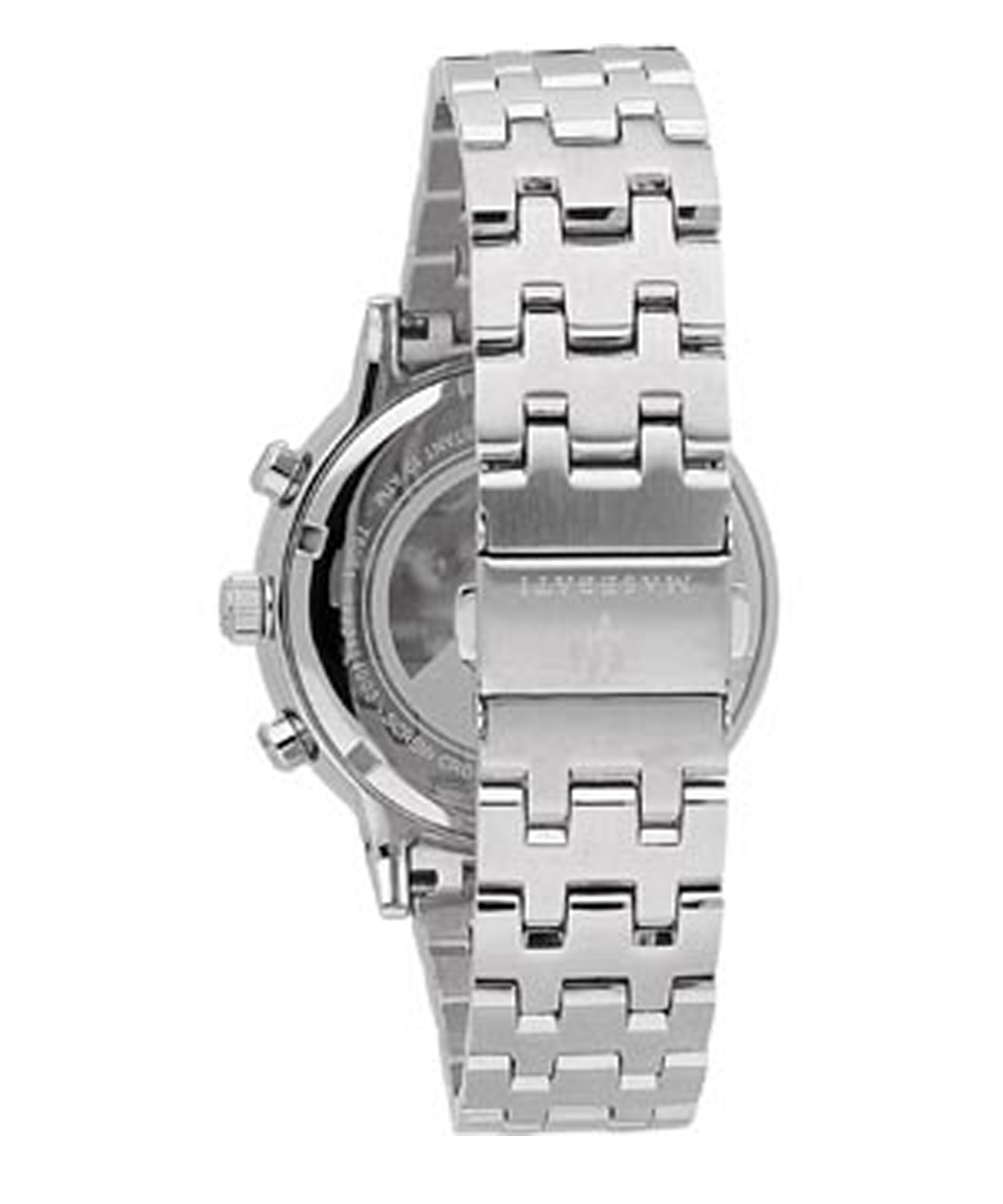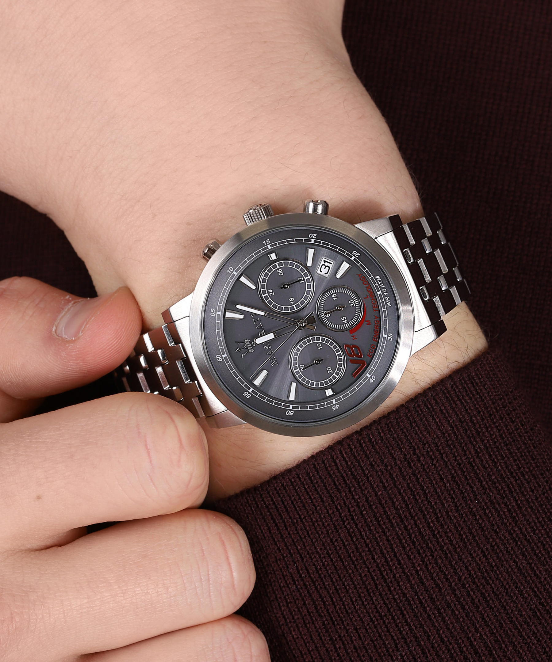 Годинник - хронограф Maserati з високоточним японським механізмом гарантує точність і довговічність роботи годинників, а креативне оформлення дивує здатністю дизайнерів створити стійки асоціації з автомобільною тематикою. Помічали, що під час руху по нічному шоссе на панелі приборів відображаються дорожні вогні? Погляньте на яскраво червоний декор циферблату: складаєтсья відчуття, що від ось-ось виник, і в мить зникне, як тільки Ви промайнете повз сяючі вітрини?