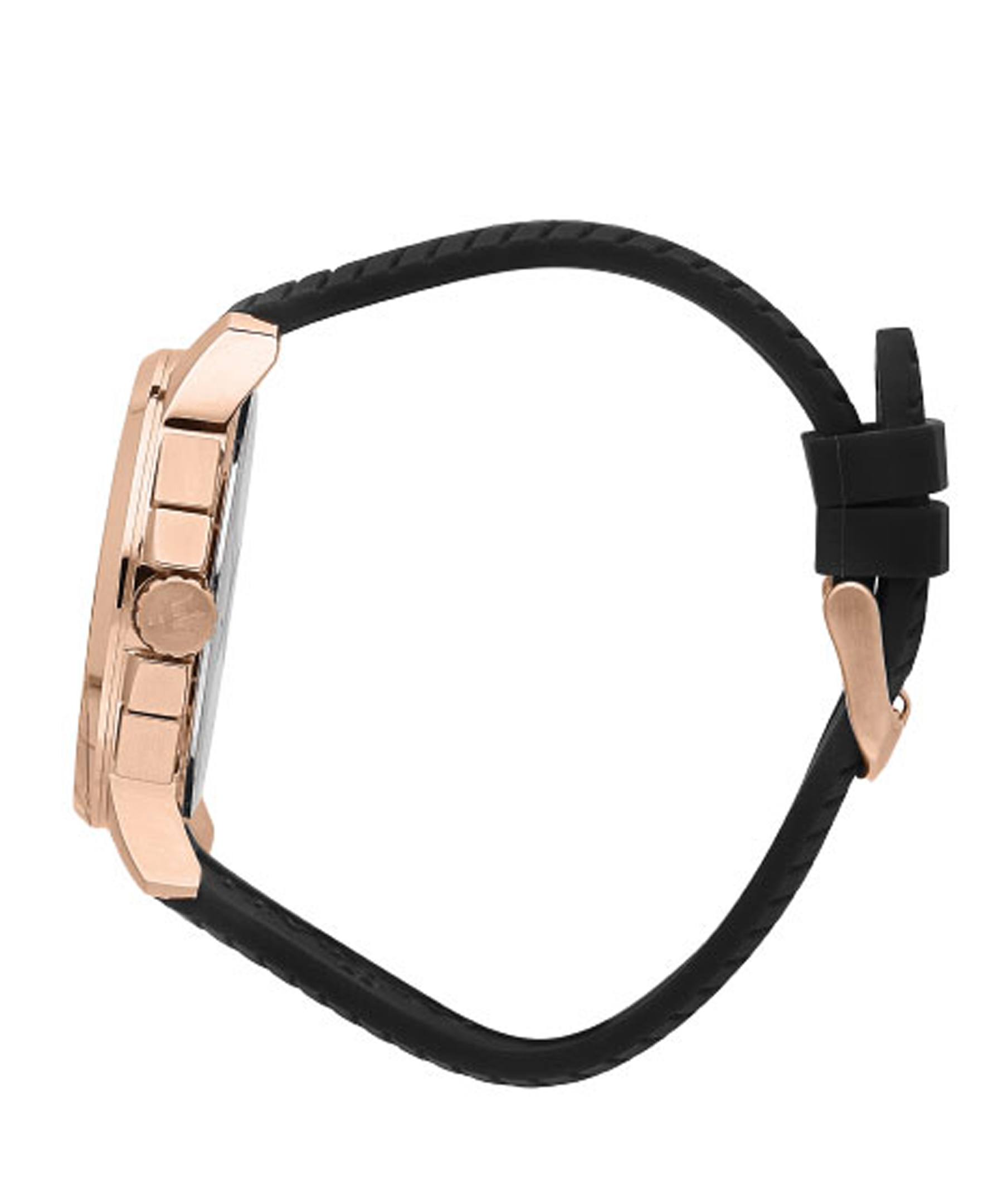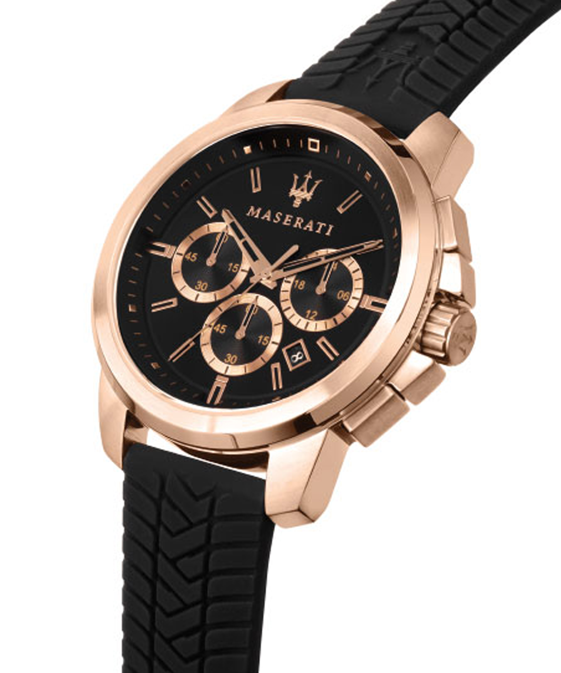 Чорний ремінець, що нагадує протектор колеса спортивного автомобіля, чорний циферблат, подібний до спідометра, а також корпус і тризуб з металу кольору рожевого золота додають годиннику мужньої харизми та витонченого шику. Діаметр корпусу — 44 мм, що забезпечує оптимальний баланс між елегантністю та комфортом. Водозахист 5 атм гарантує надійність в умовах активного використання.