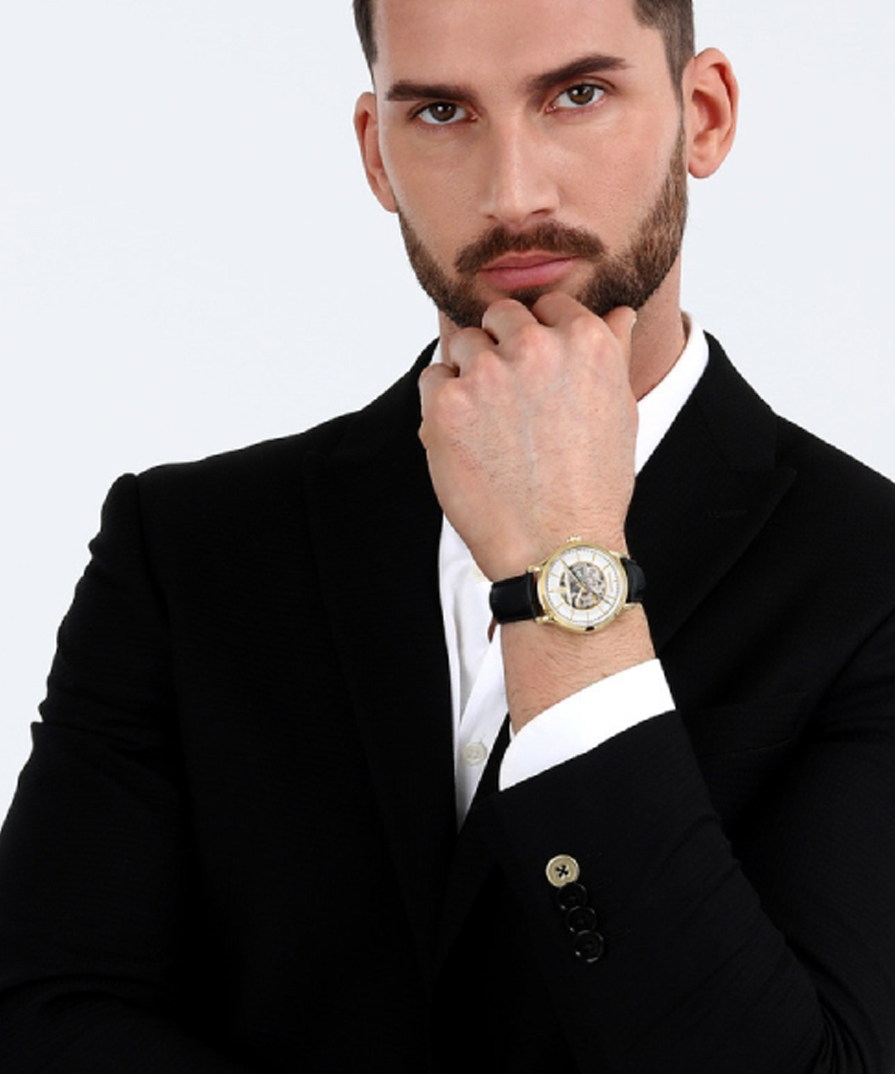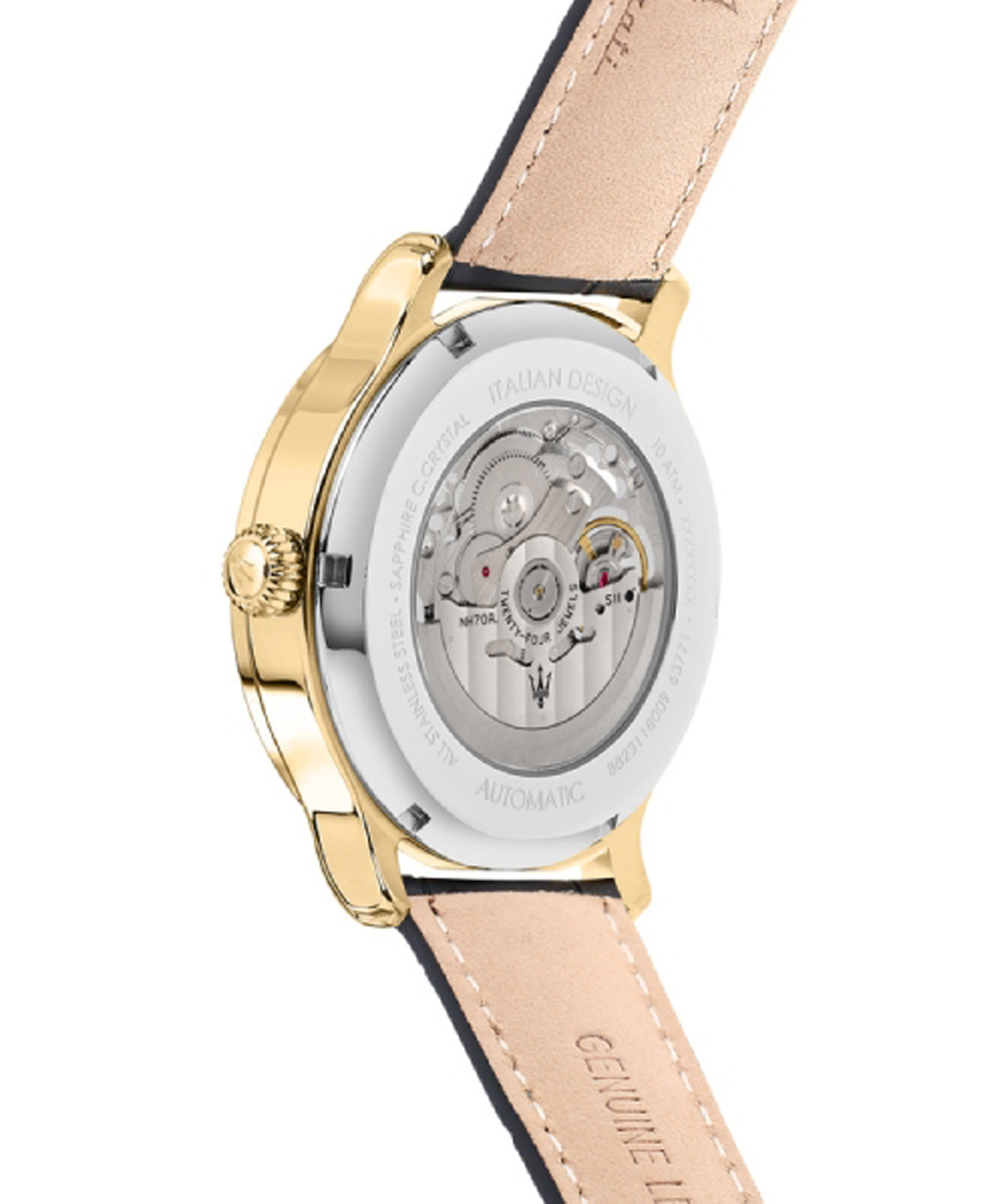 Чоловічий наручний годинник-скелетон MASERATI R8821118011 з колекції EPOCA. В годиннику встановлений механізм Seiko NH70A. Сталевий з золотистим покриттям корпус діаметром 42 мм, товщина - 13 мм. Коричневий шкіряний ремінець. Аналоговий циферблат захищений сапфіровим склом. Водозахист - 10 АТМ.