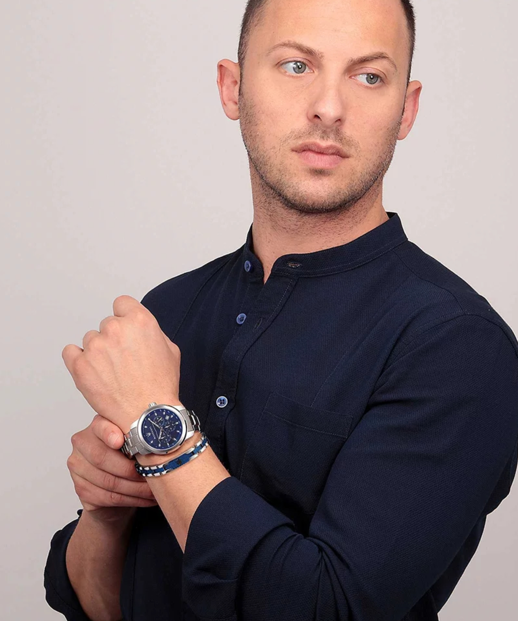 Глибокий синій циферблат оздоблений сріблястими стрілками та часовими мітками, що забезпечують чітке зчитування часу. Три додаткові циферблати виконують функції хронографа та 24-годинного формату часу, додаючи функціональності та динамічності дизайну. Віконце дати розташоване між позначками 4 та 5 годин, що додає додаткової зручності.