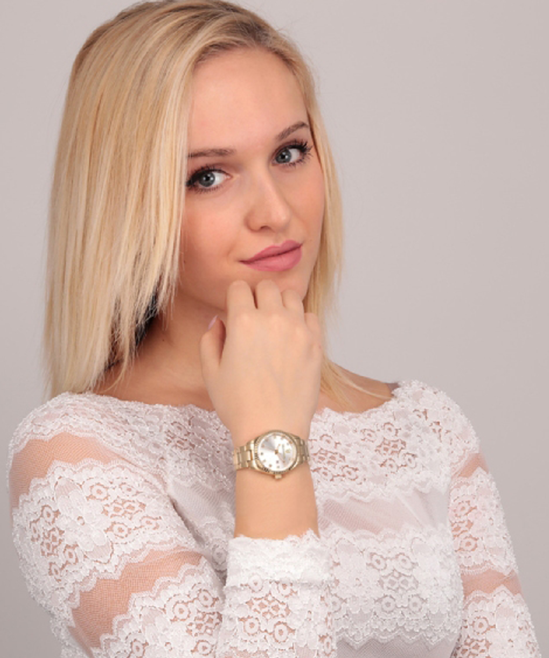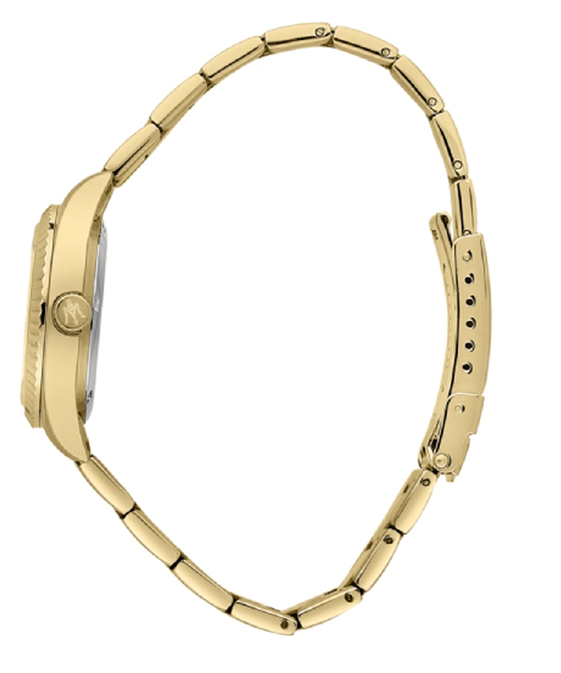 Сталевий корпус і браслет з PVD покриттям Gold створюють неповторний візуальний ефект, що підкреслює елегантність і витонченість. Цікавим акцентом є циферблат білого кольору, де замість традиційних міток часу — сяючі кристали, що надають годиннику додаткового шарму.