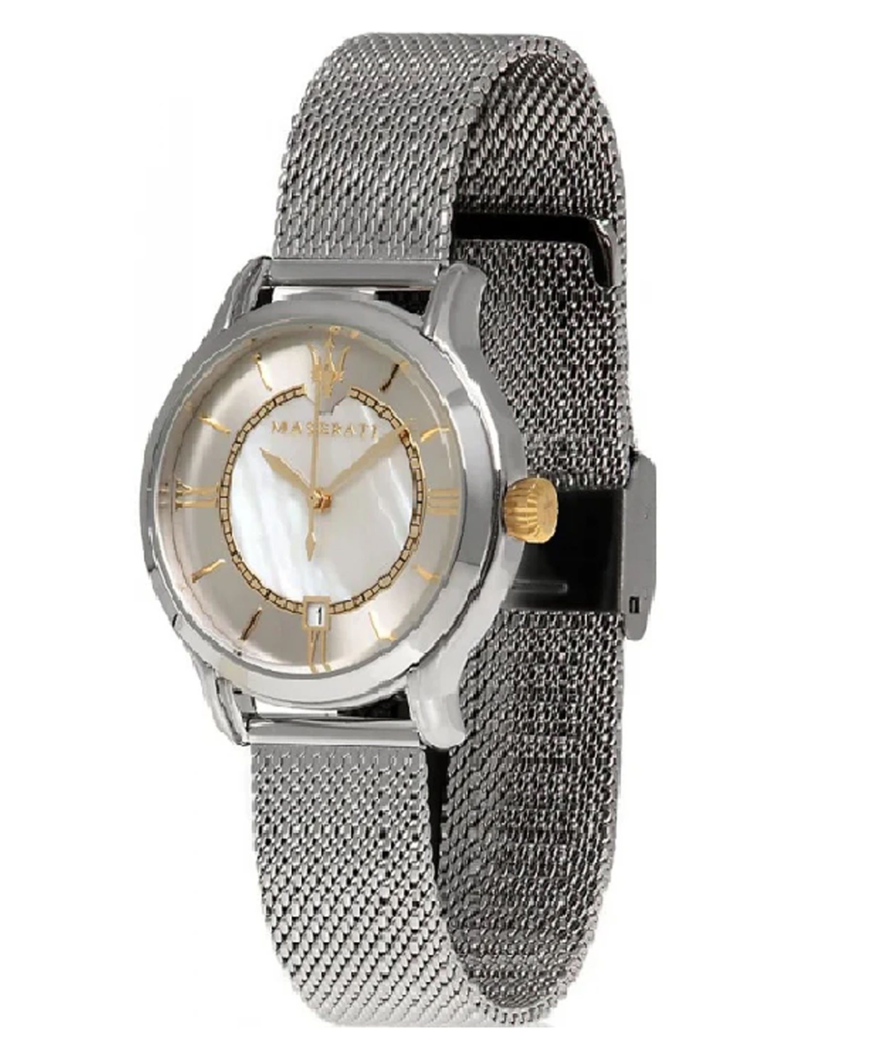 Оригінальний жіночий годинник MASERATI R8853118514 з колекції EPOCA. В годиннику встановлений надійний кварцовий механізм. Сталевий з золотистим покриттям корпус та браслет. Застібка - складна кліпса. Діаметр корпусу - 34 ммм, товщина - 9 мм. Перламутровий циферблат захищений мінеральним склом. Золотисті мітки часу. Водозахист - 10 АТМ.
