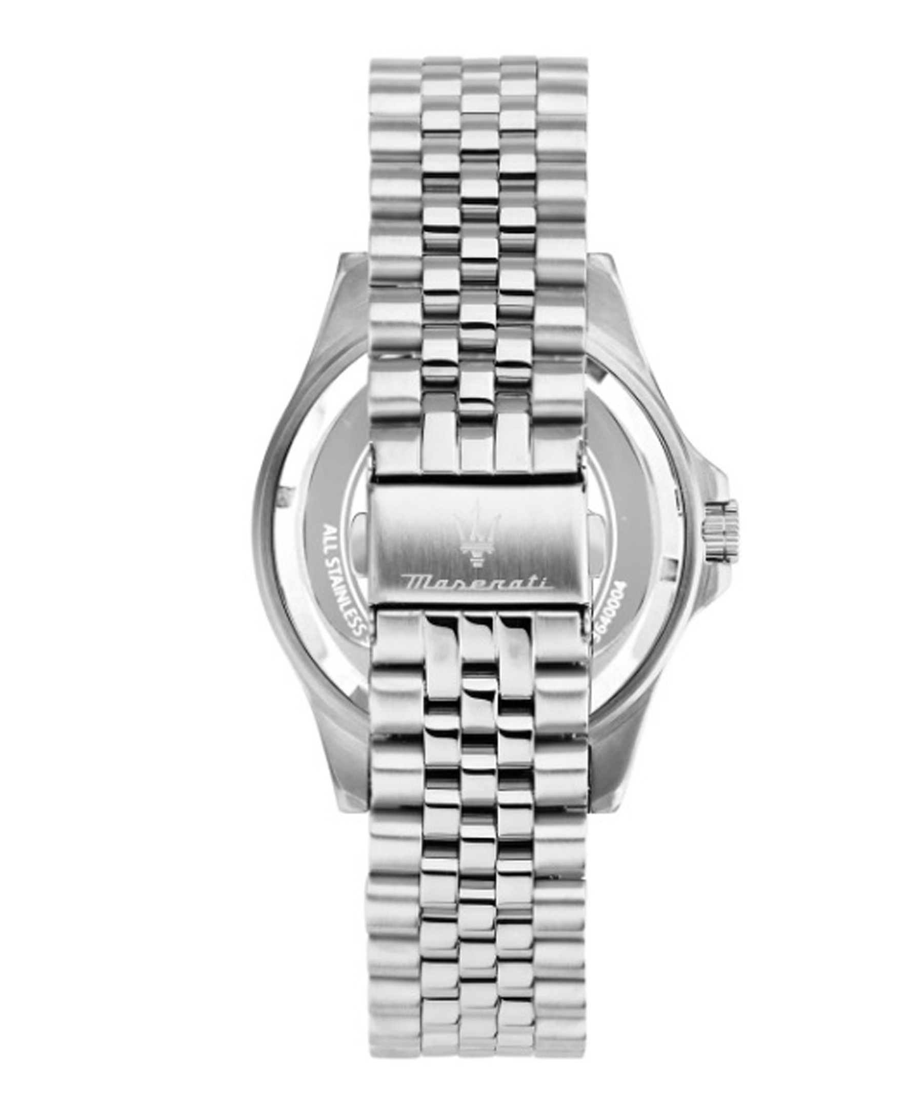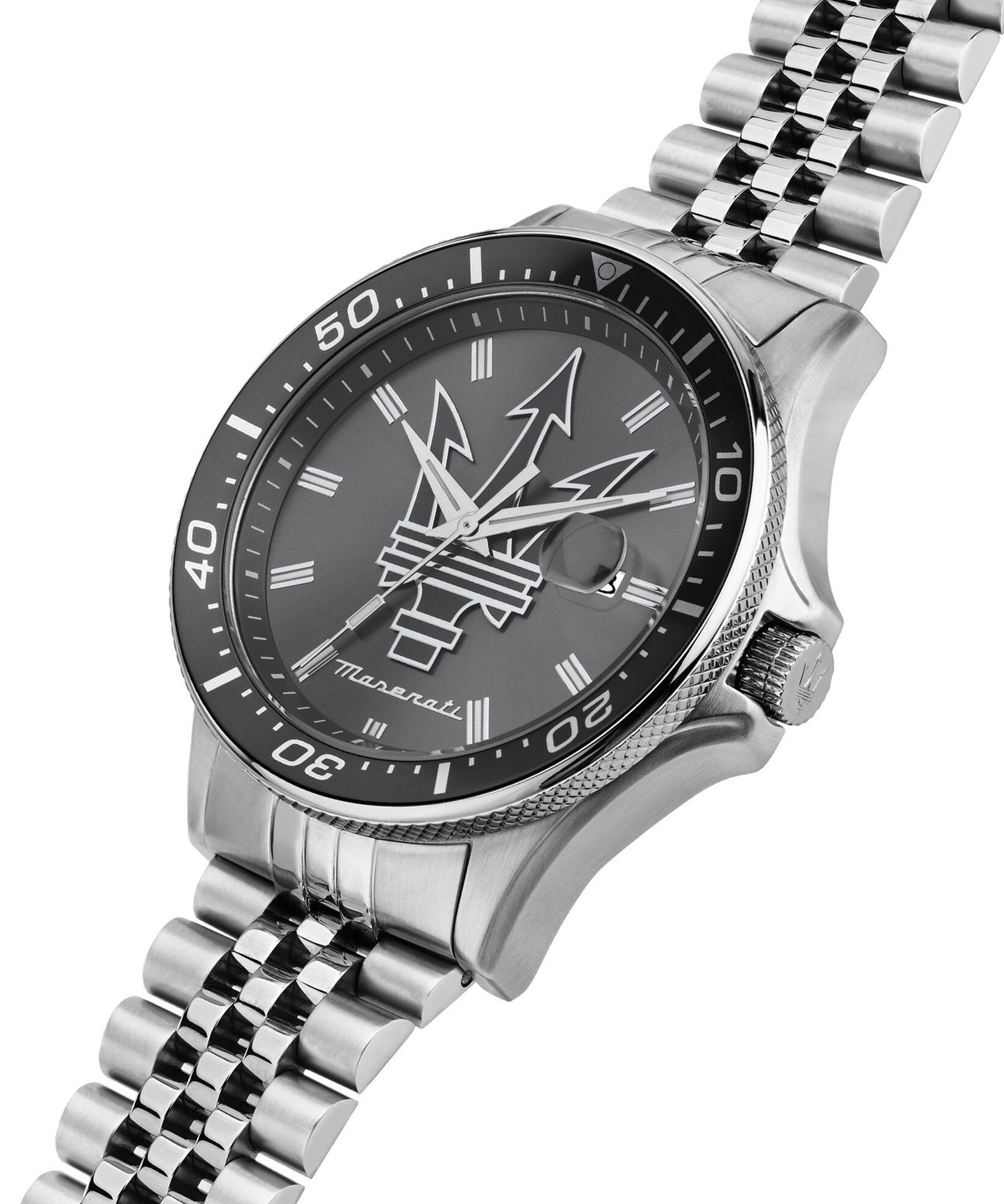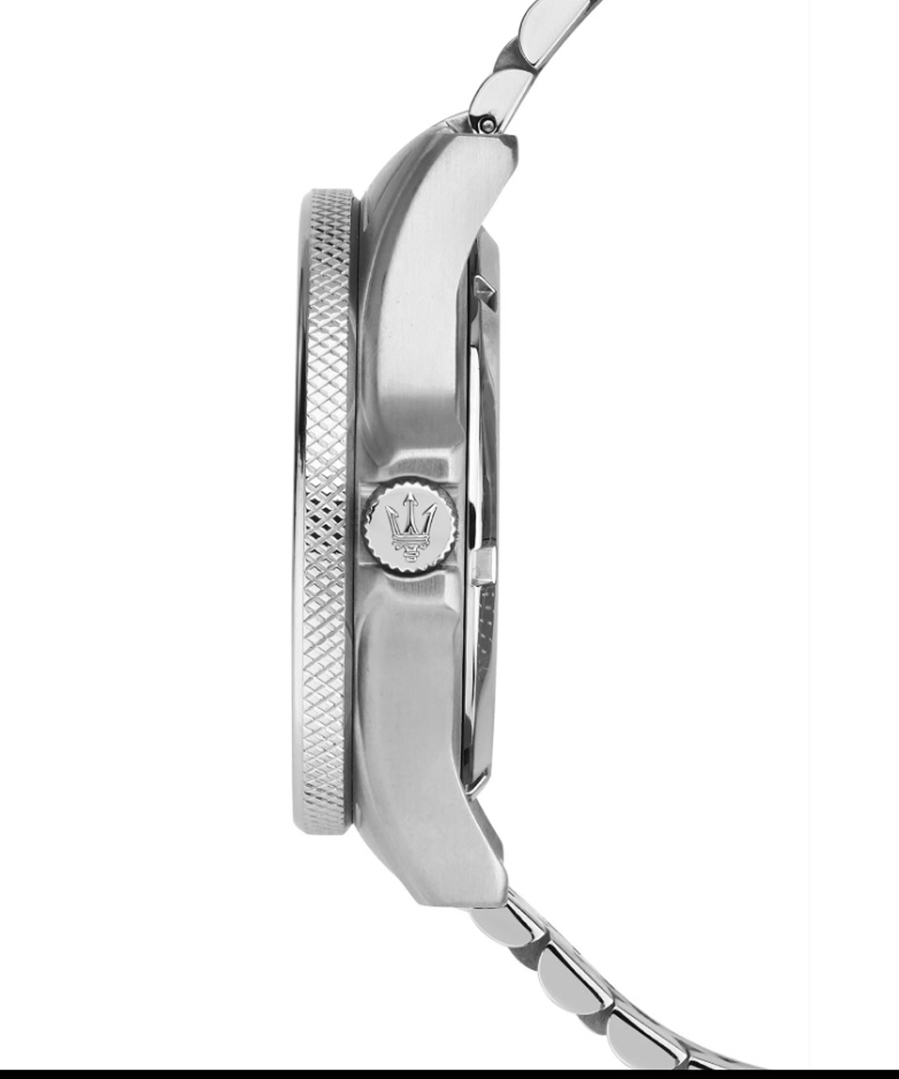 Сірий циферблат оздоблений великим логотипом Maserati, надає годиннику унікального та запам'ятовуваного вигляду. Сріблясті стрілки та часові мітки забезпечують чітке зчитування часу, а віконце дати, розташоване на позначці 3 години, додає практичності.