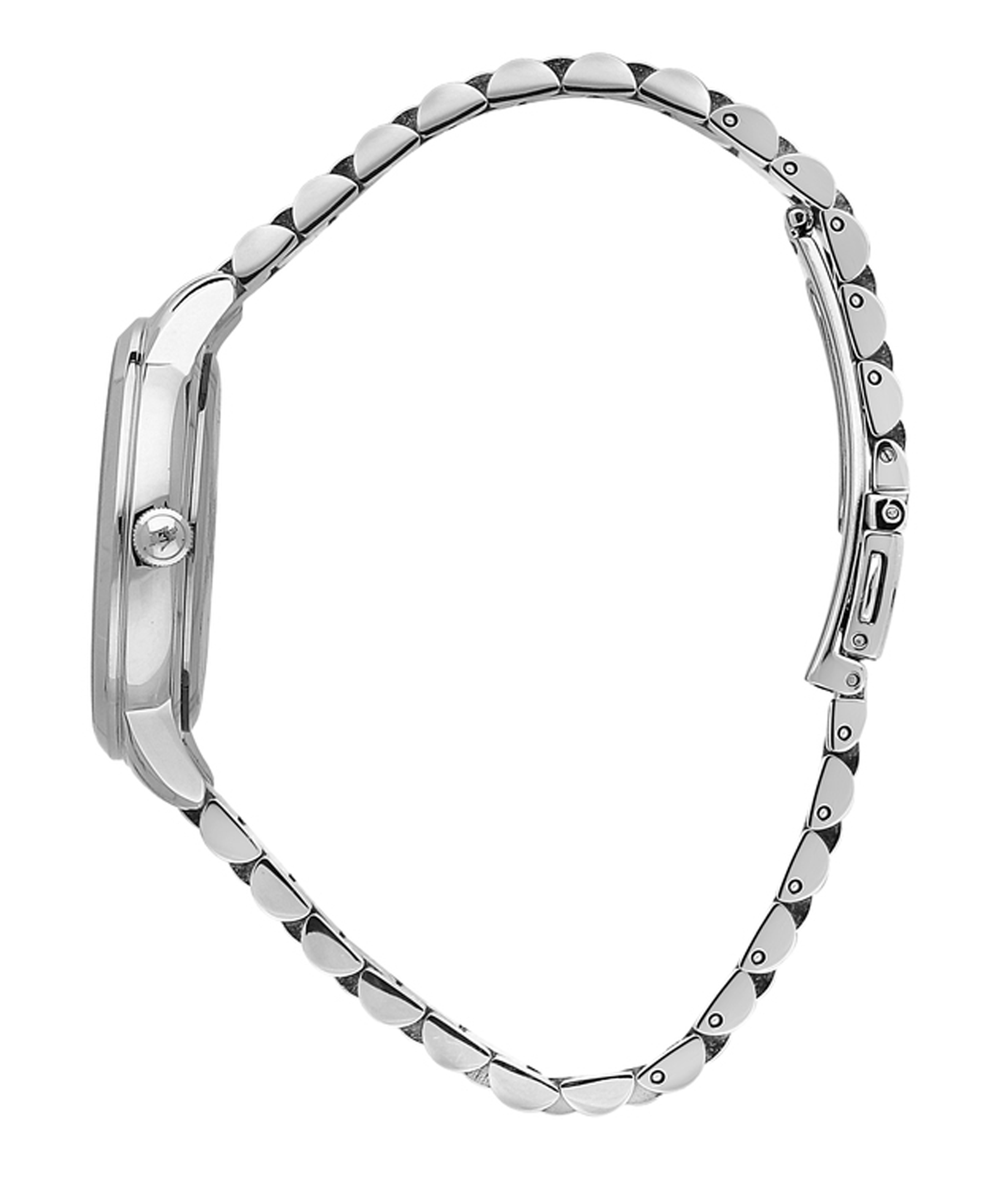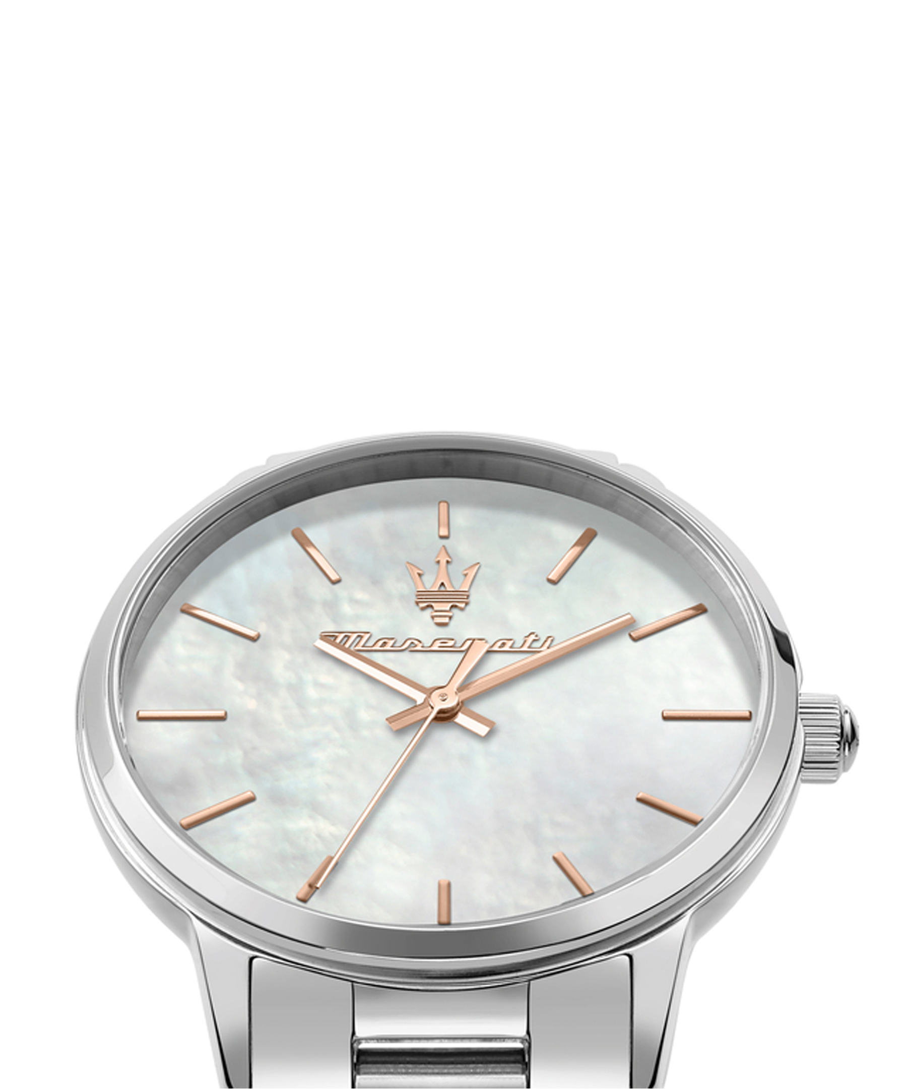Класичний жіночий годинник MASERATI R8853147507 з надійним кварцовим механізмом. Сталевий корпус та браслет. Діаметр корпуса 36 мм, товщина - 8 мм. Застібка - складна кліпса. Золотисті мітки часу та стрілки. Перламутровий аналоговий циферблат захищений мінеральним склом. Водозахист - 5 АТМ.