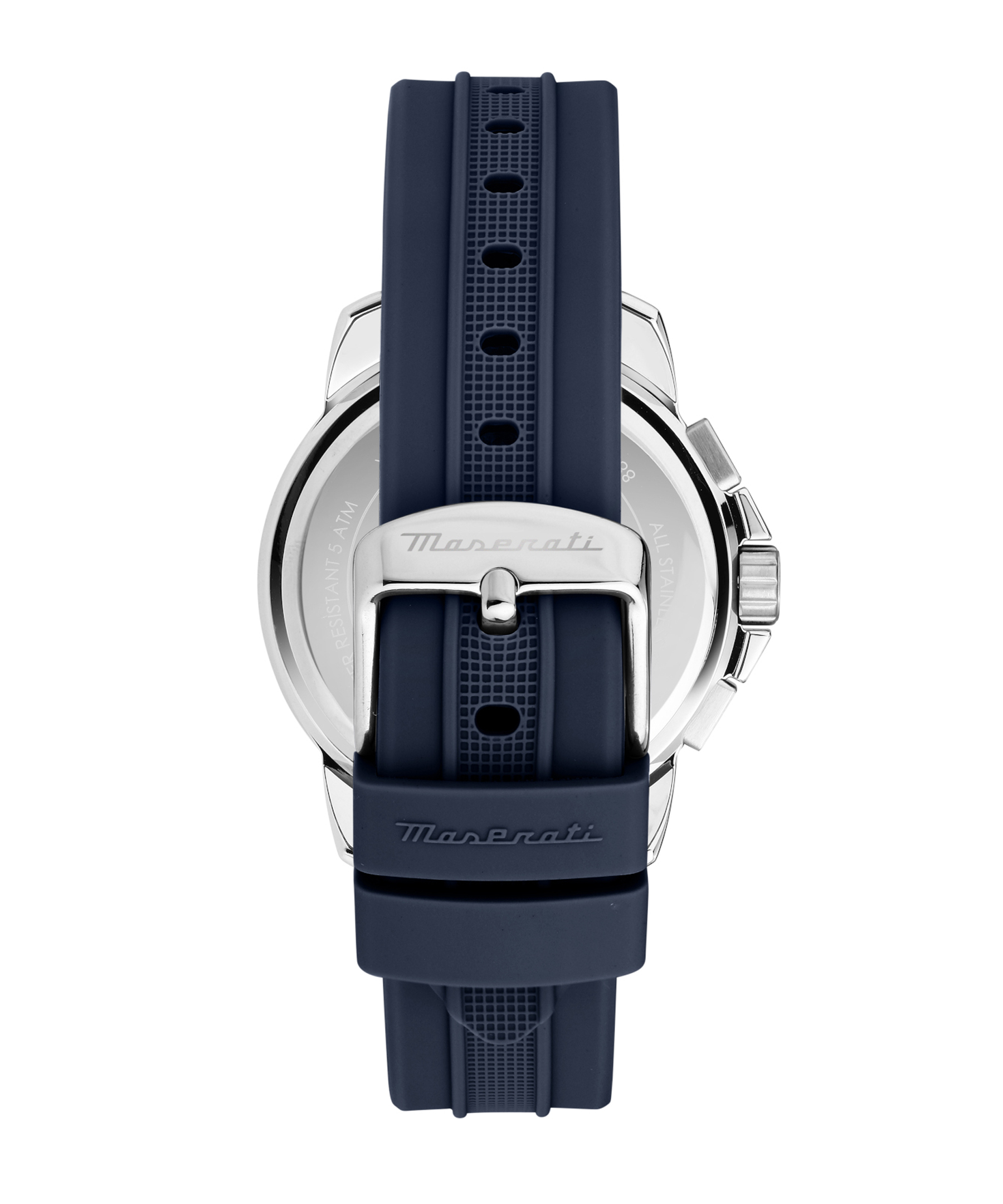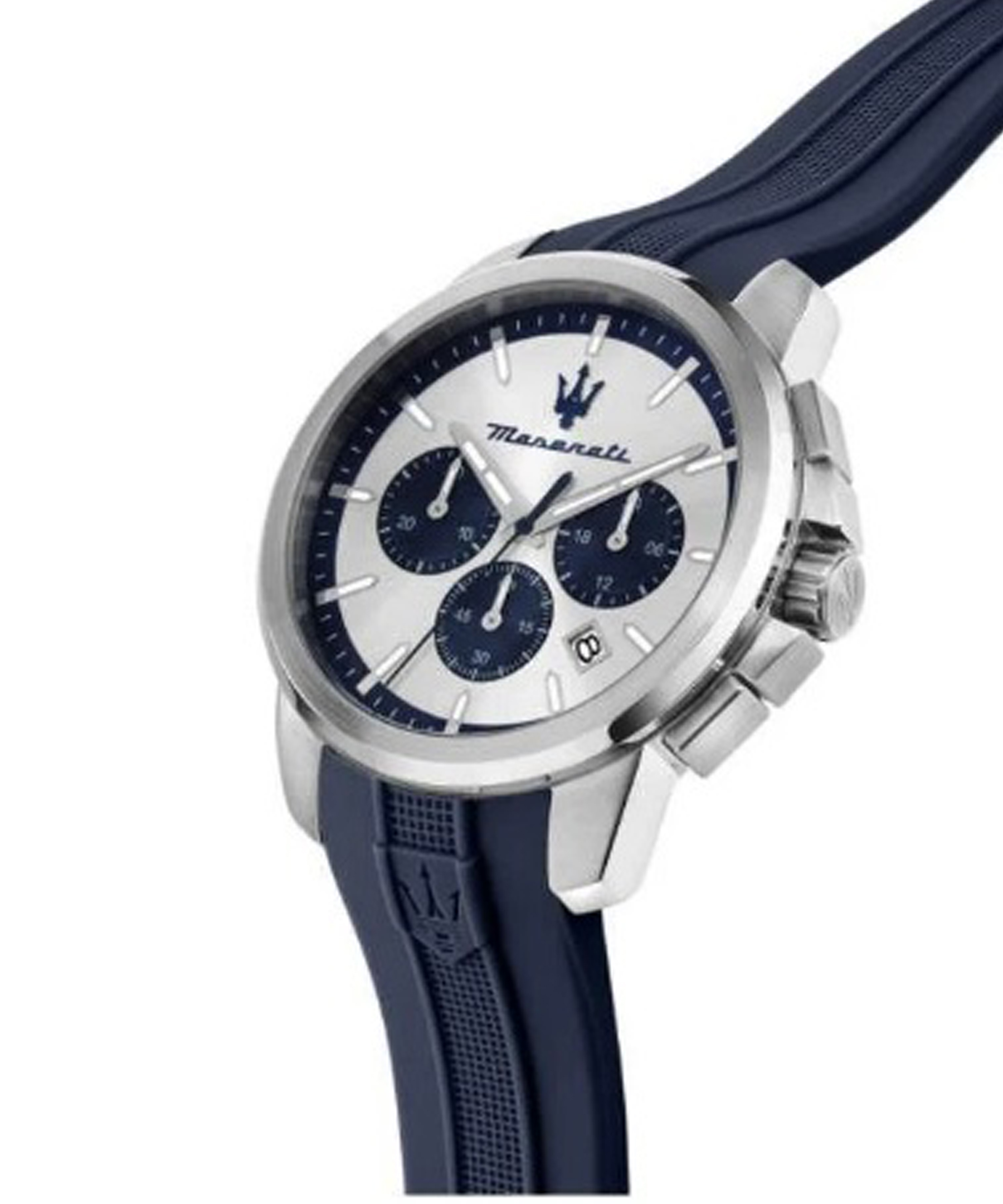 Чоловічий багатофункціональний годинник-хронограф MASERATI з колекції SUCCESSO. Сталевий корпус і стильний силіконовий ремінець синього кольору створюють міцну і водночас елегантну композицію, а діаметр корпусу 42 мм додає годиннику виразності та рішучості.