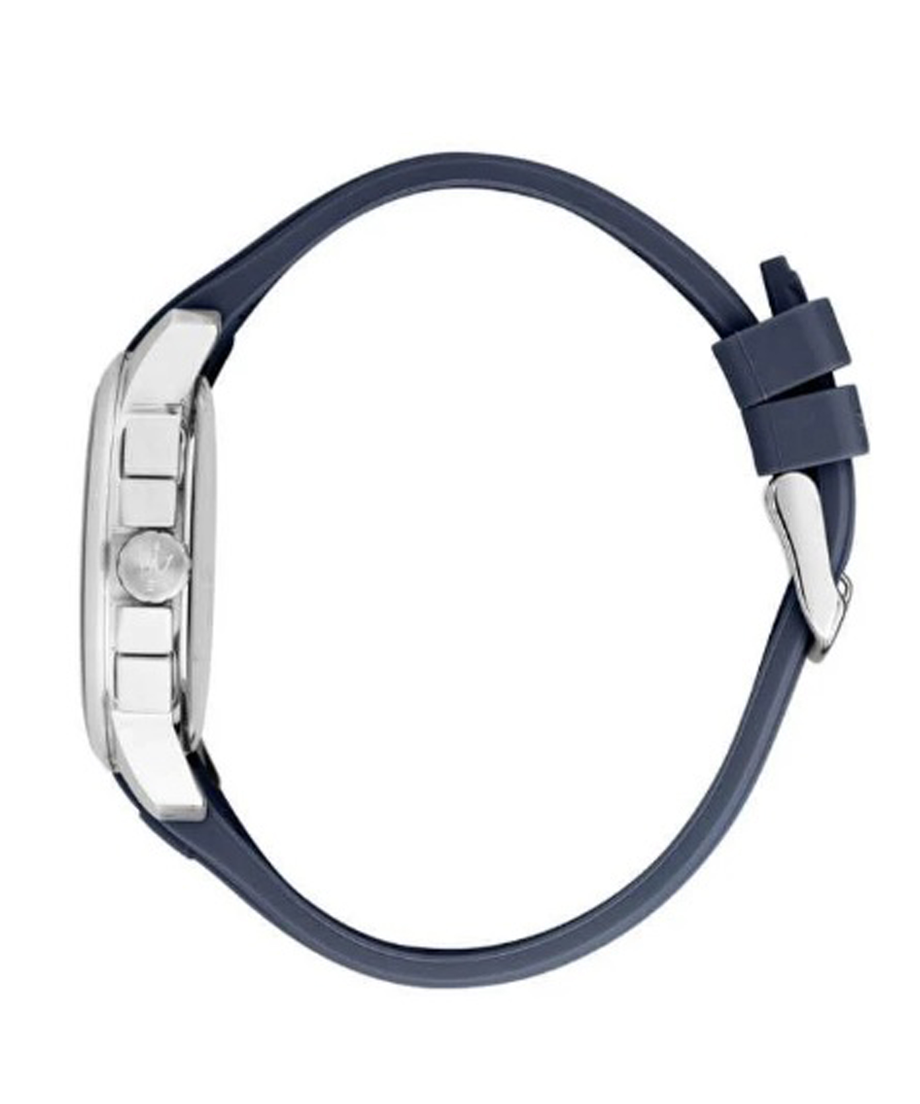 Аналоговий циферблат сріблястого кольору в контрасті з синім акцентує увагу на кожній деталі, підкреслюючи стиль і технологічність. Люмінесцентні стрілки та мітки часу забезпечують зручність у читанні показників навіть за слабкого освітлення. Додаткове віконце для дати, 24-годинний формат часу та вбудований хронограф додають функціональності та практичності.
