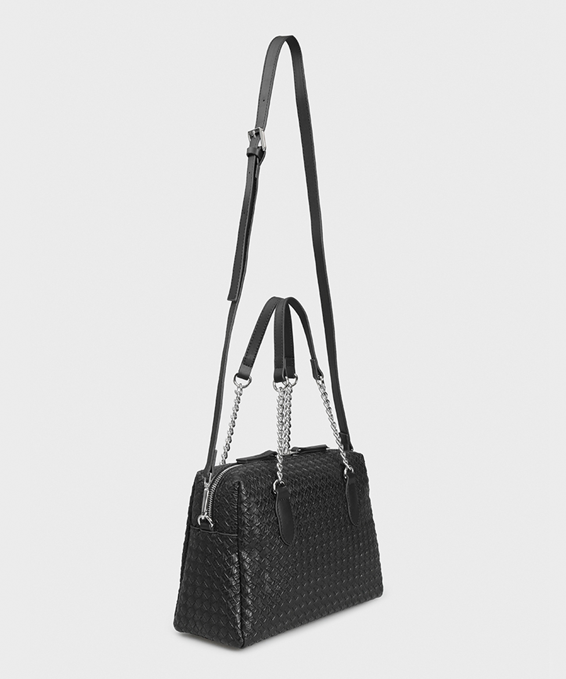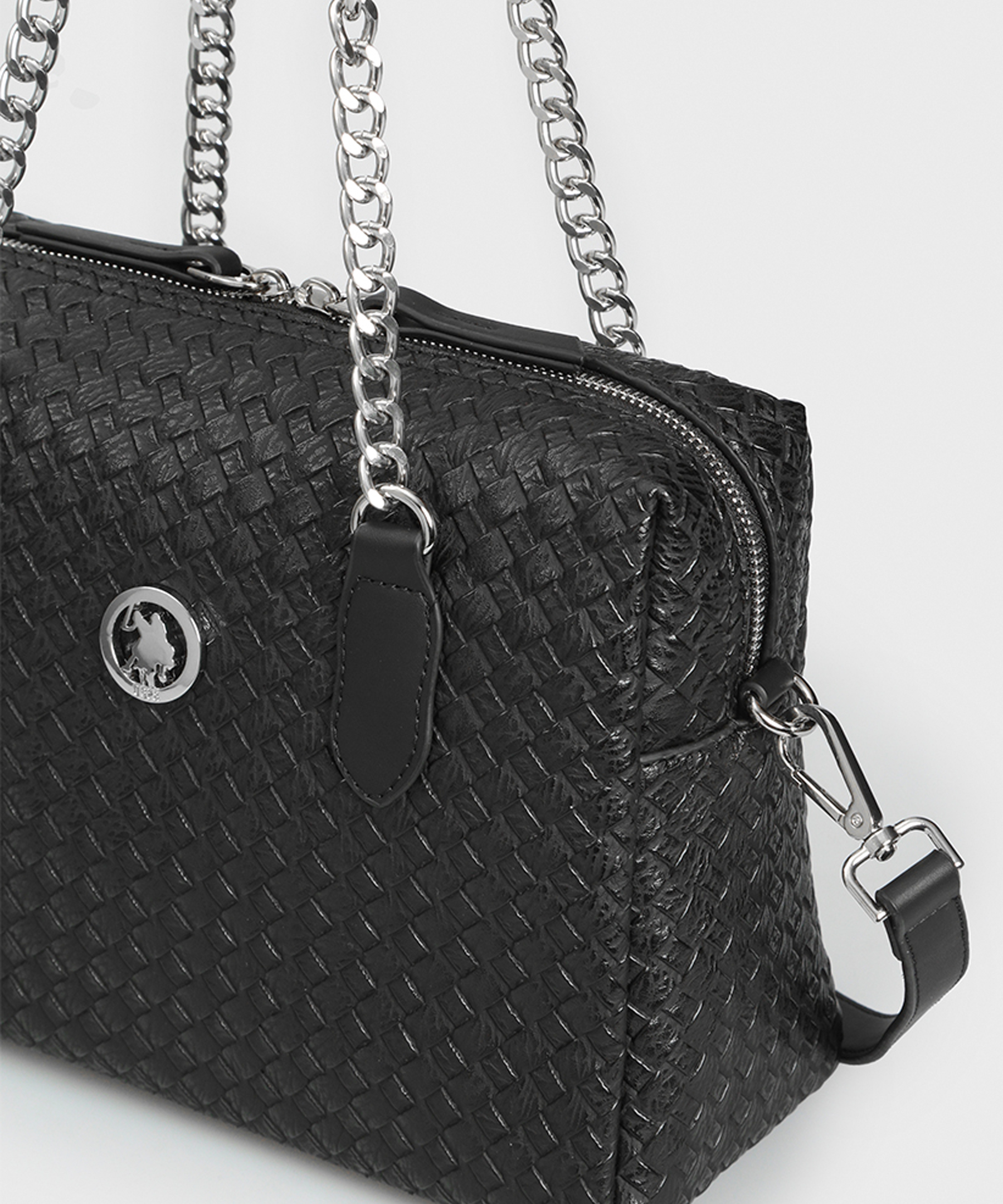 Стильна сумка популярного американського бренду U.S. Polo Assn виконана з PVC - екошкіри чорного кольору з тисненням, що нагадує плетіння. Дві зустрічні блискавки, що закривають сумку, поєднуються з ланцюжками на ручках. Логотип бренду з якісної сталі гармонійно вписується у дизайн моделі. Додаткова довга ручка дозволяє носити сумку не тільки в руках, але і на плечі. Міцна, легка, із зносостійкою підкладкою всередині, сумка ще й дуже естетично приваблива.Завдяки універсальності форми та кольору, сумочка вдало впишеться у Ваш гардероб та прослужить довгі роки. Компанія U.S. Polo Assn не використовує шкіру тварин з принципових міркувань, дотримуючись гуманної політики захисту наших менших братів. Приєднуйтесь! І світ стане добрішим!
