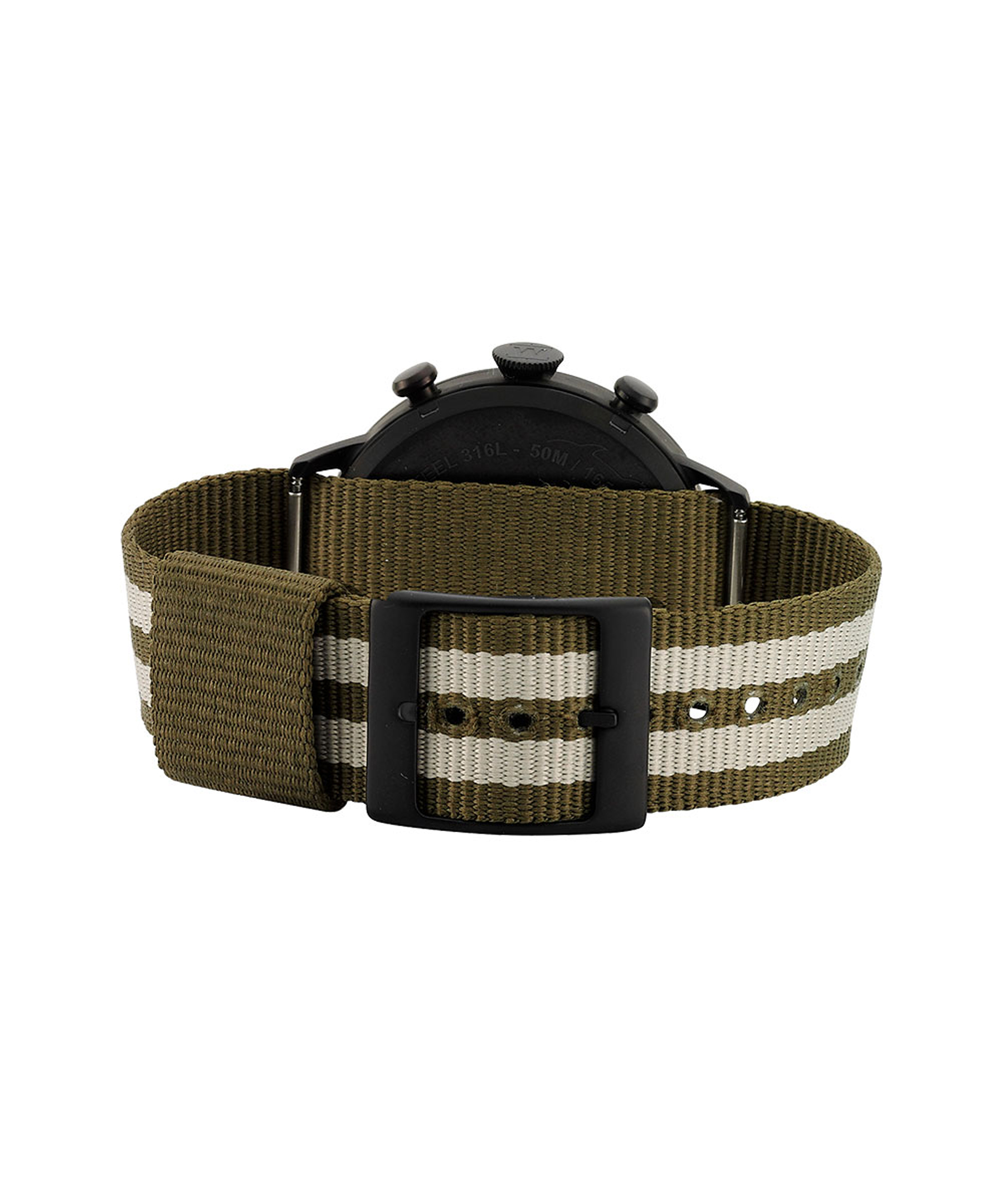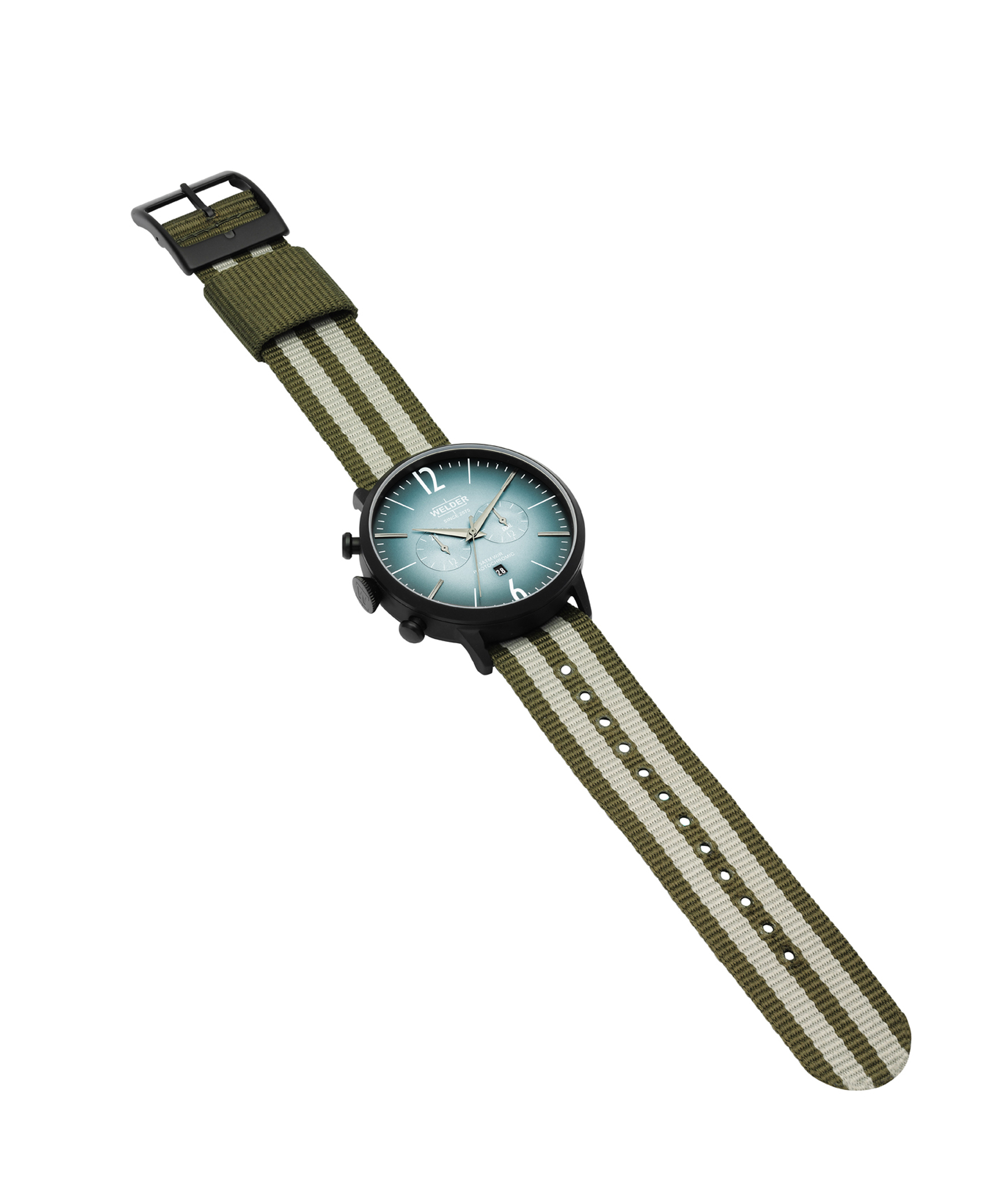 Універсальний, стильний, ультратонкий годинник Welder з надійним японським механізмом Miyota виконаний з високоякісної сталі з покриттям чорного кольору. Циферблат з фотохромним куполоподібним склом надає годинникам незвичайного мерехтіння світла та вогню, зміни фантастичних форм, як на полотнах абстракціоністів. Зміна кольору скла залежить від освітлення, кута огляду і найменшого руху руки. Витончені стрілки і м'який, нейлоновий двосторонній ремінець кольору хакі завершують образ і надають аксесуару надзвичайну привабливість..