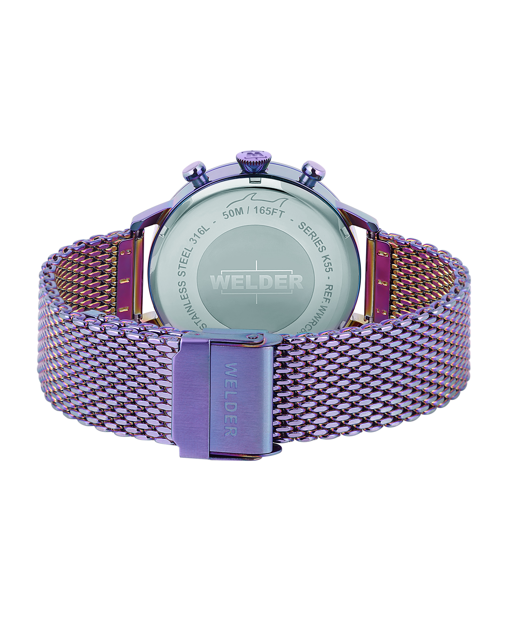 Жіночий годинник годинник популярної італійської компанії Welder з надійним японським механізмом Miyota виконаний з металу високої якості з PVD покриттям Purple. Три кнопки керування механізмом розташовані ліворуч від циферблата та крім прямого призначення виконують декоративну функцію. При згинанні руки не заважають, залишаючи свободу руху. Індикатор дати та мініциферблати з двома часовими поясами створюють особливе відчуття часу. Мінеральне фотохромне куполоподібне скло - відмітна ознака бренду, що надає годинникам магічне мерехтіння світла і фарб. Зміна фарб залежить від освітлення, кута огляду та найменшого руху руки. Діаметр корпусу 38 мм. Металевий браслет у техніці міланського плетіння комфортно фіксує аксесуар на зап'ясті. Водозахист 5 АТМ.