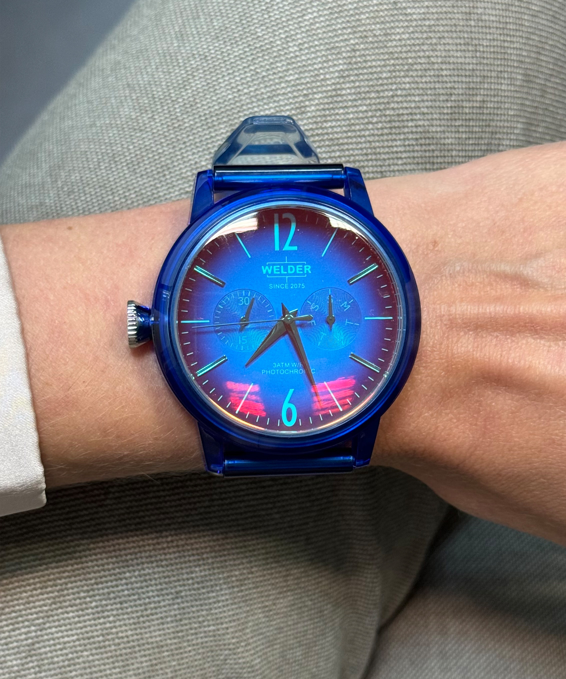 Оригінальний годинник популярної італійської компанії Welder з багатофункціональним японським механізмом Miyota виконаний в яскравій кольоровій гамі. Корпус із якісної сталі з PVD покриттям Blue, яскраво-синій силіконовий ремінець з логотипом бренду доповнюються головною відмітною ознакою - куполоподібним фотохромним склом, що заломлює світлові промені та змінює колір залежно від освітлення та нахилу руки.Мінеральний склад скла надає йому особливої міцності та прозорості. На циферблаті два індикатори дати та днів тиждня. Діаметр корпусу 45 мм. Індустріальний стиль, висока функціональність, якісні матеріали та приємна ціна. Годинник для людей, які шукають яскравих емоцій та бачення майбутнього.