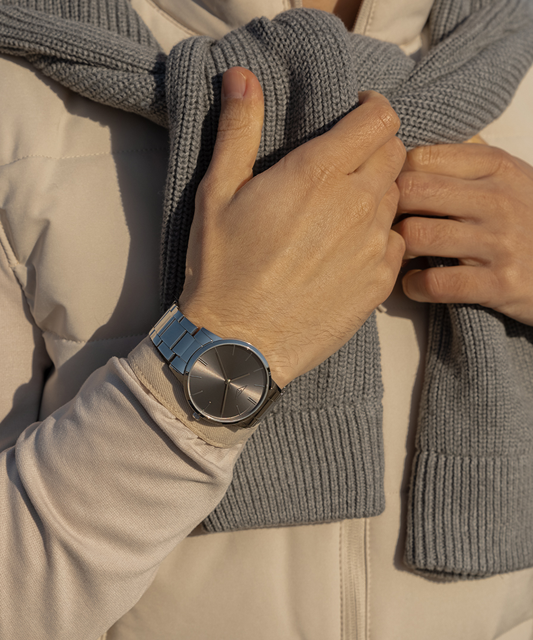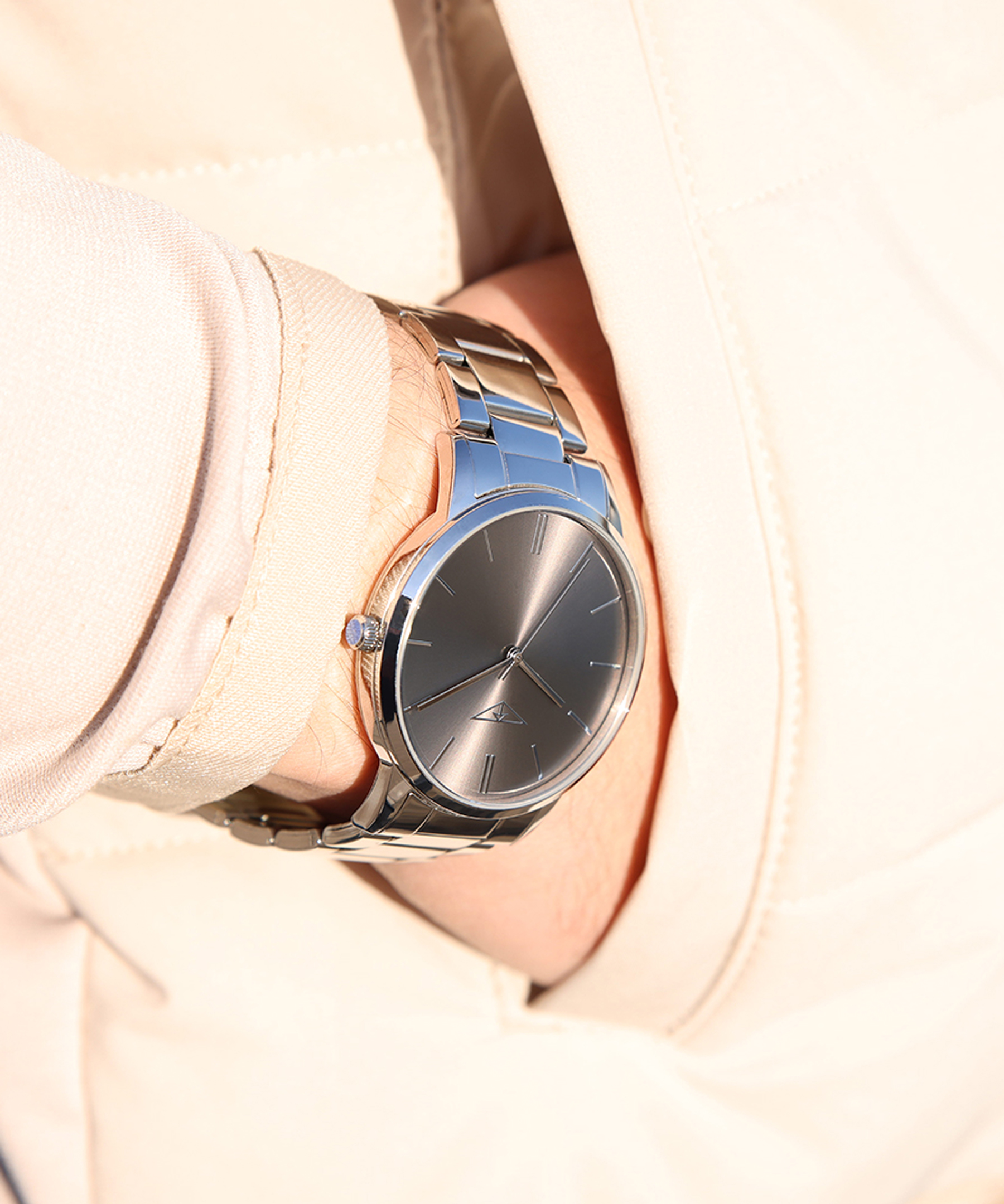 Серый циферблат с тонкими линиями и минималистичным дизайном подчёркивает элегантность модели. Отсутствие лишних деталей и чёткие формы создают строгий и лаконичный вид.