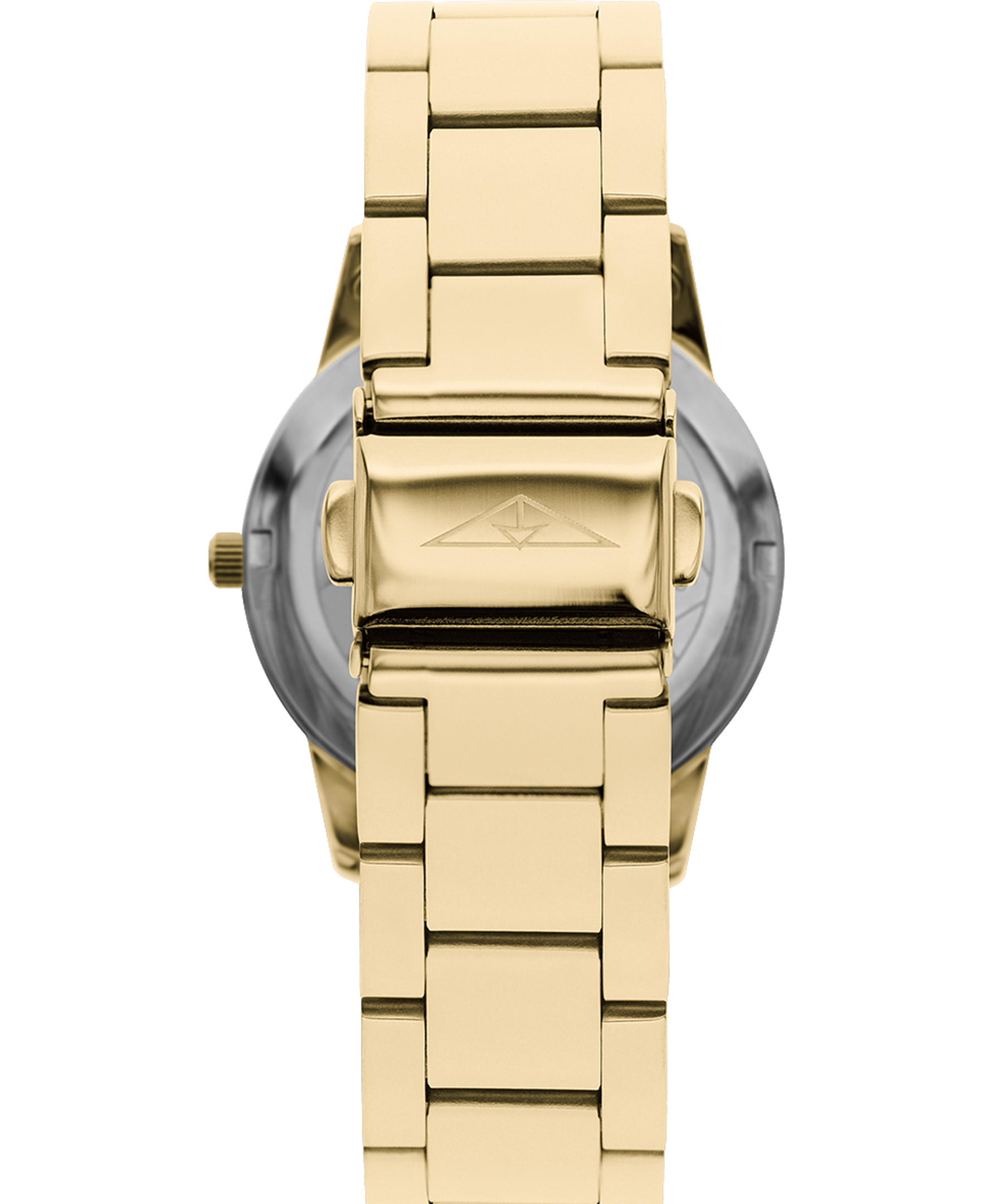 Корпус и браслет изготовлены из нержавеющей стали и покрыты роскошным покрытием Gold Tone, что придает часам изысканный блеск. Диаметр корпуса – 34 мм, идеально подходит для изящного женского запястья. Складная клипса обеспечивает комфортный и надежный крепеж.