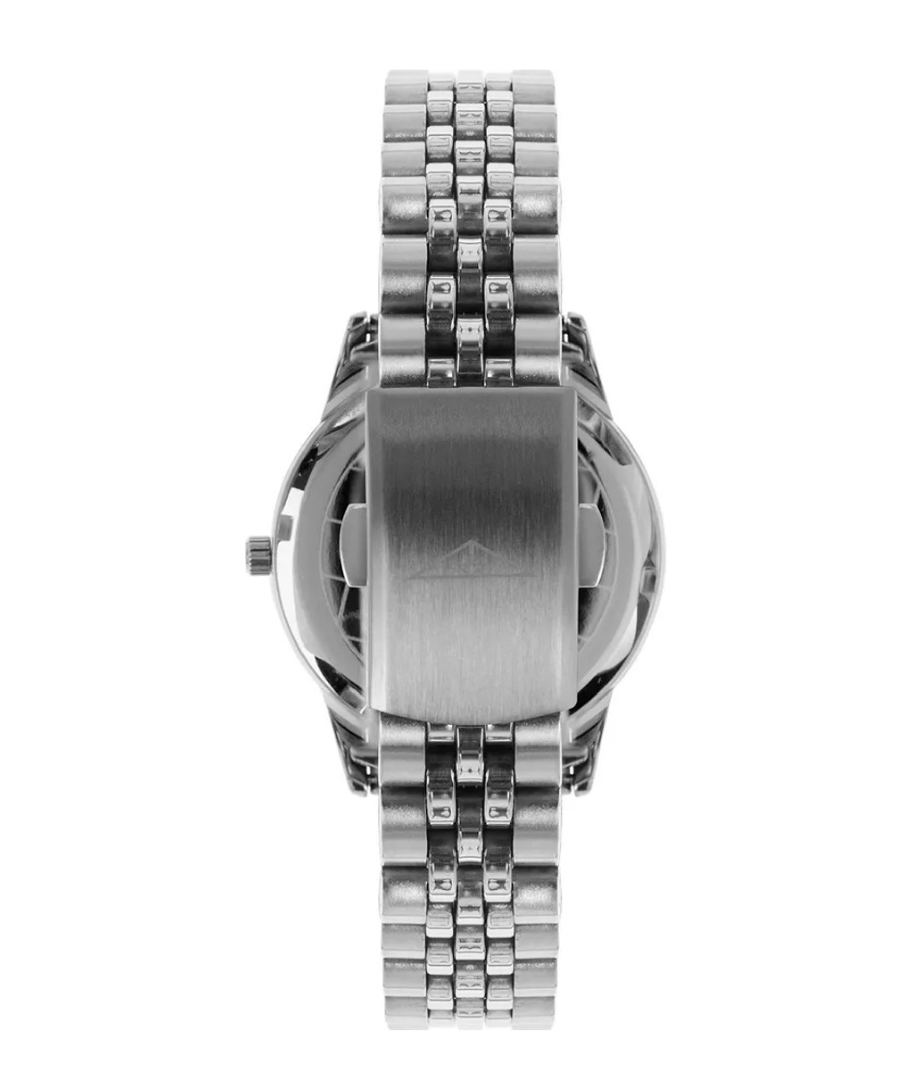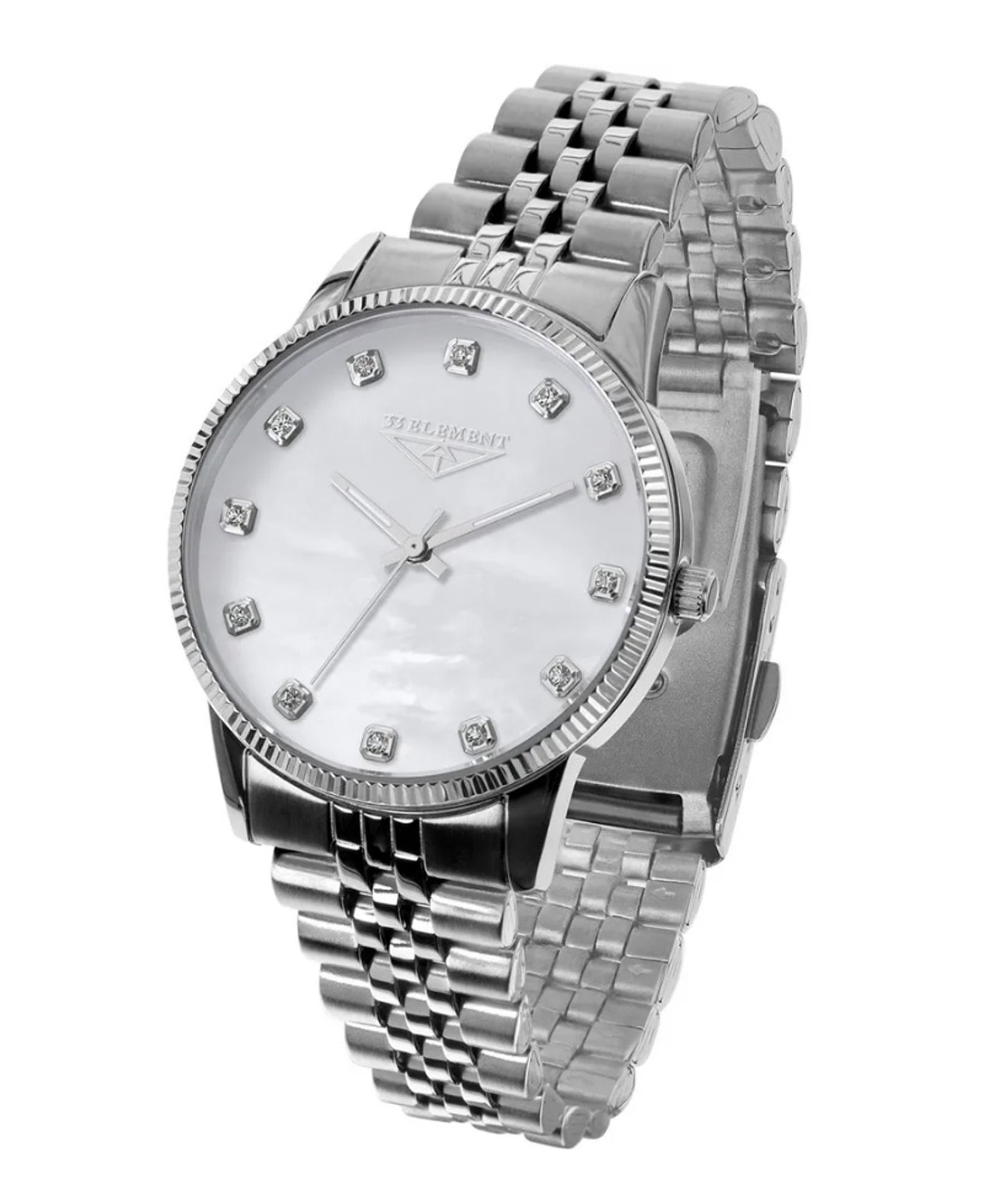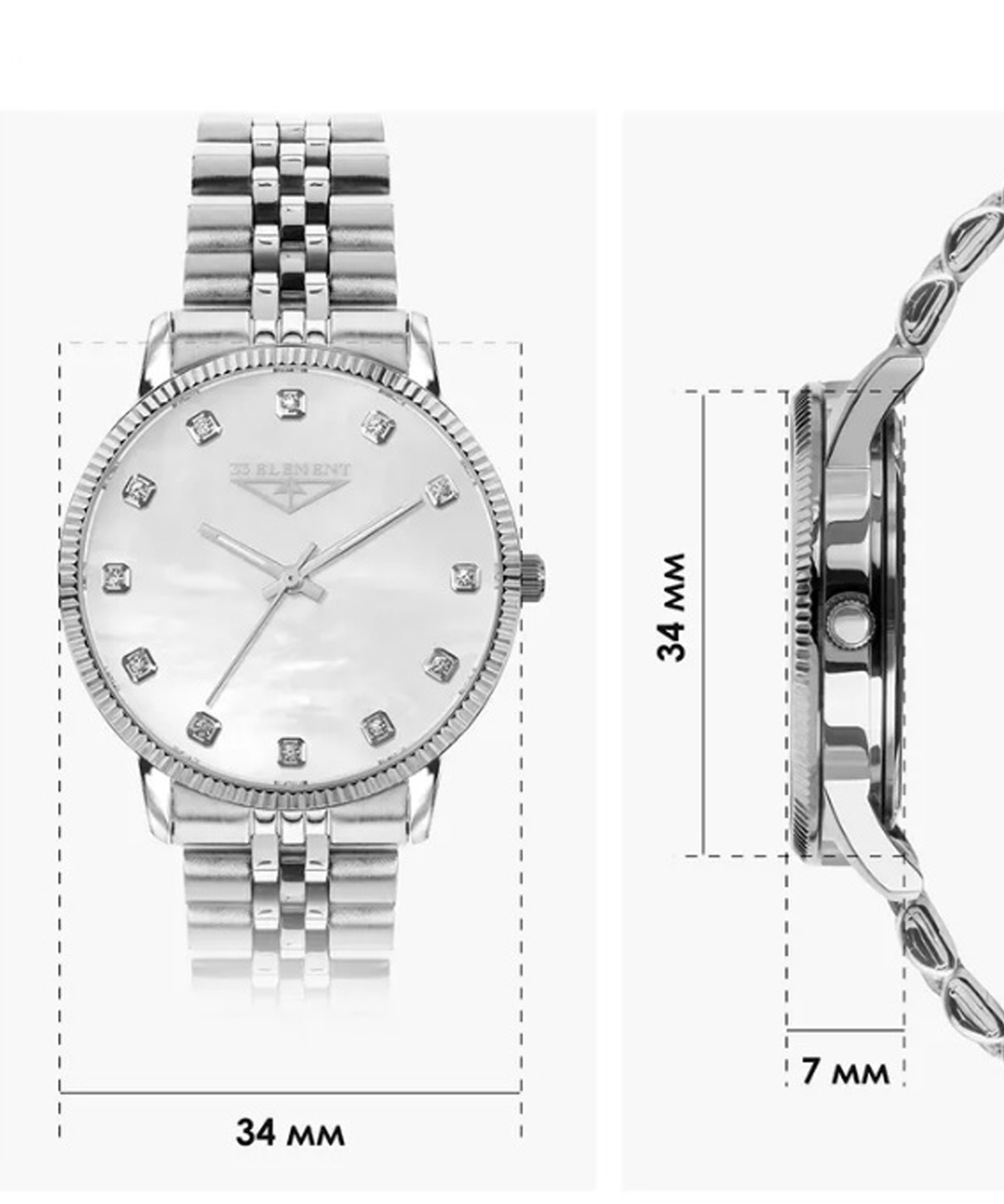 Стальной корпус диаметром 34 мм плавно переходит в металлический браслет, формируя изящный, сбалансированный силуэт. Инкрустация циферблата кристаллами придает изделию нежный блеск и подчеркивает женственность.