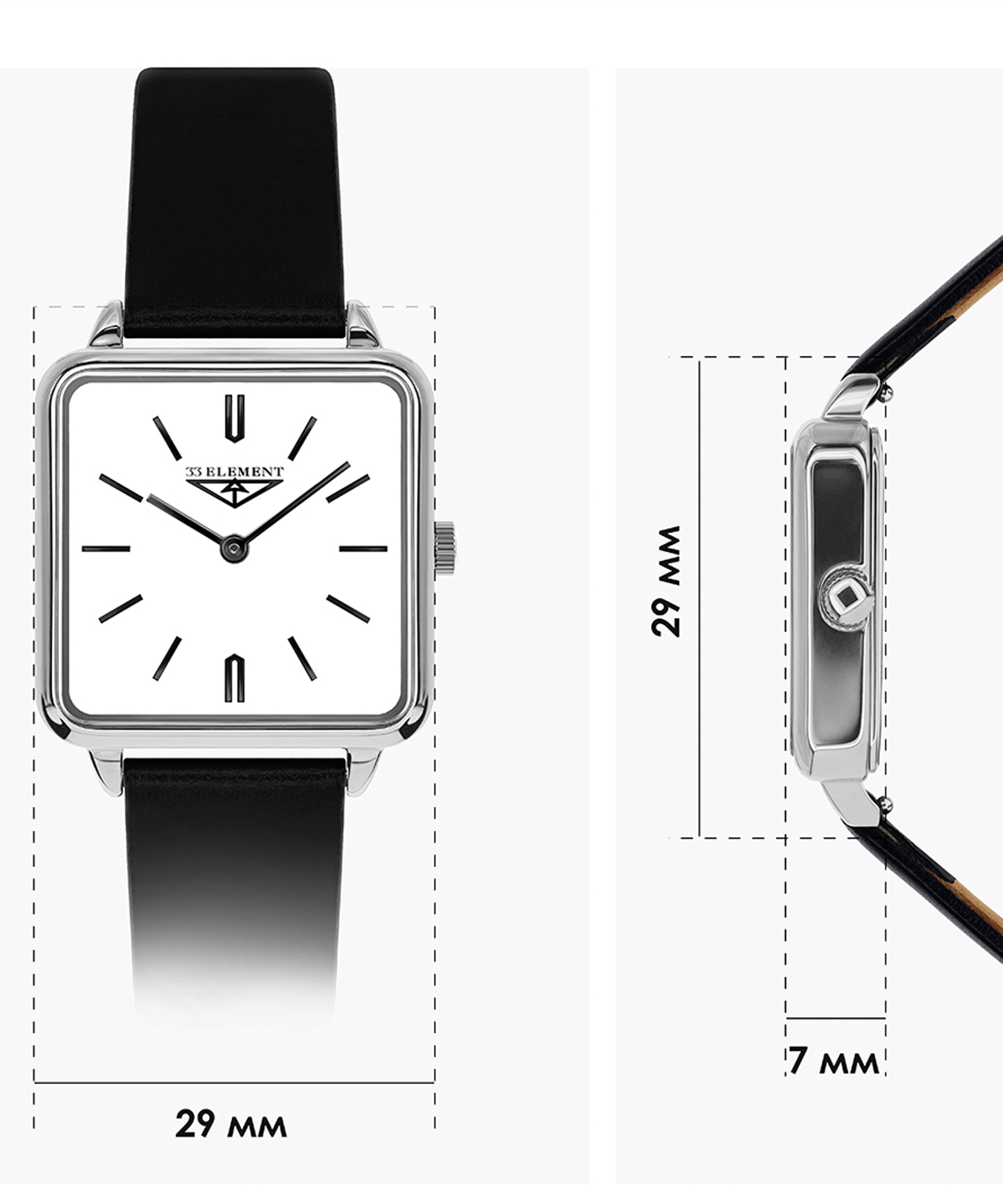 Квадратный стальной корпус размером 29 х 29 мм и толщиной всего 7 мм придает часам лаконичный, но одновременно изысканный вид. Циферблат защищен сапфировым стеклом, которое устойчиво к царапинам и сохраняет прозрачность даже после длительного использования. Особый шарм добавляет ремешок из натуральной кожи, который подходит к любому стилю — от классики до casual. Благодаря водозащите 3 ATM, часы не боятся случайного контакта с водой, дождя или брызг.