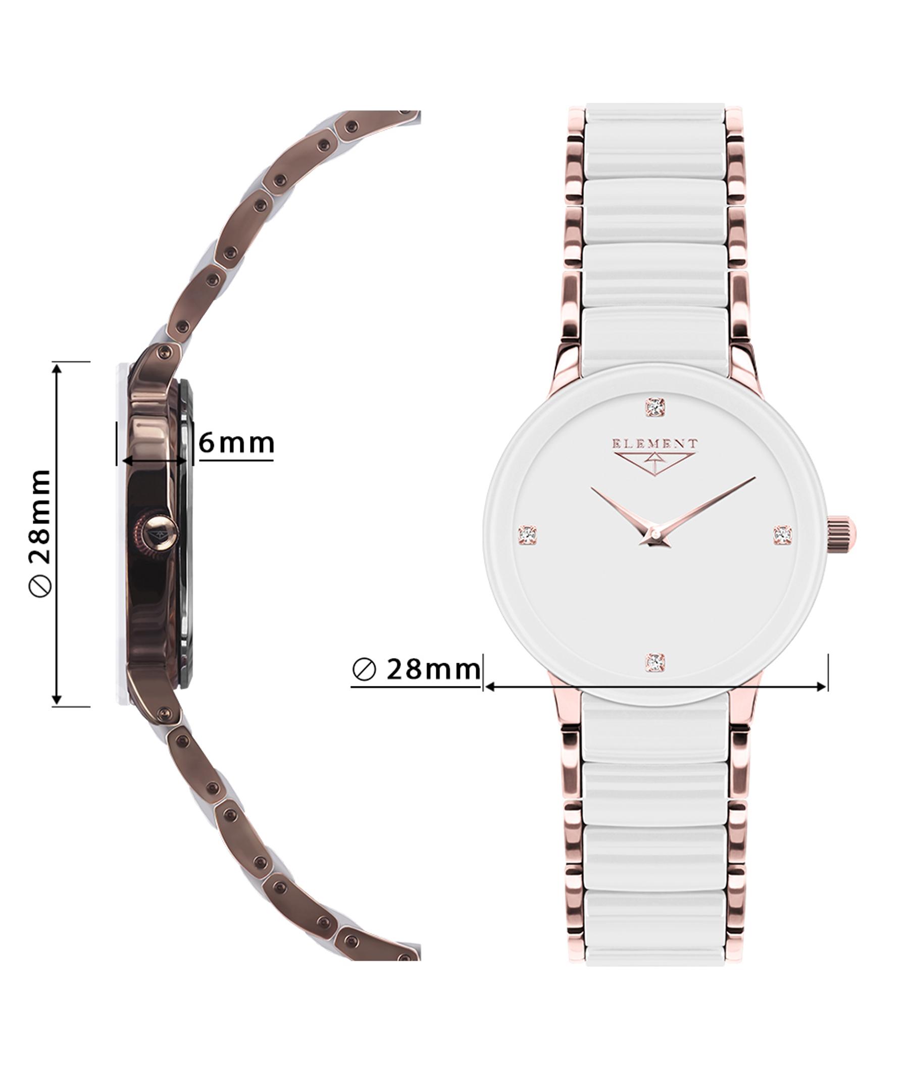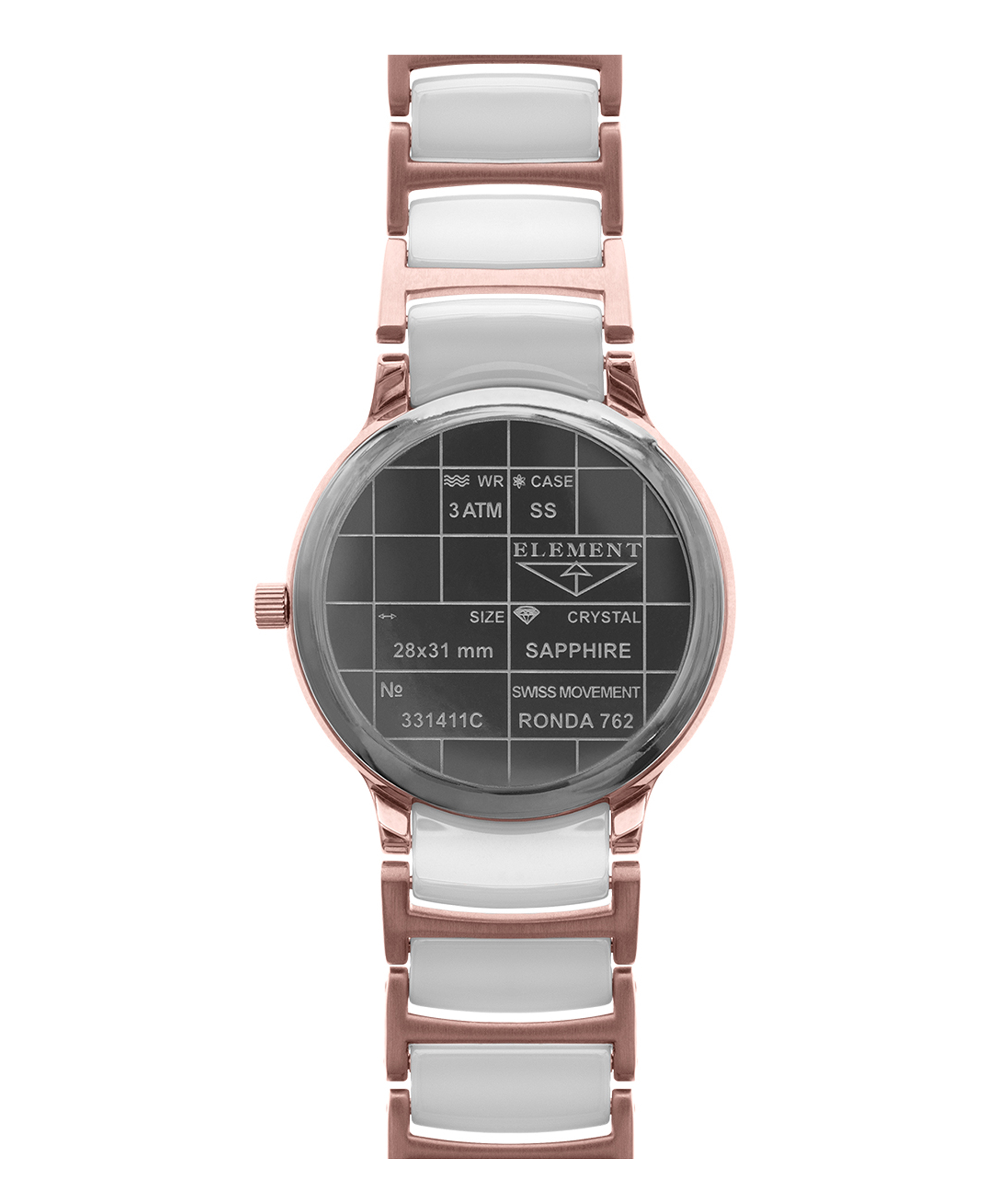 Классические женские часы 33 Element с надежным швейцарским механизмом Ronda. Корпус изготовлен из высококачественной нержавеющей стали с с покрытием IP белого цвета. Диаметр корпуса 28 мм. На циферблате белого цвета с с золотистыми стрелками в качестве индексов сияют кристаллы Сваровски. Стойкое к царапинам и потертостям сапфировое стекло придает особый блеск и мерцание. Стальной браслет цвета rose gold с белыми керамическими вставками элегантно продолжает золотисто-белую гамму, сочетая эстетику и комфорт. Легкие, качественные и очень привлекательные дизайнерские часы украсят руку самой взыскательной женщины.