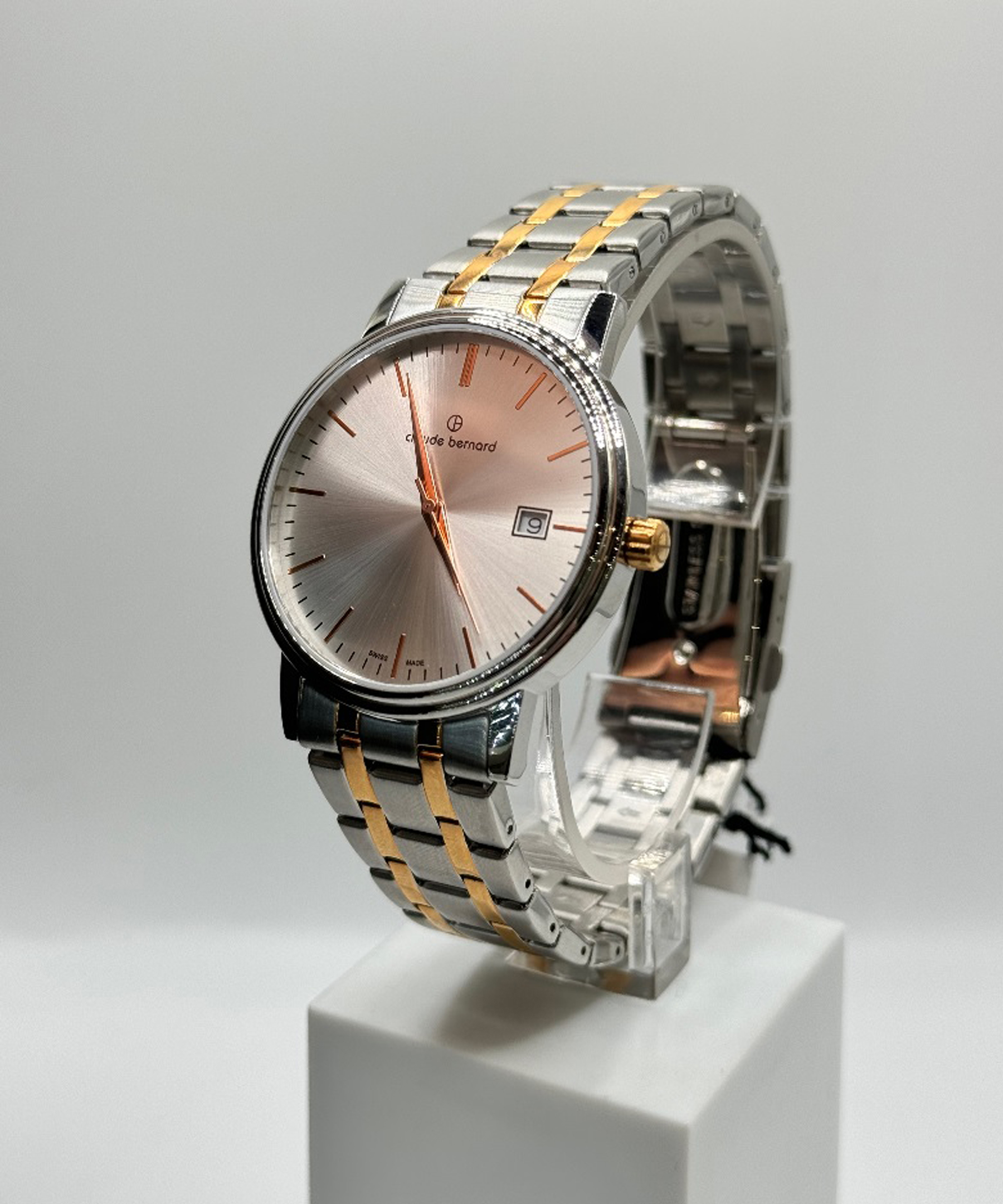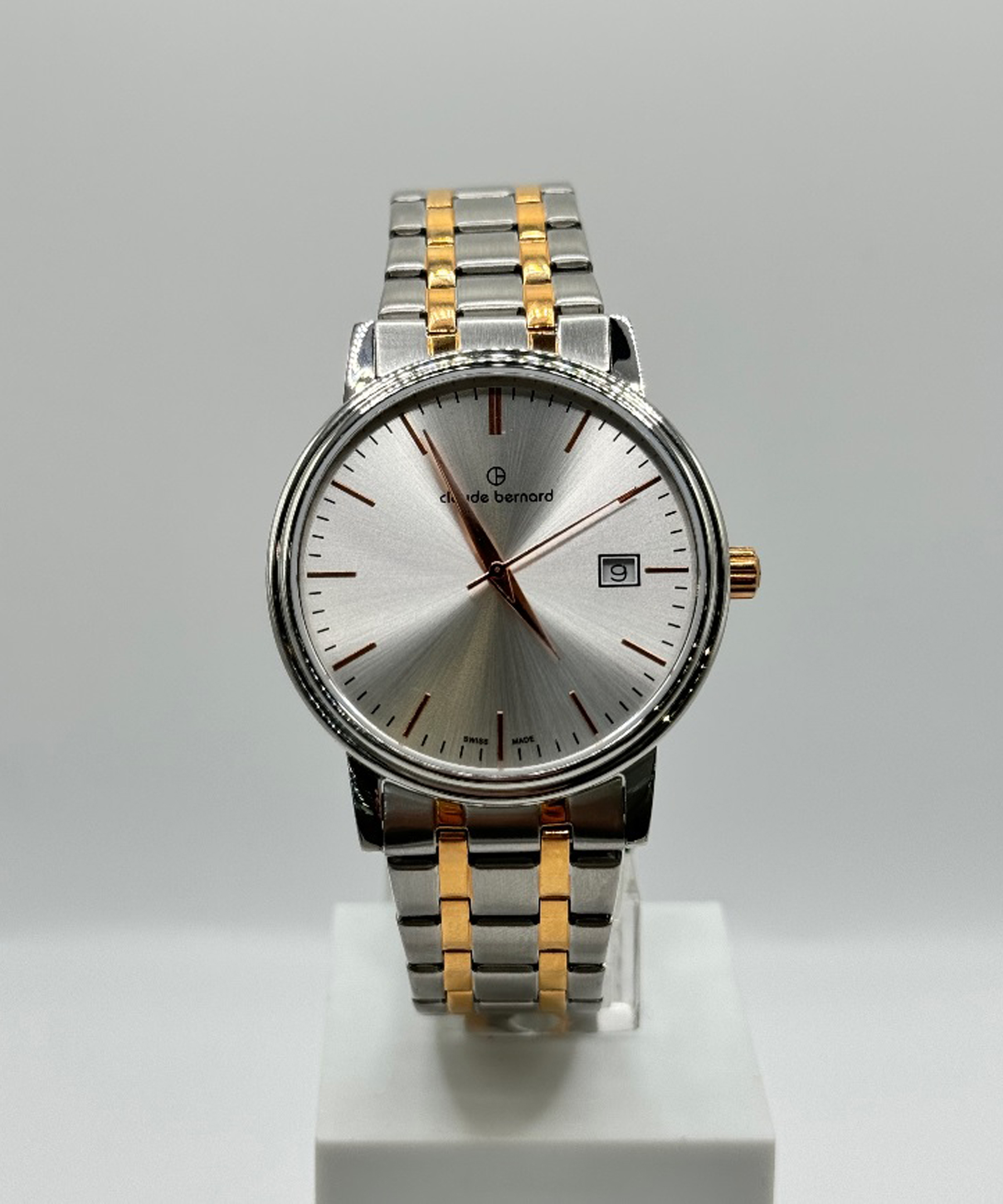Класичний чоловічий годинник відомого швейцарського бренду Claude Bernard з колекції Classic оснащений високоточним кварцовим механізмом Ronda 515. Корпус виготовлений з нержавіючої сталі з високими антикорозійними властивостями. На сріблястому аналоговому циферблаті елегантні золотисті індекси часу і календар. Сталевий браслет зібраний із ланок двох кольорів: сріблястого та кольору рожевого золота. Лаконічність форм у поєднанні з високою якістю та елегантним дизайном створюють універсальнийсть образу, який буде доречний з будь-яким одягом та у будь-який час. Рекомендуються всім шанувальникам вічної класики!