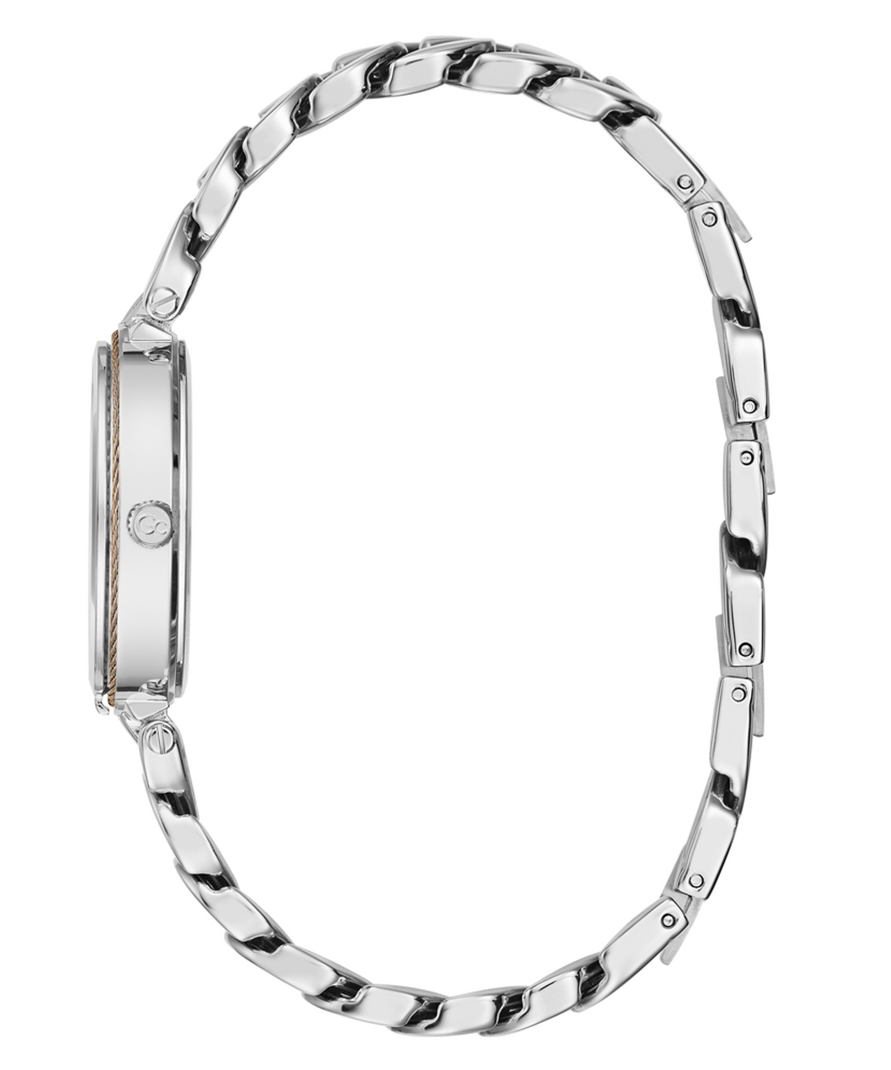 Изготовленные из стали высокого качества, эти часы сочетают в себе современность и классическую элегантность. Белоснежный перламутровый циферблат с золотистыми идексами времени и римскими цифрами прекрасно гармонирует с декоративным жгутом, характерным для бренда, что придает ему особую утонченность. Сапфировое стекло повышенной прочности с антибликовым покрытием обеспечивает надежную защиту механизма от повреждений, сохраняя его безупречный вид даже при условиях ежедневного использования. Оригинально сплетенные звенья браслета придают особый шарм, превращая часы в стильное украшение.