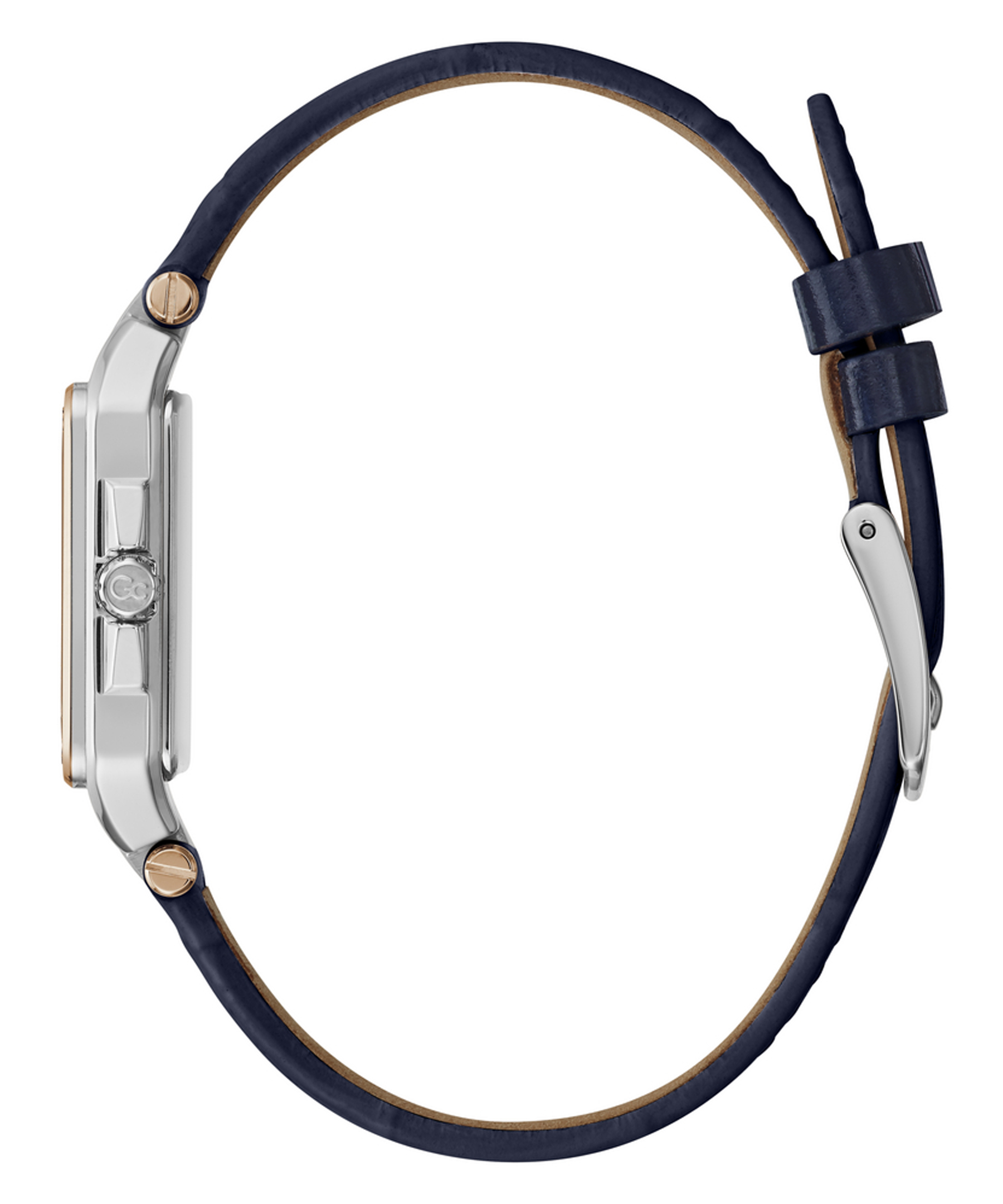 Стильний жіночий годинник Gc прямокутної форми з багатофункціональним швейцарським механізмом із високоякісної сталі. Використання сріблястих і золотих тонів, ніжних кристалів Сваровскі та імітація заклепок по кутах безелю створюють зворушливе поєднання яскравих відчуттів та авангардного дизайну. Гармонія синього яскравого циферблату з кольором рожевого золота, м'який шкіряний синій ремінець створюють відчуття ексклюзивності та елегантного шику. Швейцарська точність та італійський дизайн доповнюється високими технічними характеристиками.