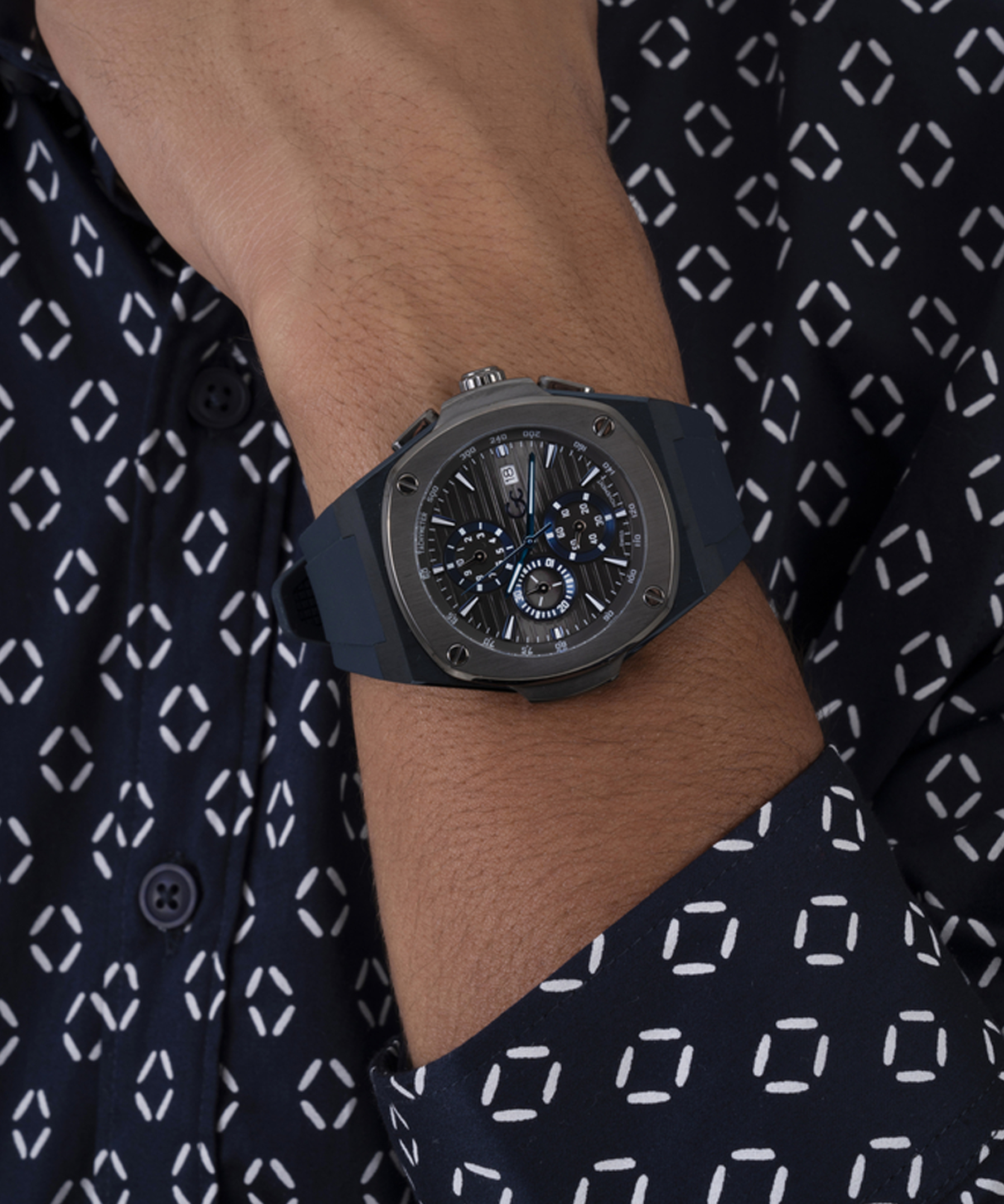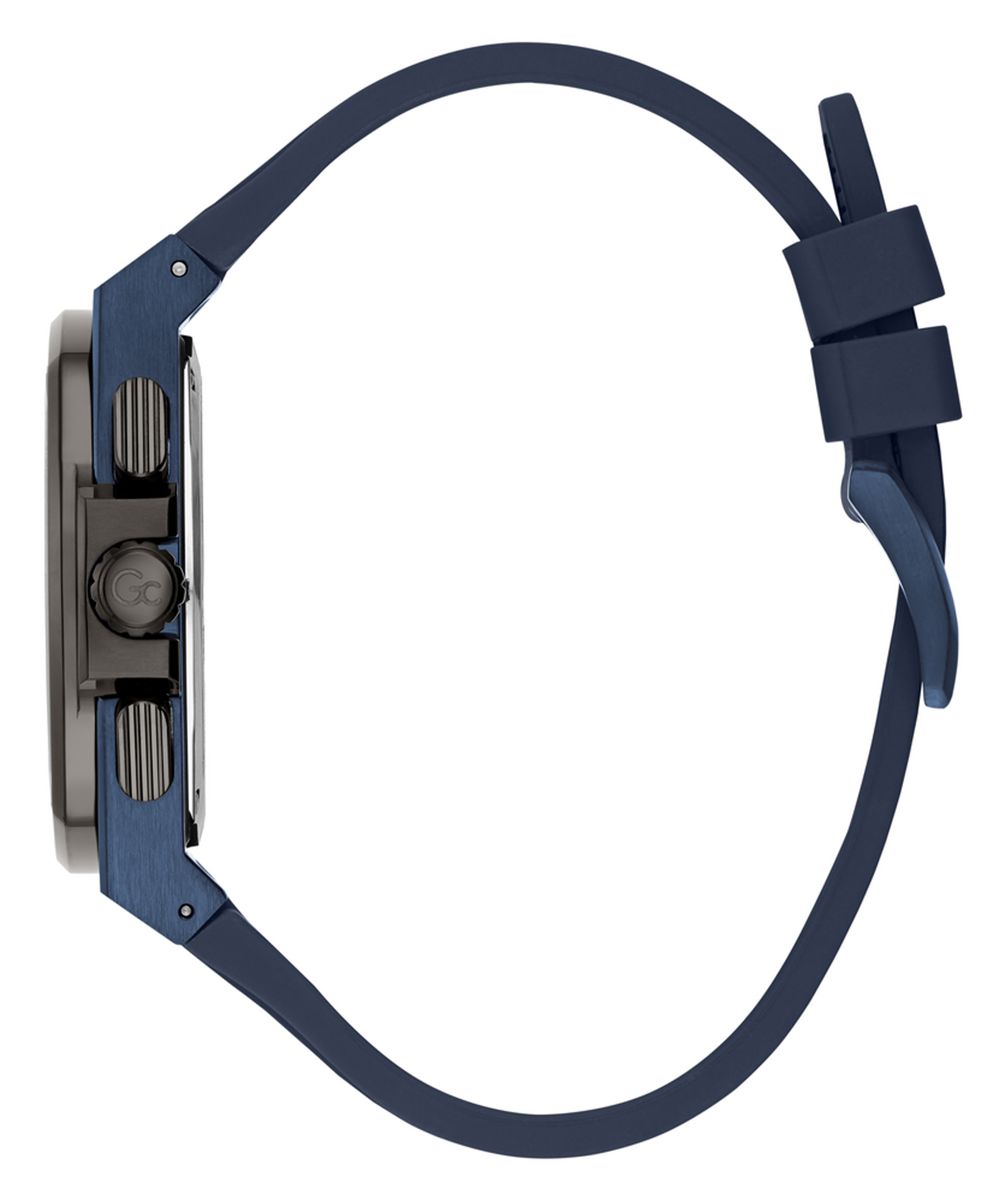 Многофункциональные мужские часы респектабельного швейцарского бренда GC с хронографом оснащены надежным механизмом, изготовлены из нержавеющей стали с частичным PVD покрытием Blue и Gray. На циферблате серого цвета с фактурным тиснением синие индикаторы даты и тахиметр. На сером карбоновом безеле декоративные болты, придающие аксессуару авангардный вид. Кнопки включения счетчиков и заводная головка подчеркивают рельефную, многогранную геометрию дизайна, усиленную сочетанием серого, синего, голубого и белых вкраплений. Все элементы на циферблате имеют люминесцентное покрытие, “загорающееся” в ночное время. Качественное сапфировое стекло, синий силиконовый ремешок, который крепится к металлическому корпусу синего цвета, завершают авангардный образ дорогого аксессуара, который рекомендуется стильным, смелым, деловым мужчинам.