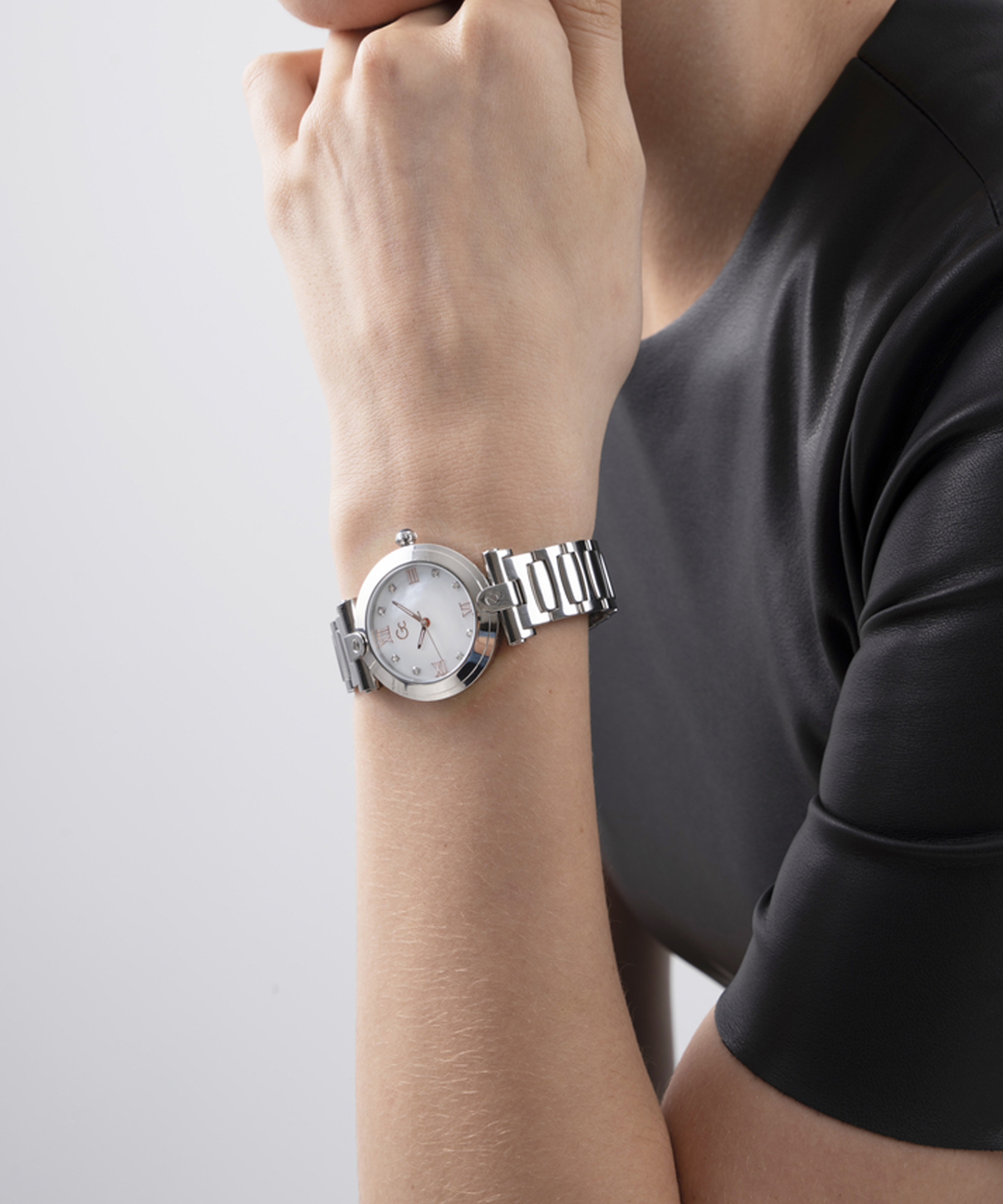 Стальной корпус и браслет создают стильный и прочный дизайн, а диаметр корпуса 34 мм придает часам утонченность. Римские цифры и мерцающие кристаллы на перламутровом циферблате придают ему роскошь и шарм.