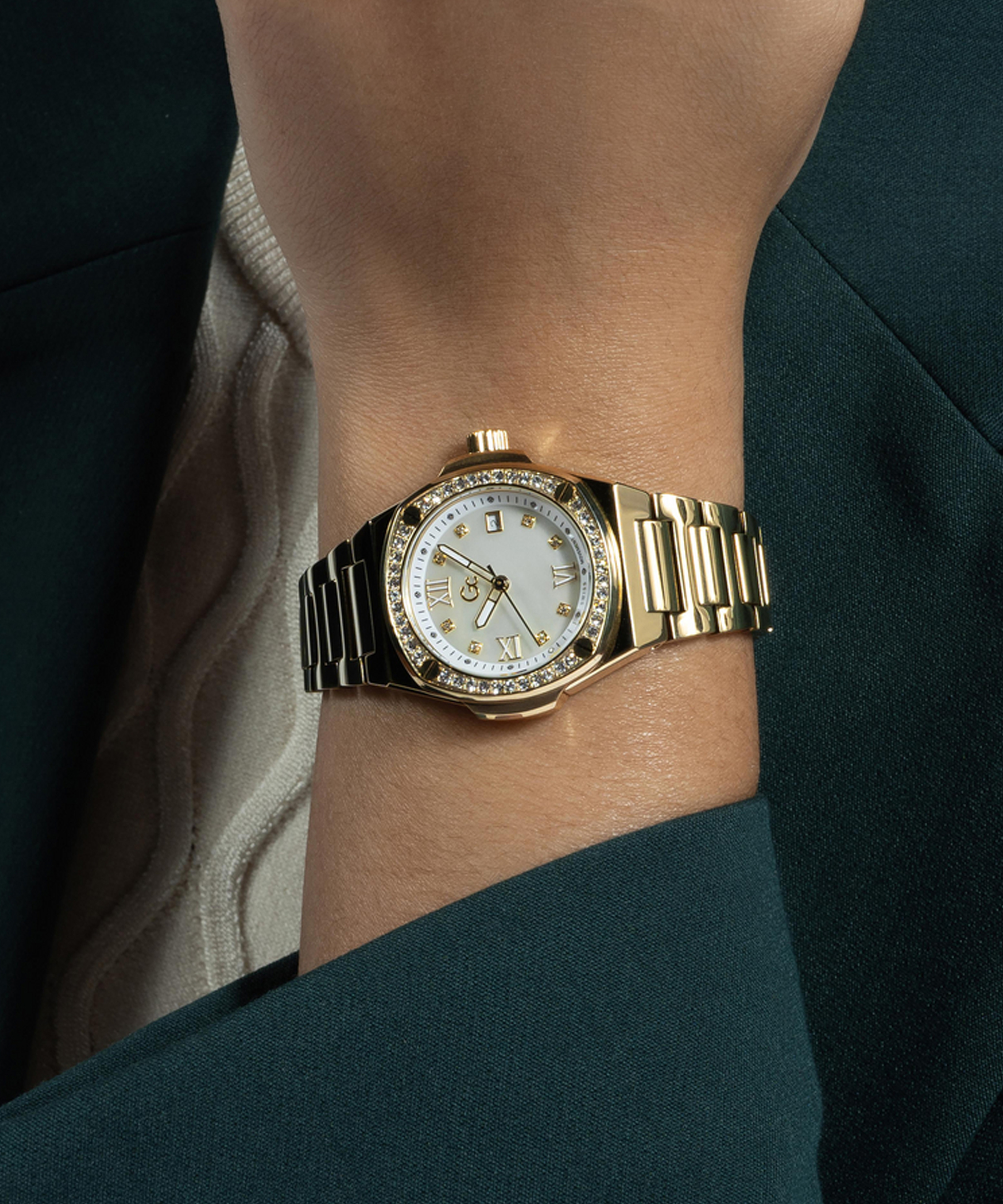 Кварцевый механизм гарантирует бесперебойную работу, а корпус и браслет, выполненные из стали с золотистым покрытием, придают часам роскошный вид. Диаметр корпуса – 30 мм, что делает модель идеальной для женской руки. Безель, украшенный блестящими кристаллами, прекрасно сочетается с нежными кристалами, которые служат метками времени, придавая часам непревзойденную изысканность.