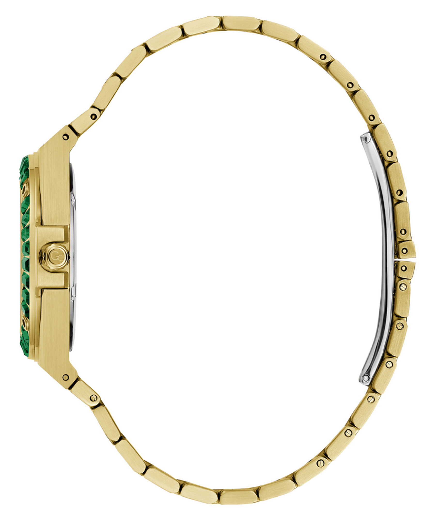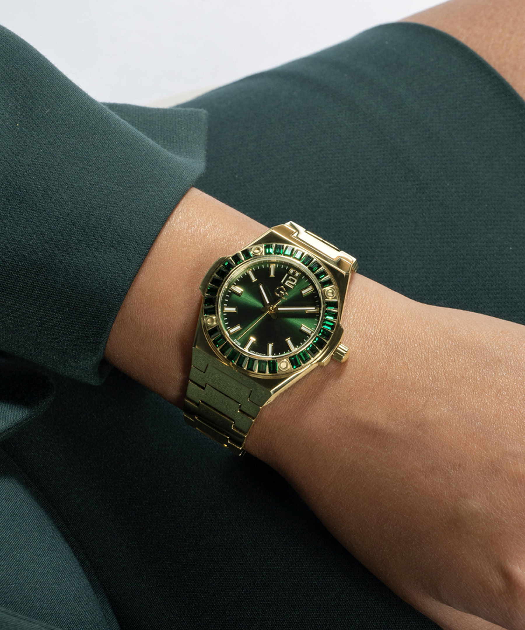 Кварцевый механизм гарантирует бесперебойную работу часов, а стальной корпус с золотистым напылением придает ему роскошь. Диаметр корпуса 34 мм идеально подходит для изящной женской руки. Браслет с надежной застежкой складной клипсой обеспечивает комфорт ношения, а безель, украшенный роскошными камнями-багетами, прекрасно гармонирует с зеленым цветом аналогового циферблата.